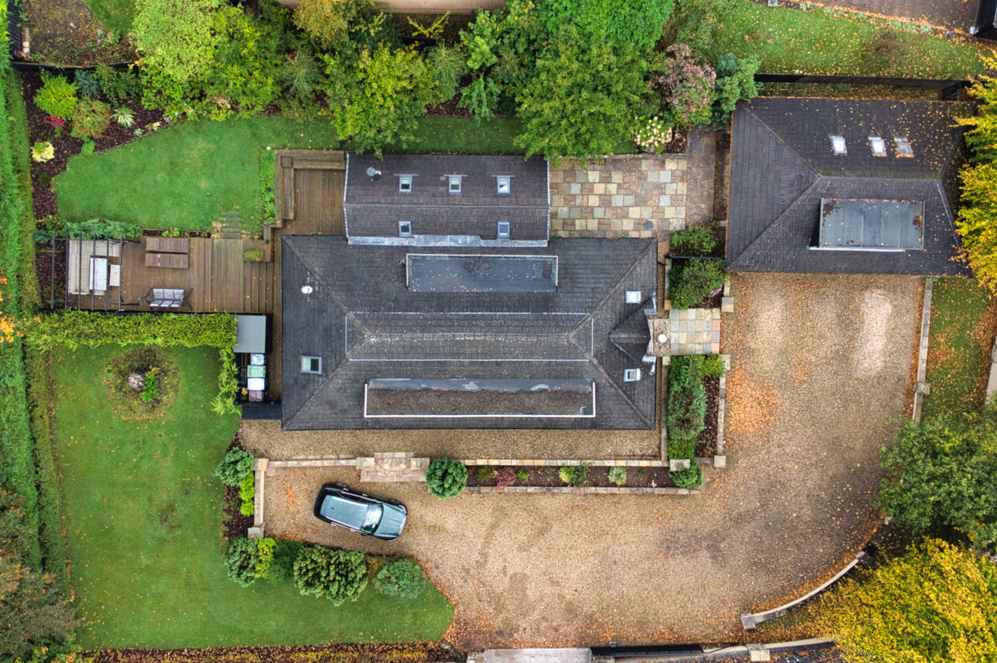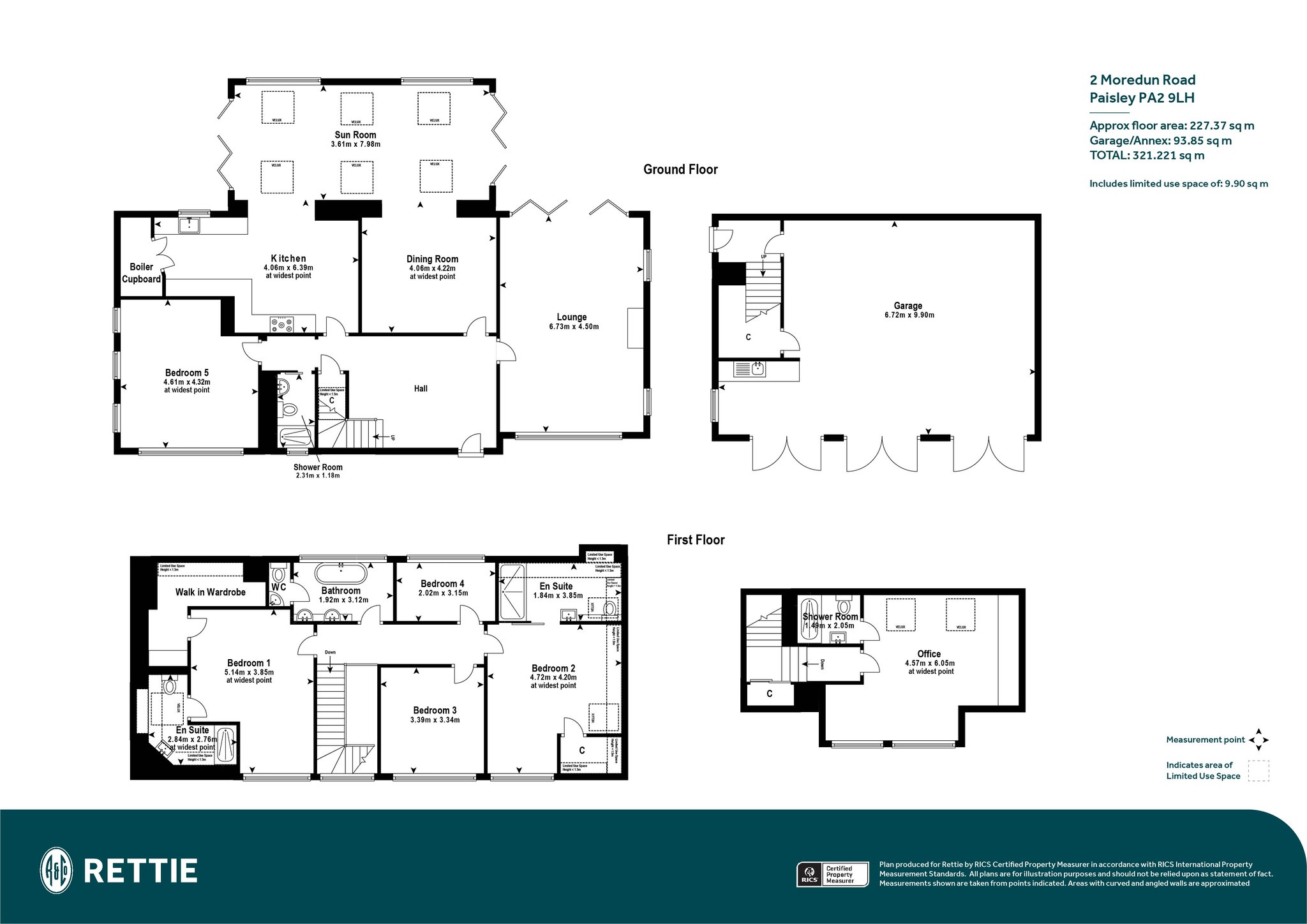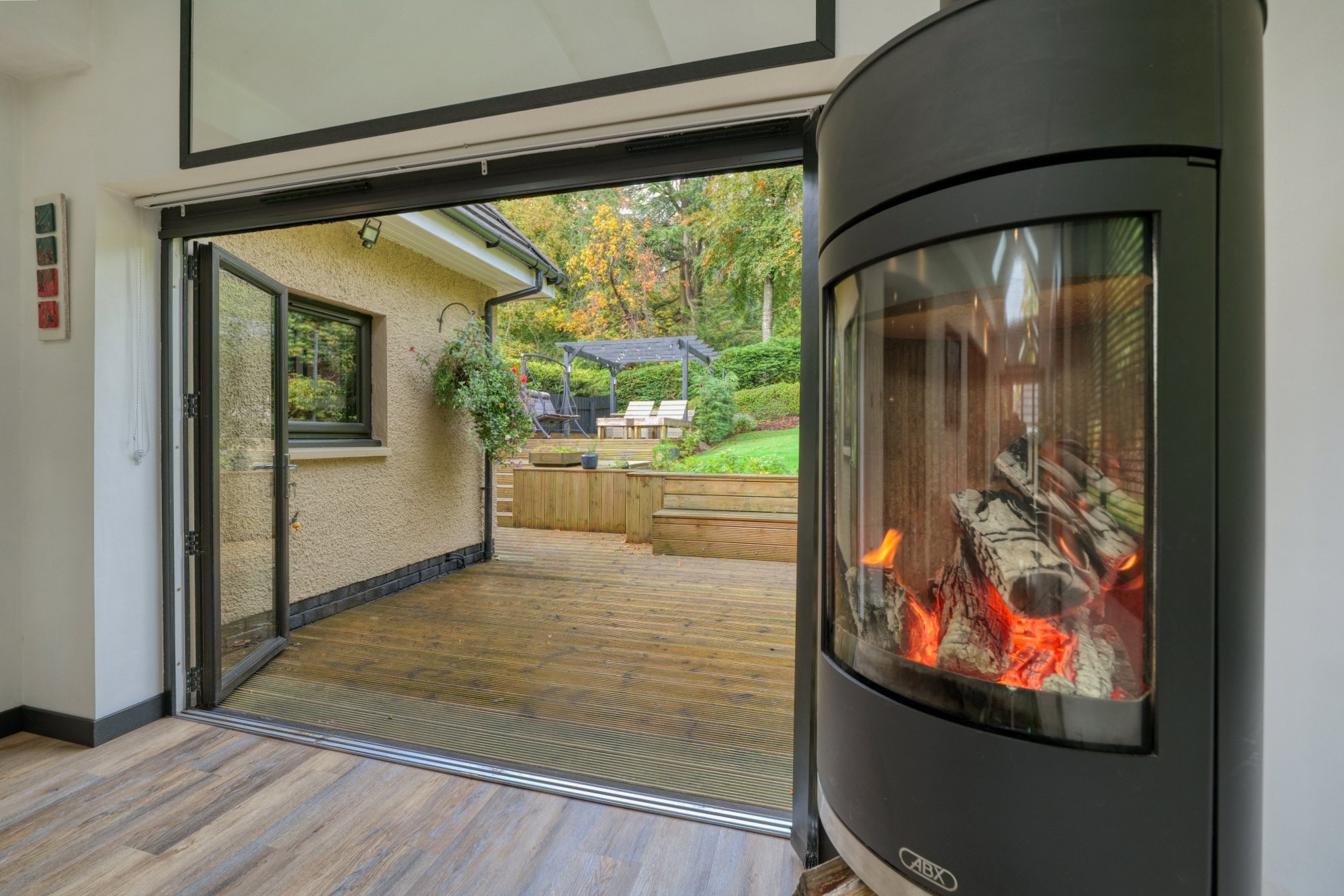 A particular feature of Moredun Road is the extensive and wonderful landscaped garden grounds. There are large lawn areas that surround the grounds with a patio are and large decked terrace, with external lighting. An electric gate to the front of this home leads to an extremely generous driveway and three car garage with a large store and separate studio area. A side door gives separate access to the studio with a shower room. There is underfloor heating in the garage with a gas supply installed, for further heating systems if one requires.