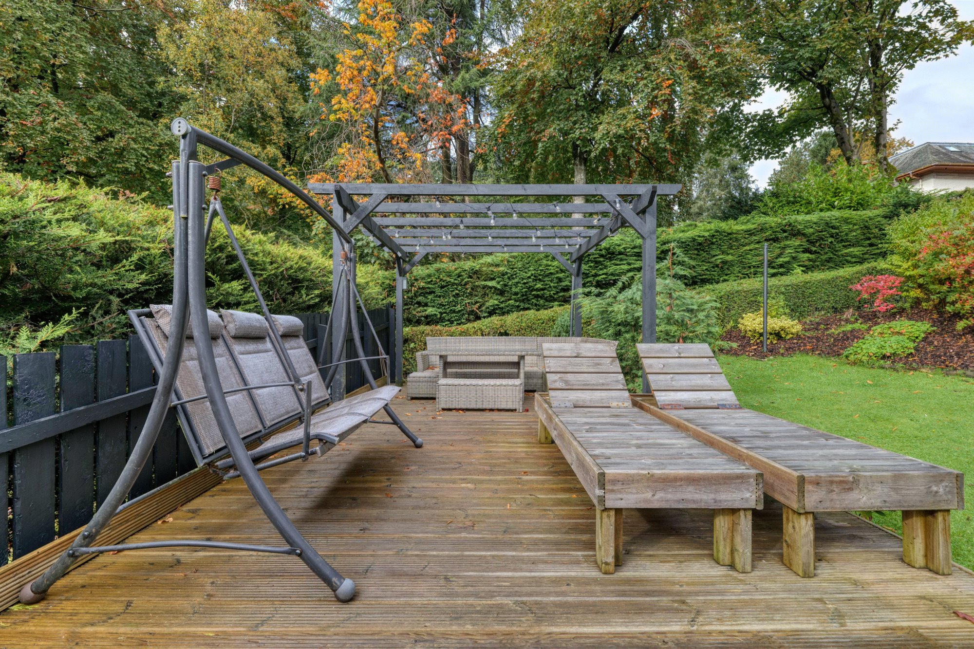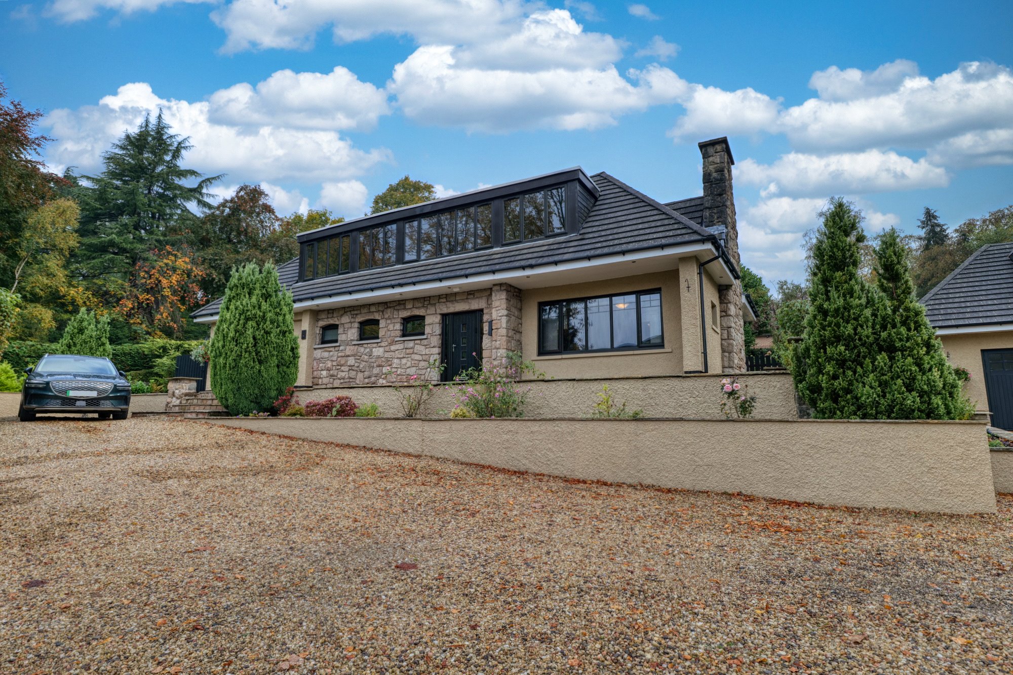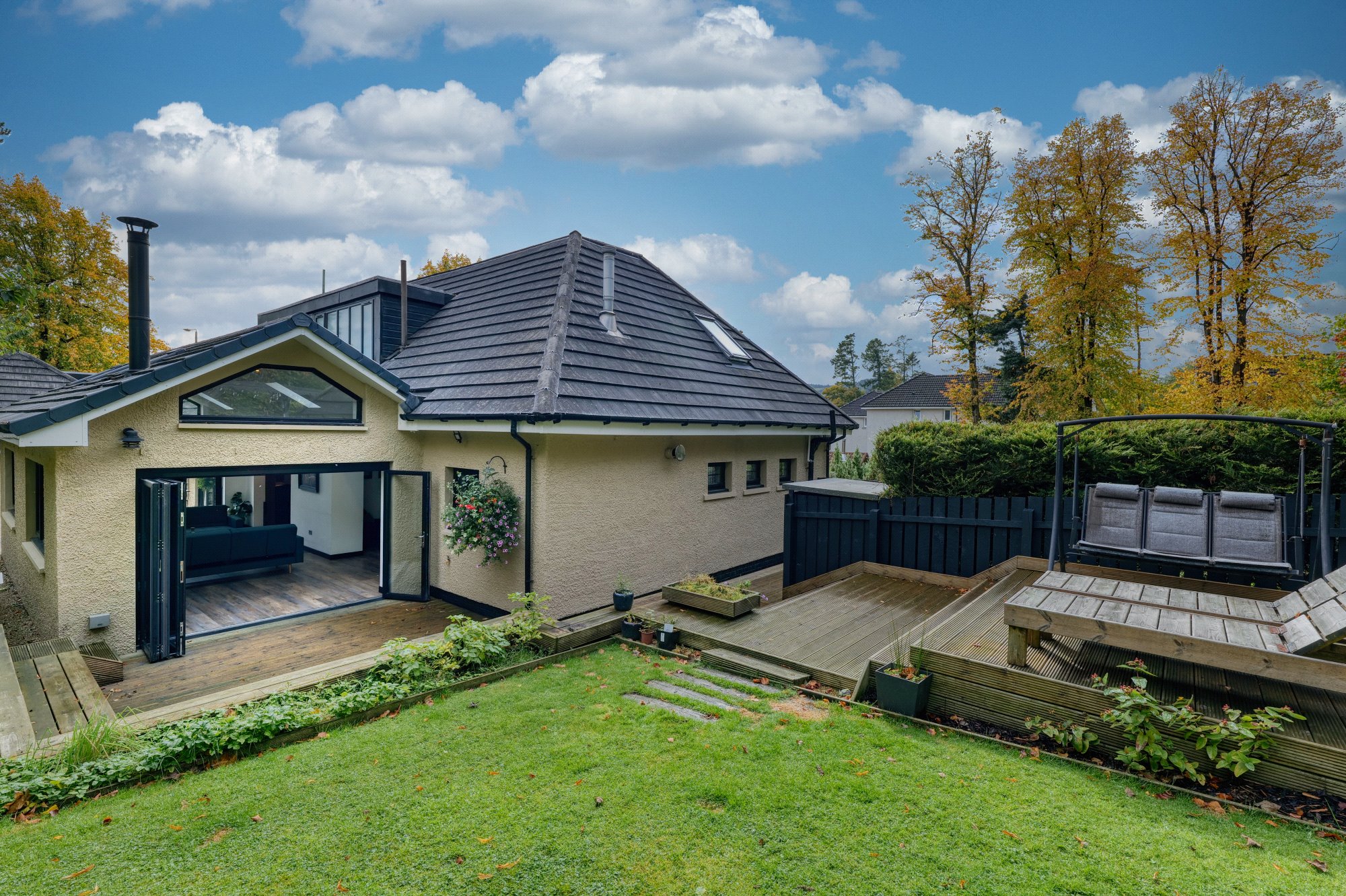 Sitting within a large corner plot the house sits slightly elevated within beautiful private grounds with open outlooks to Moredun Playing fields and the Gleniffer Braes beyond.