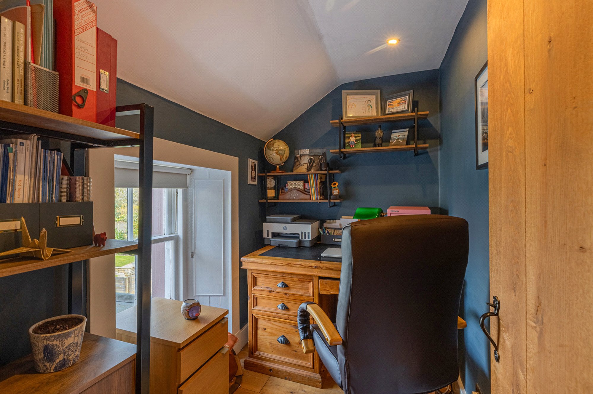 On the first floor, the upper landing leads to two well proportioned double bedrooms, both offering open views to the front of the home. Additionally, there is a home office or study, ideal for remote work or additional storage. The family bathroom, featuring a shower over the bath, completes the internal layout.