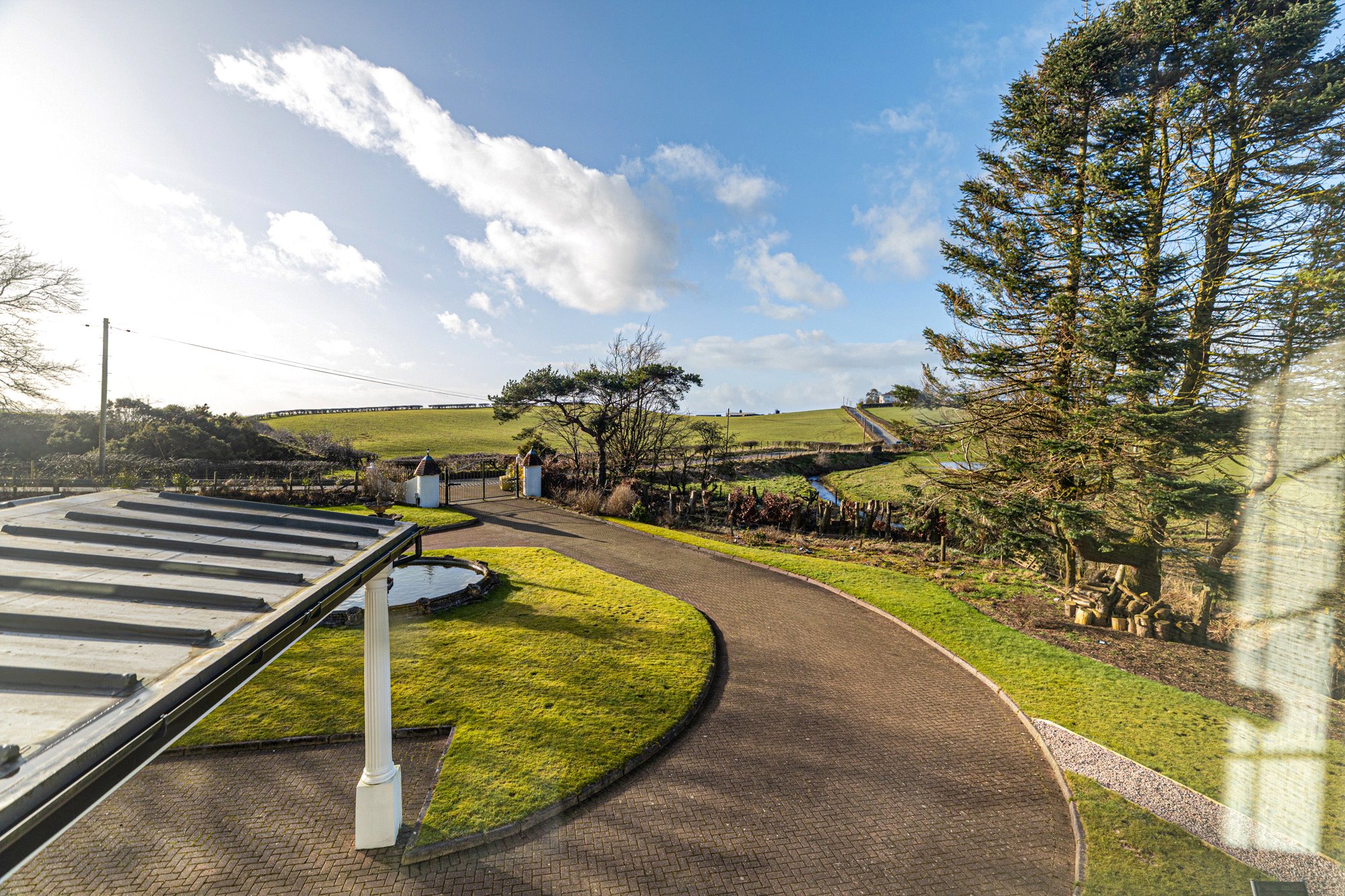 Additional features of the home include high-spec finishes, tasteful styling, contemporary bathrooms and en-suites, oil-fired heating, replacement double glazing, a security alarm system, and electric gates for added security. The surrounding gardens offer a peaceful and scenic environment, with open views of the countryside beyond.
