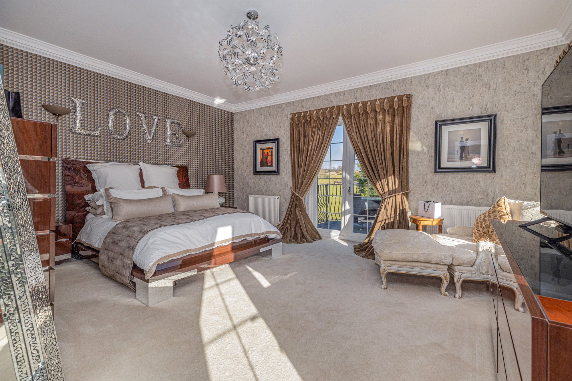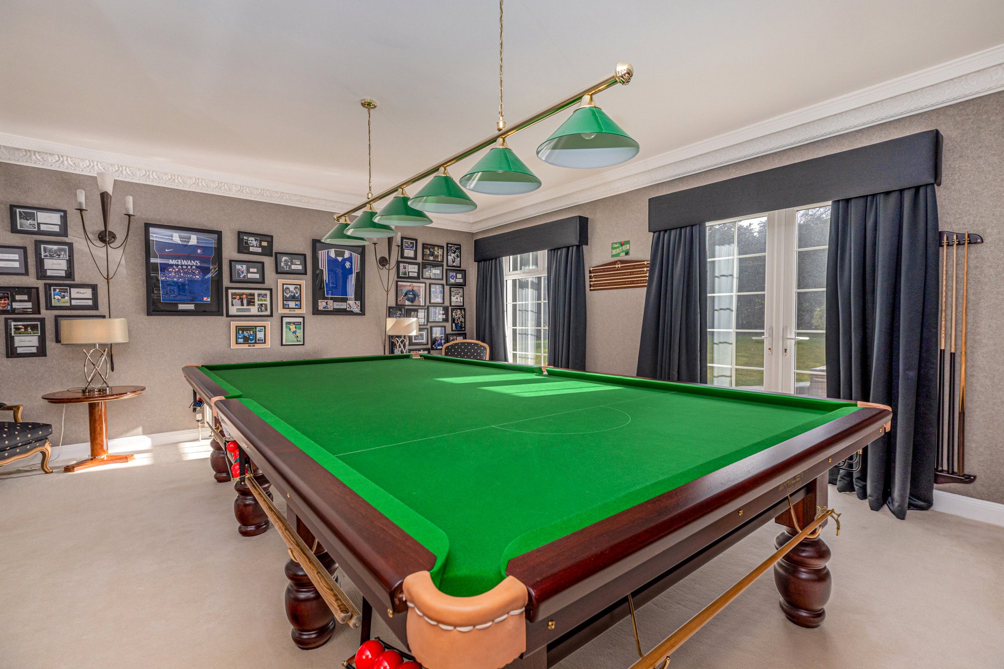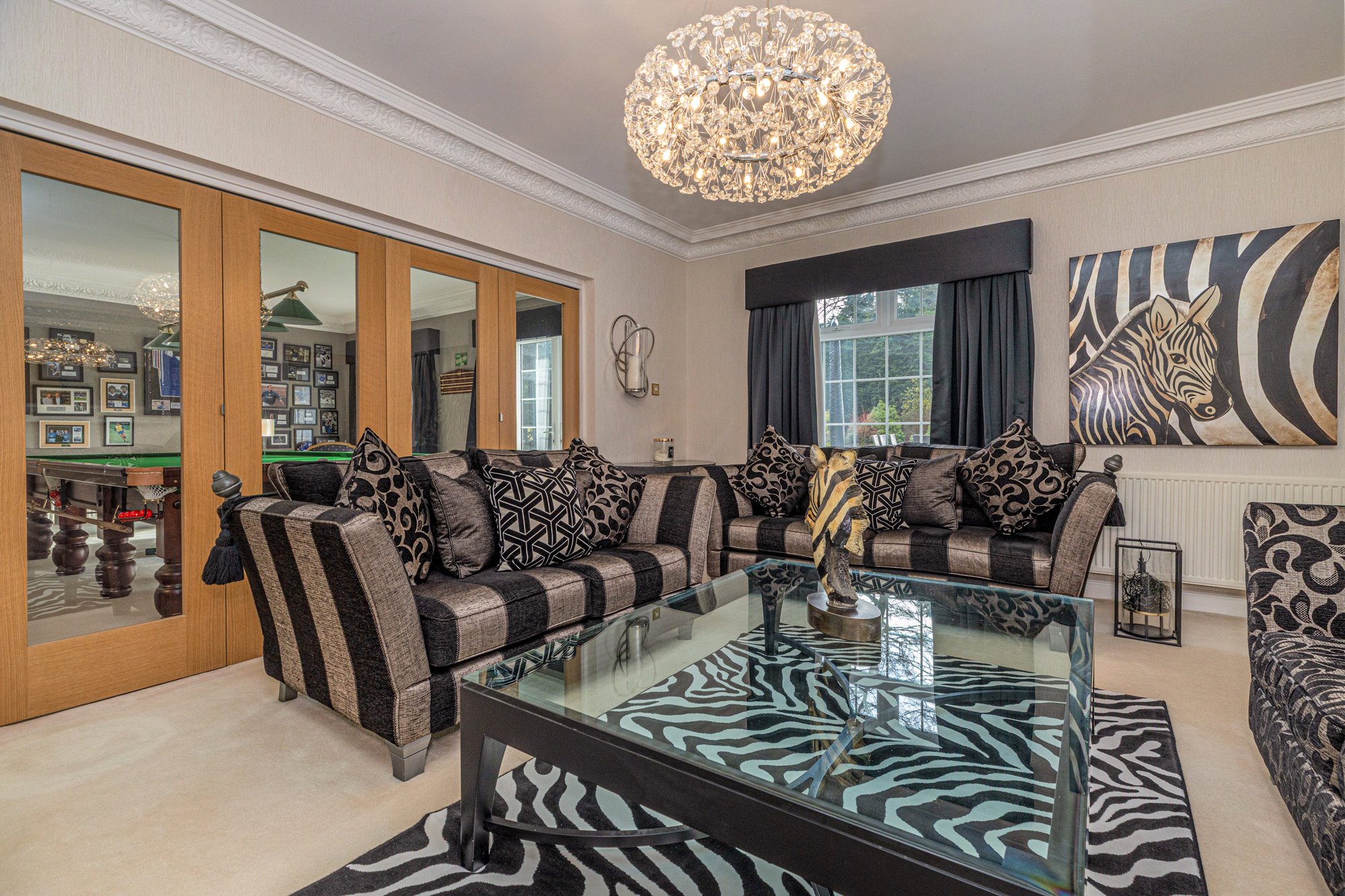 Accessed through electric gates, an impressive sweeping circular driveway leads to a covered entrance and a triple detached garage. The accommodation includes a grand reception hallway, a formal lounge with a feature fireplace and access to the rear gardens, a cozy family room, and a spacious dining-sized kitchen with integrated units and high-quality worktops. There is also a WC, a utility/laundry room, and a generous living room with internal glass doors leading to a snooker/entertainment room.