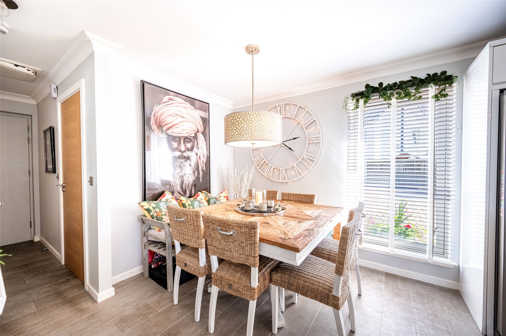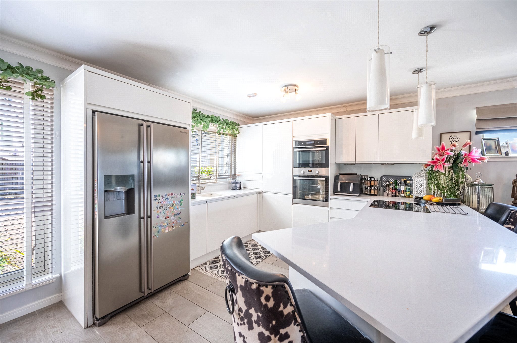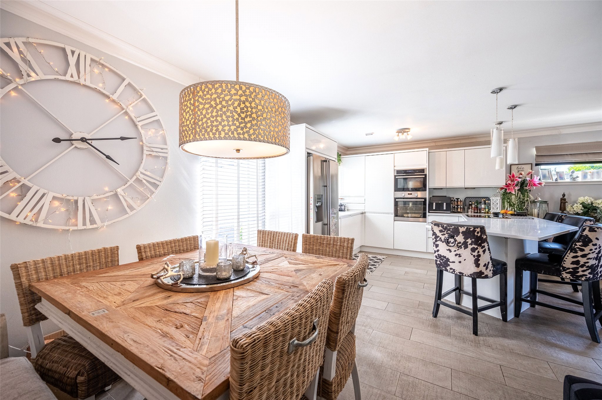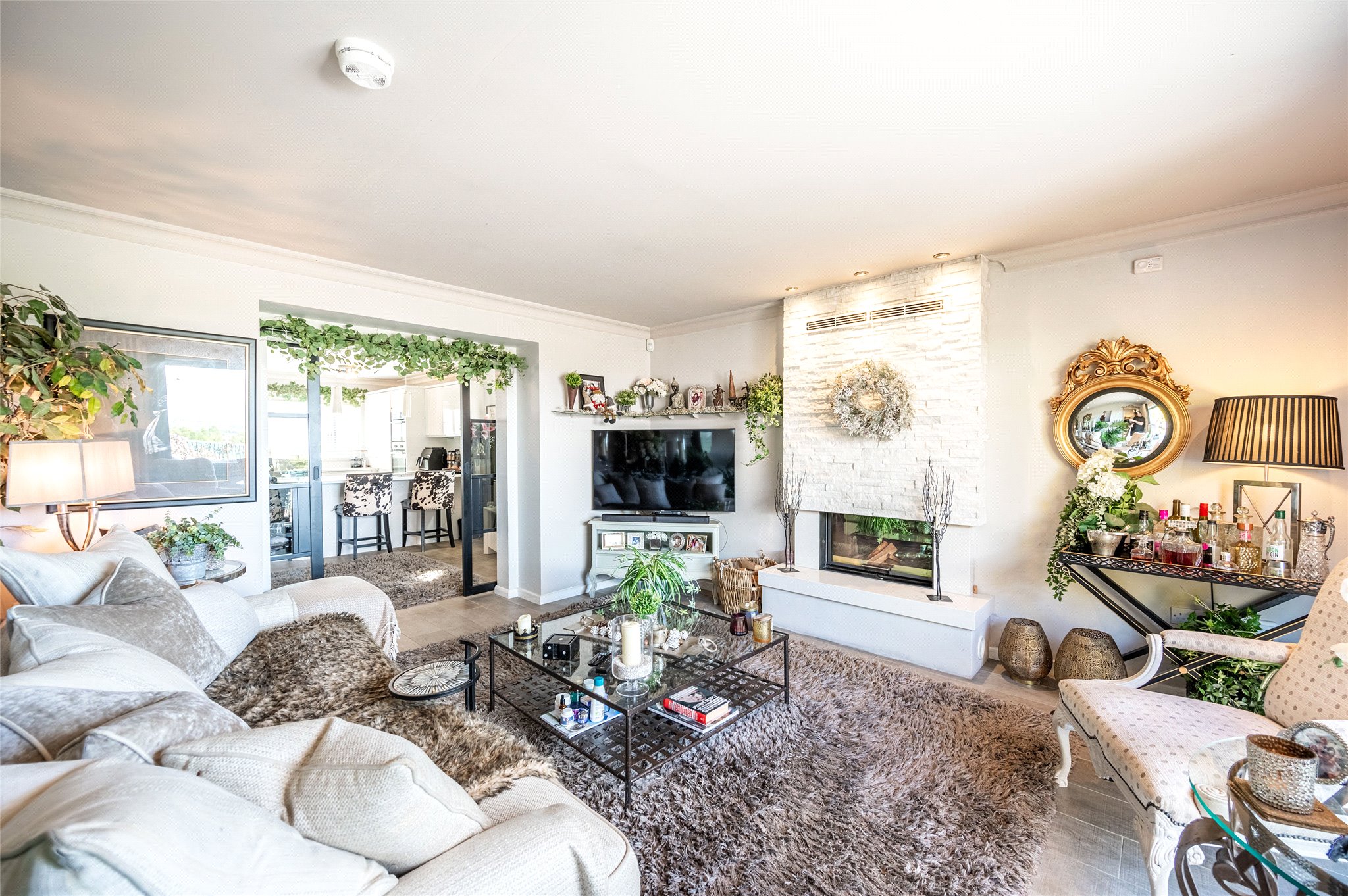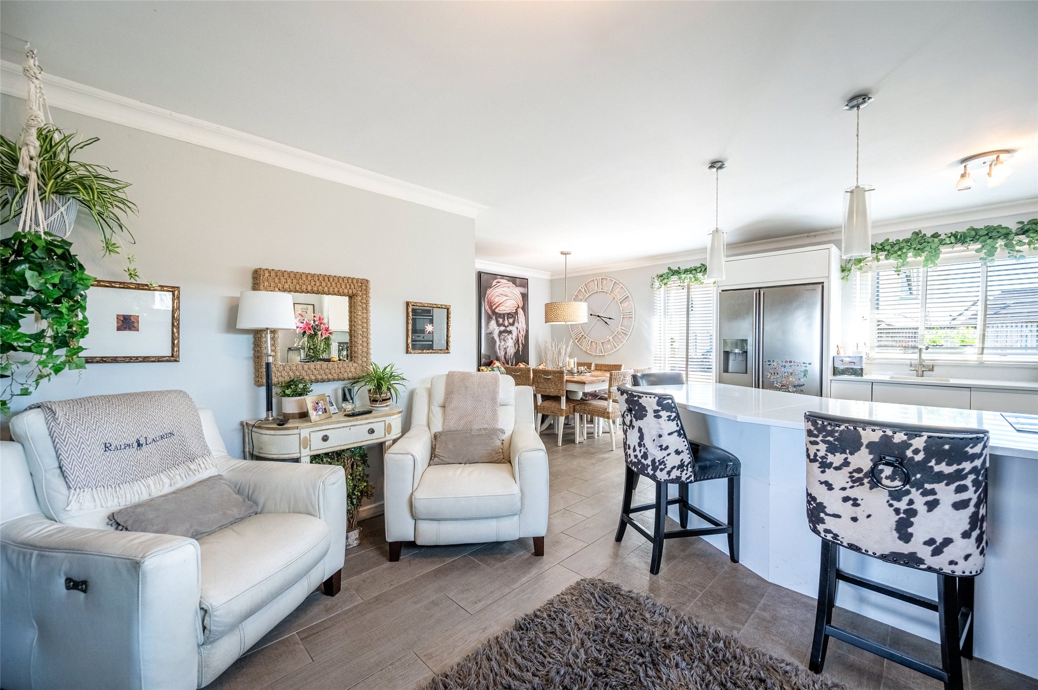 Thoughtfully extended by its current owners, the home comprises an inviting entrance hallway that flows seamlessly into the breathtaking open-plan kitchen, dining, and family room. The beautiful breakfasting kitchen is fitted with a stylish range of wall-mounted and floor-standing units, integrated appliances, complementary quartz worktops, a boiling water tap, double oven and a breakfast bar. The generous dining area offers ample space for entertaining, while the open-plan living space is further enhanced by sliding doors that lead to a magnificent lounge. This exceptional lounge is of impressive proportions, featuring a striking statement fireplace and bi-fold doors that open directly onto the decked terrace and rear gardens, creating a perfect indoor-outdoor living experience.