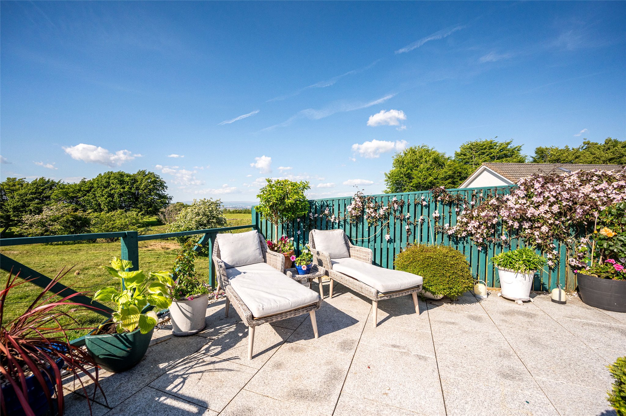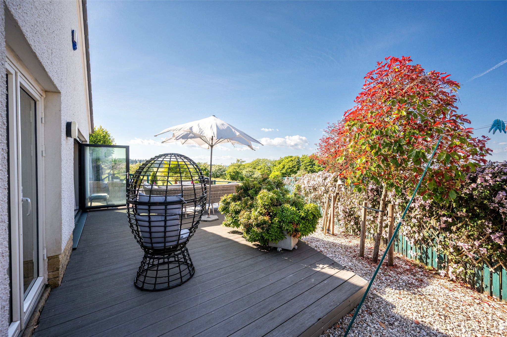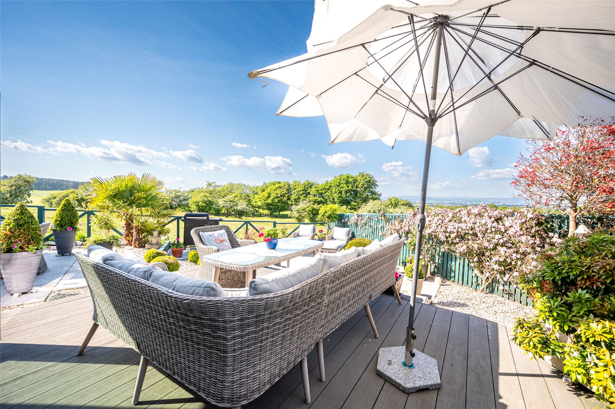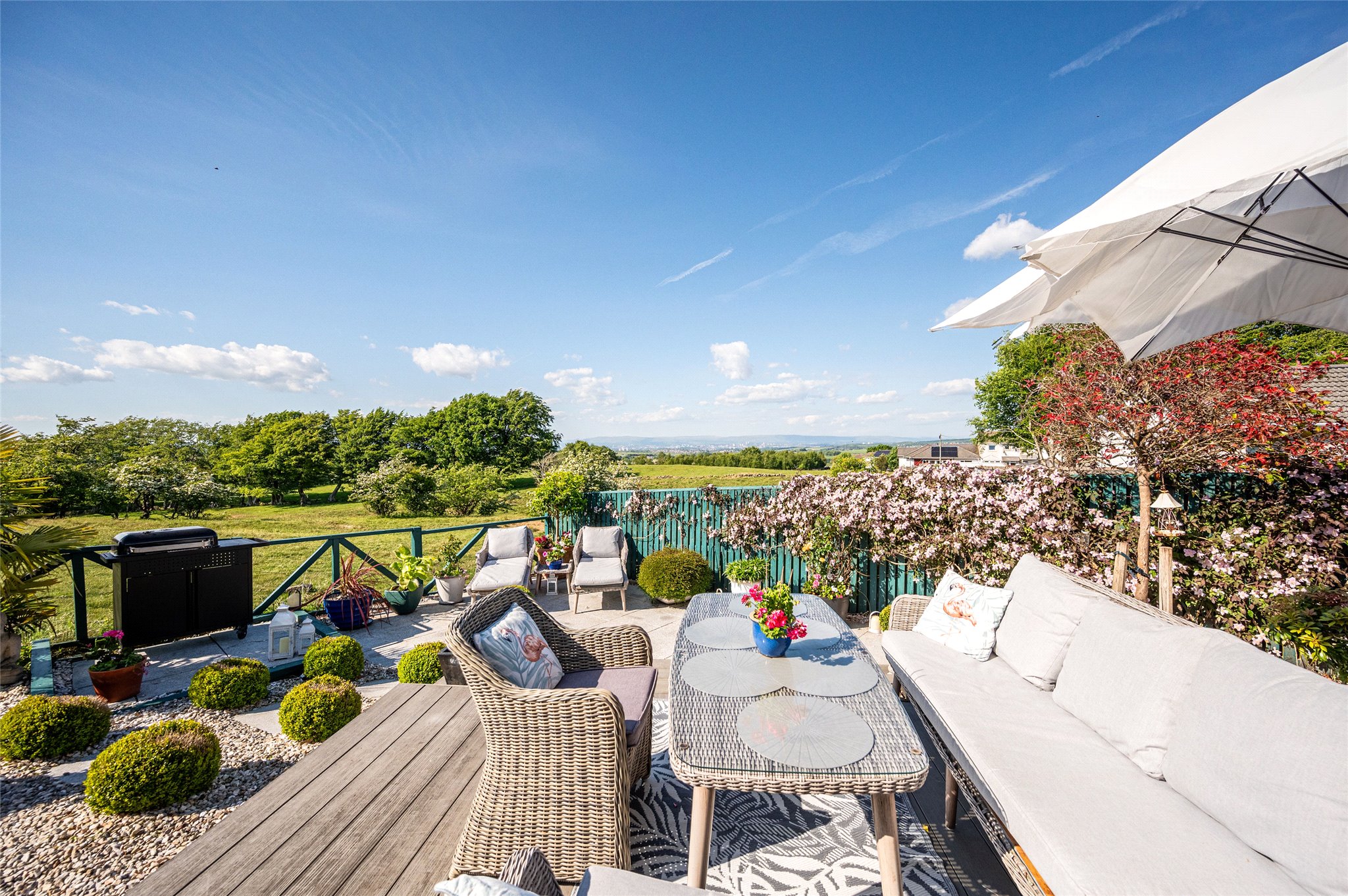 A particular highlight of this outstanding home is the remarkable rear garden—rarely available and truly exceptional. It features a decked terrace, separate patio areas ideal for entertaining, stunning open views across farmland to Glasgow, and beautifully stocked, colourful borders throughout.