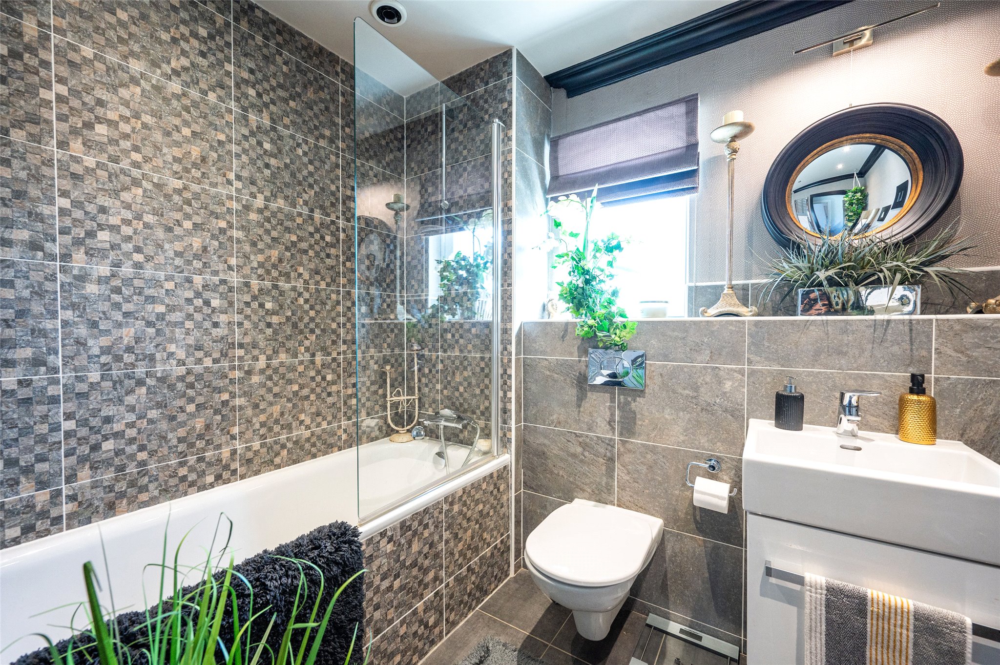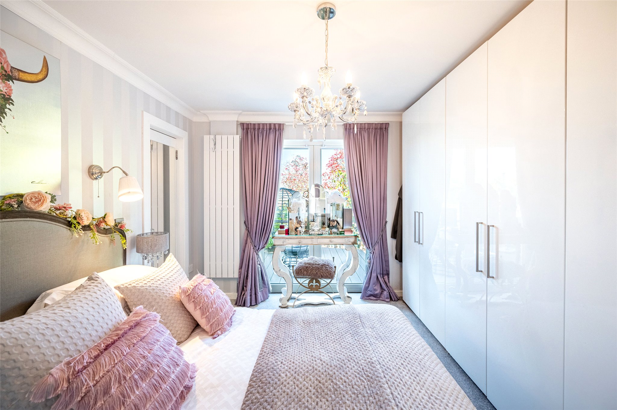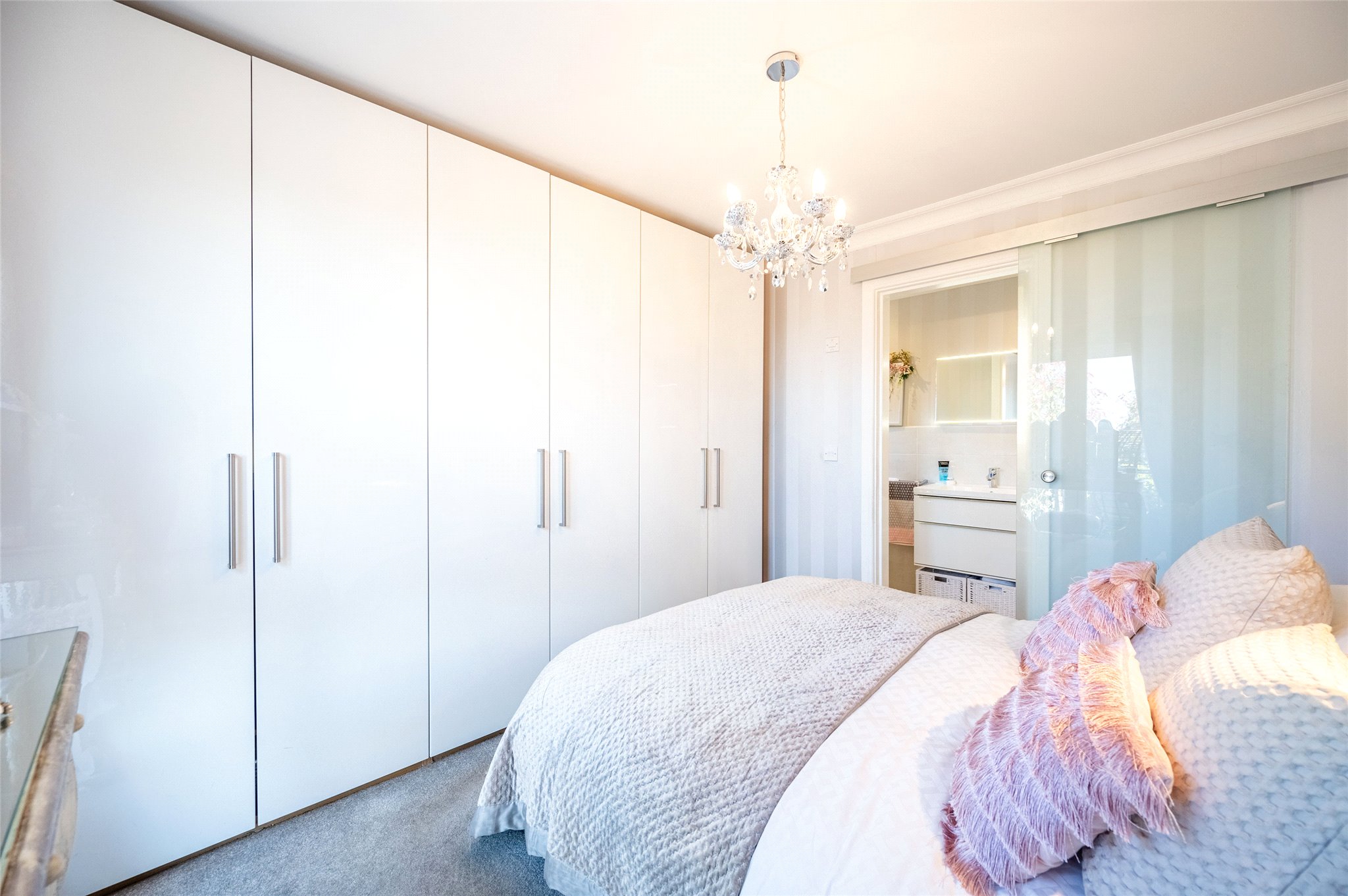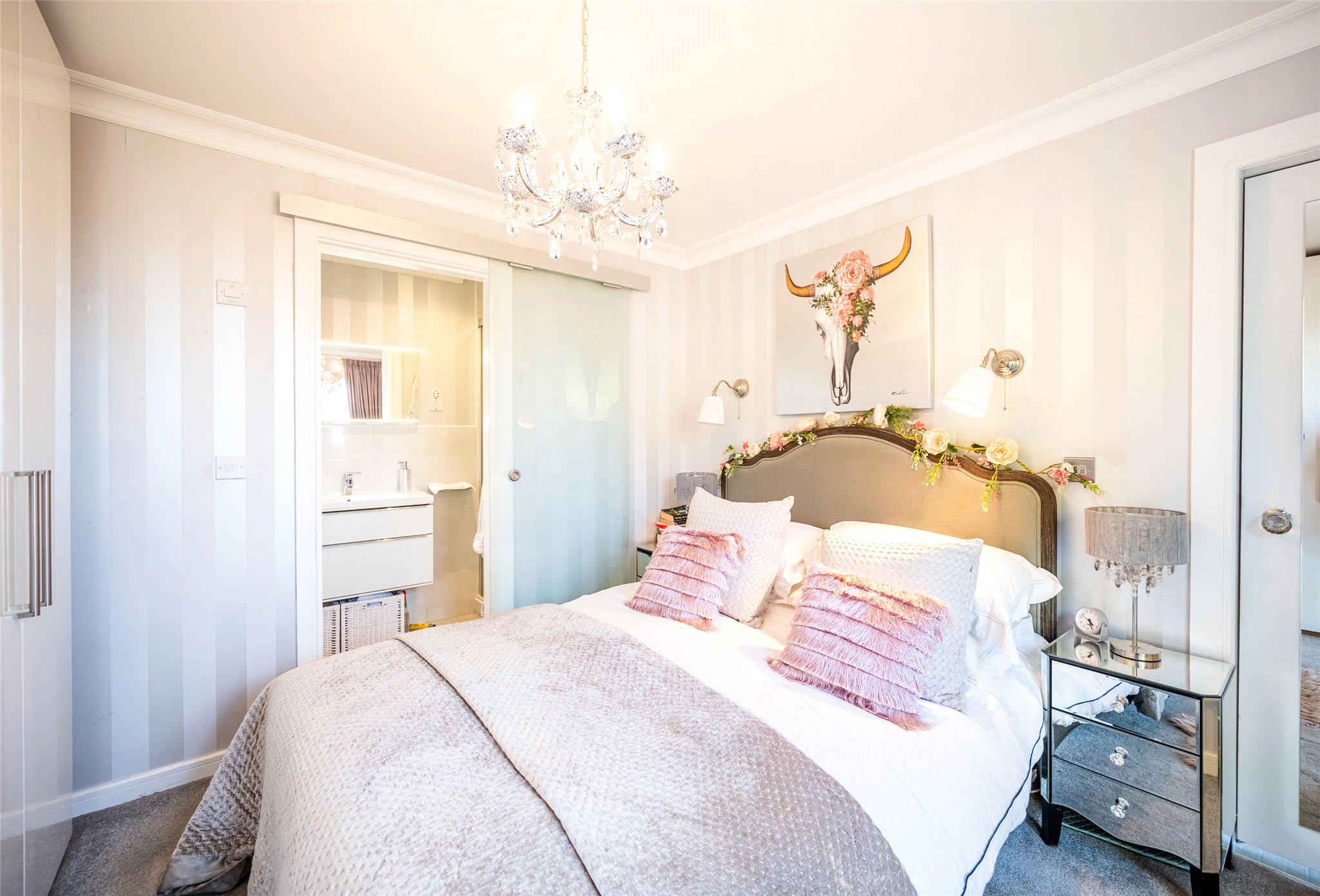 The accommodation is completed by two double bedrooms, both with fitted wardrobes. The principal bedroom benefits from a sleek en-suite shower room, with patio doors to rear garden. While a well-appointed house bathroom serves the rest of the home.