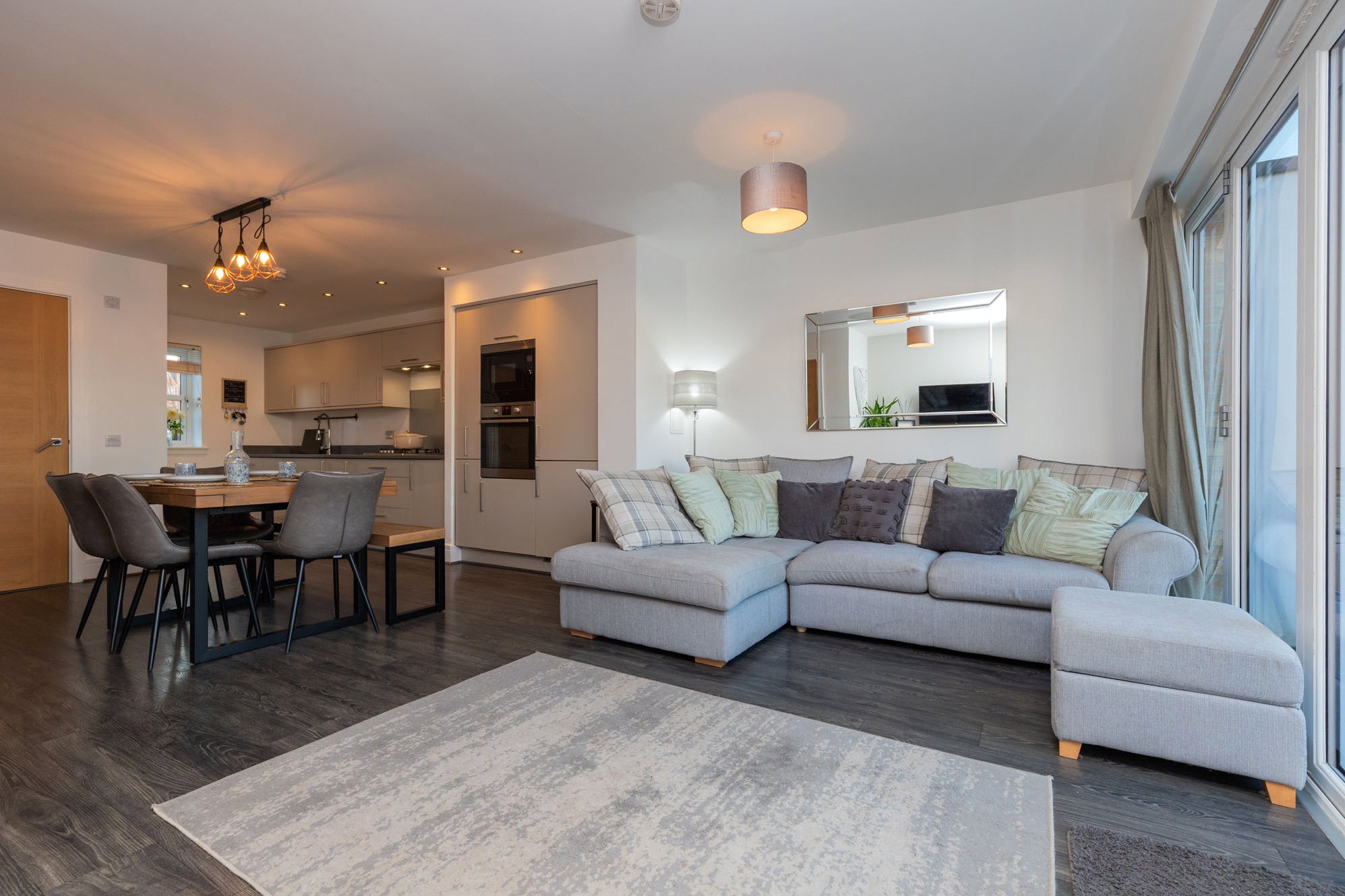 The accommodation throughout is bright, spacious, and thoughtfully arranged to support flexible family living. The ground floor begins with a welcoming entrance hallway and a convenient guest WC. At the heart of the home is the impressive open-plan living, dining, and kitchen area, featuring sleek contemporary fittings and integrated appliances. Large glazed doors flood the space with natural light and lead directly to the private rear garden.