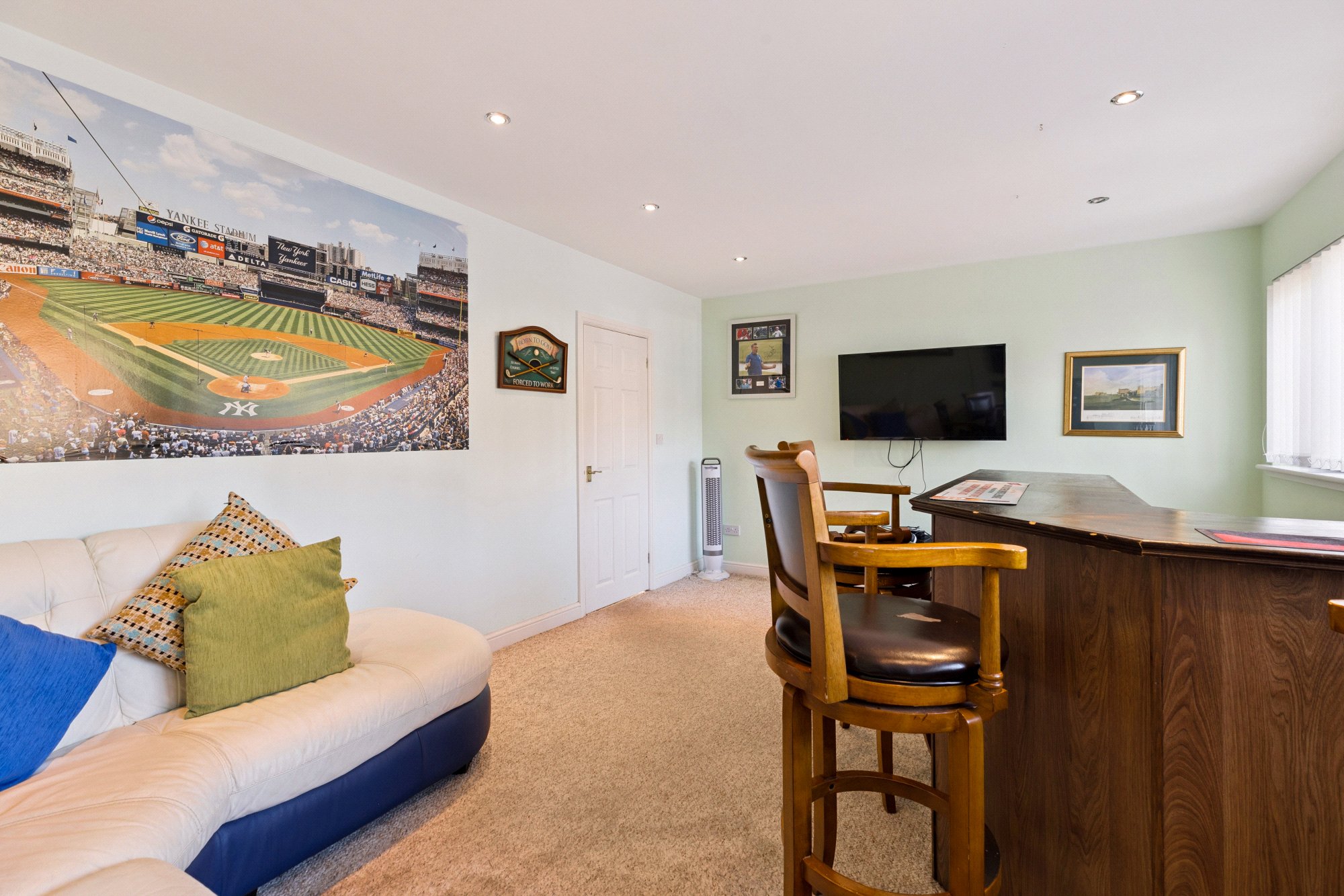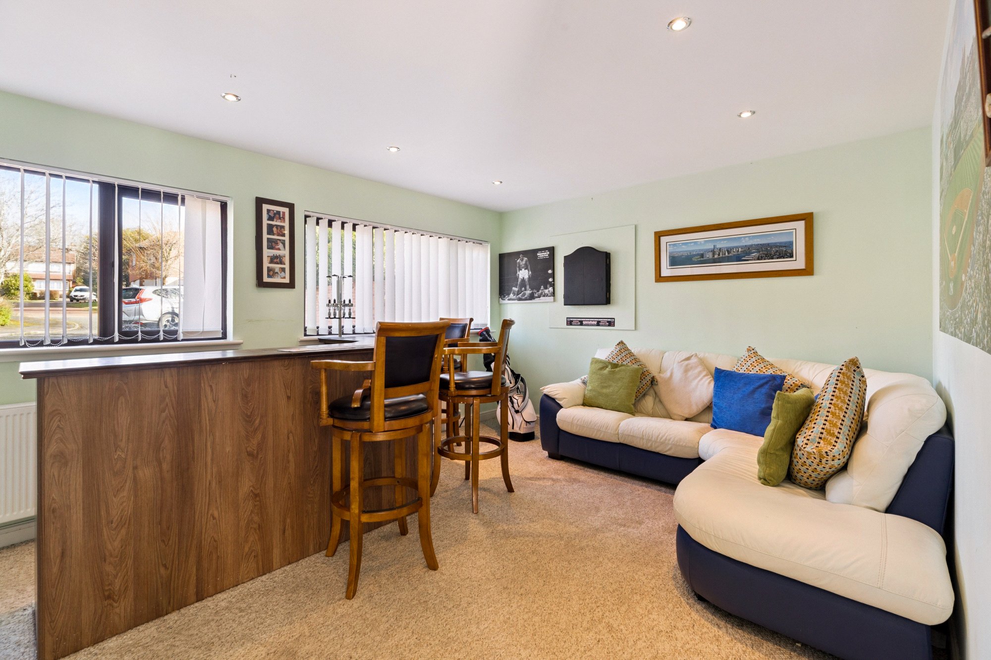 On the ground floor, a welcoming entrance hall leads to a bright and spacious lounge, ideal for relaxing or entertaining guests. The well-proportioned dining room provides the perfect setting for family meals, while the separate sitting room offers additional flexible living space—ideal as a playroom, home office, or snug. The fitted kitchen is conveniently positioned with access to the patio ideal for al-fresco dining. A standout feature is the substantial bar/entertaining room, offering fantastic potential for hosting and social occasions, there is also a handy utility room and store cupboard.