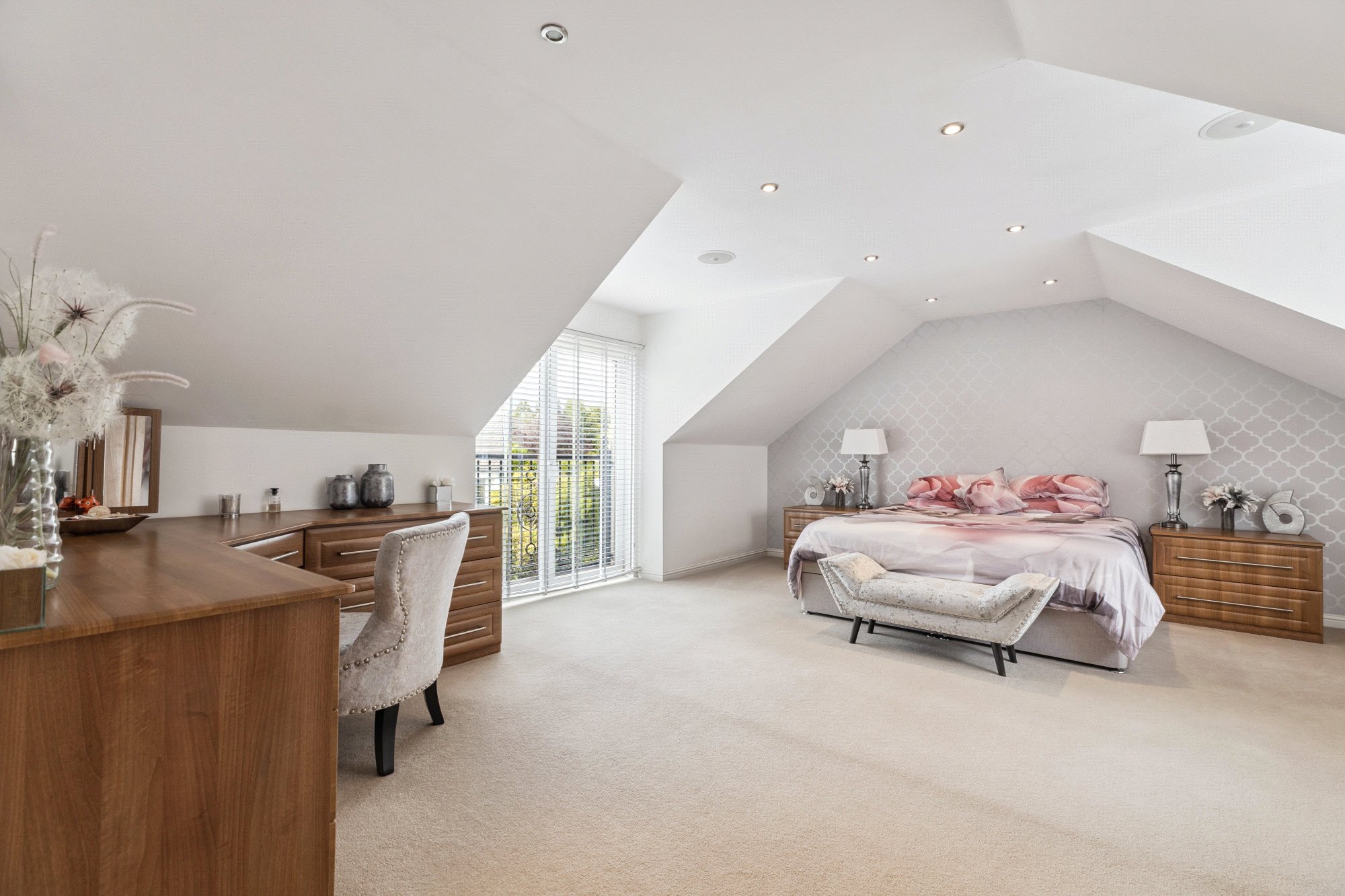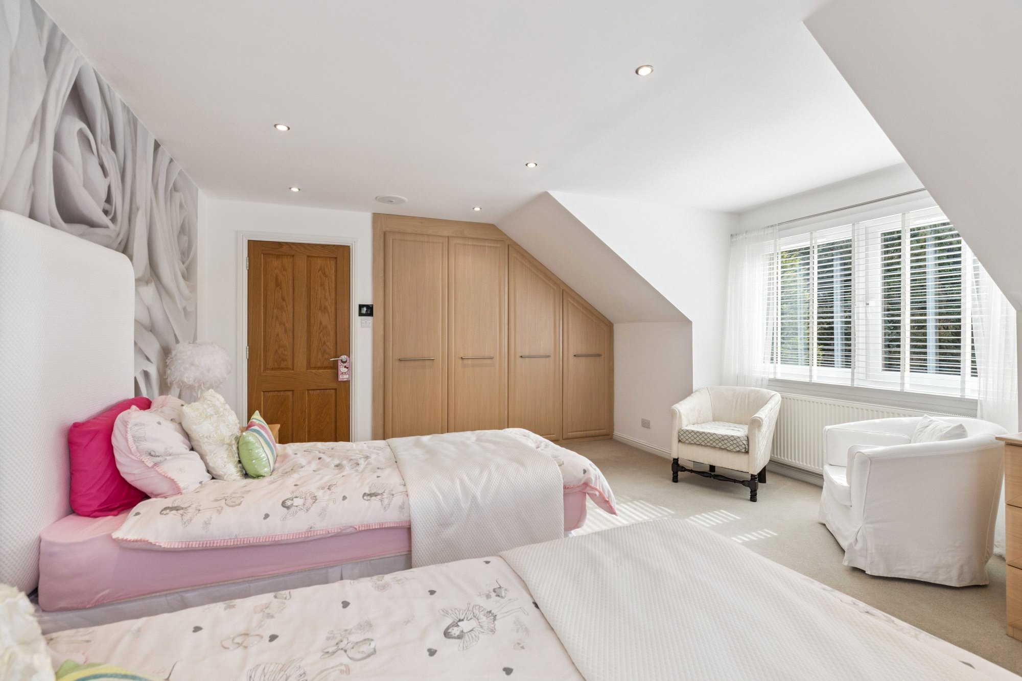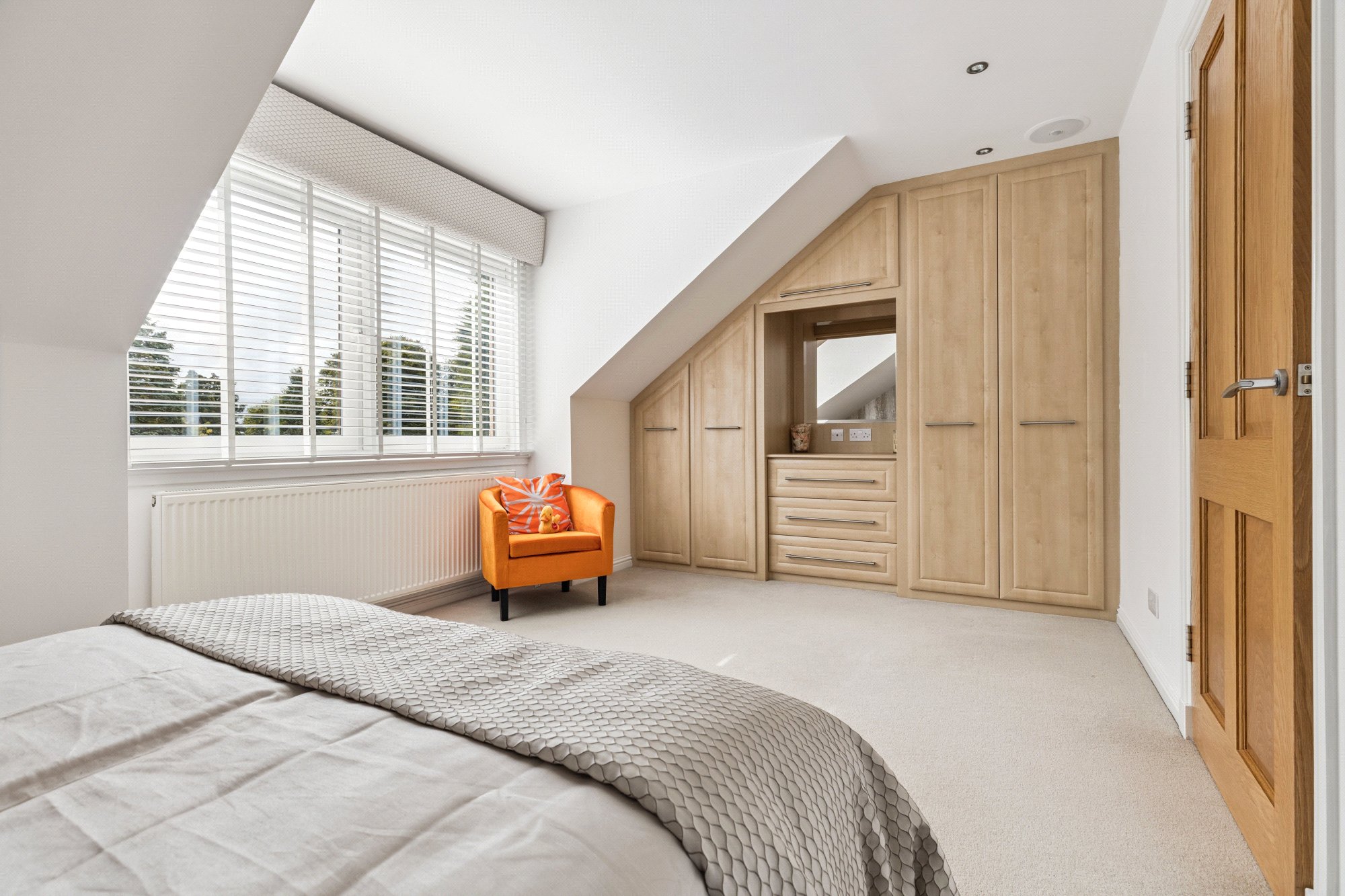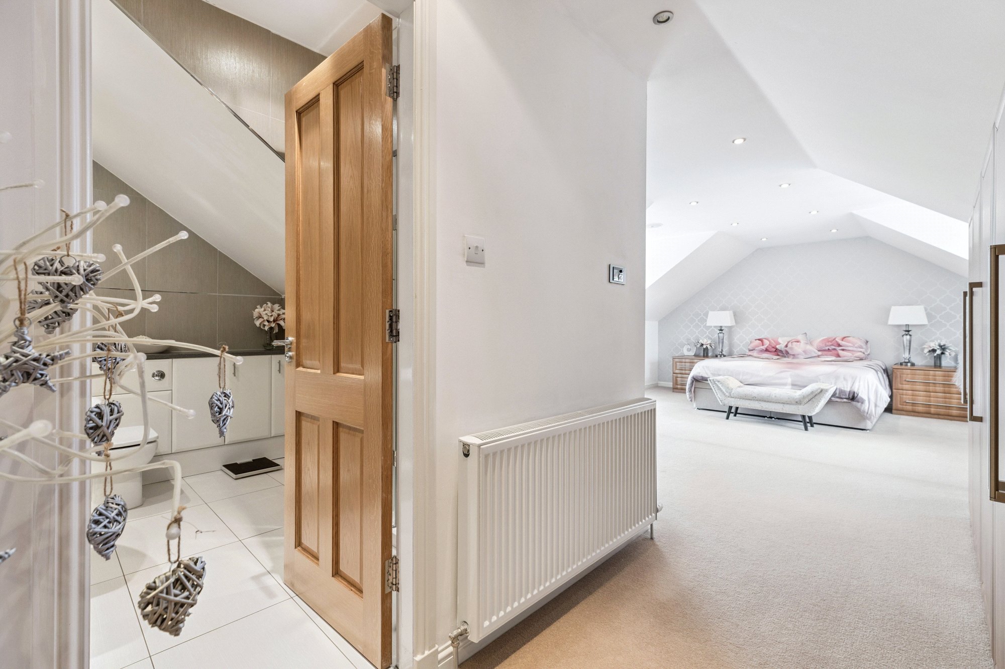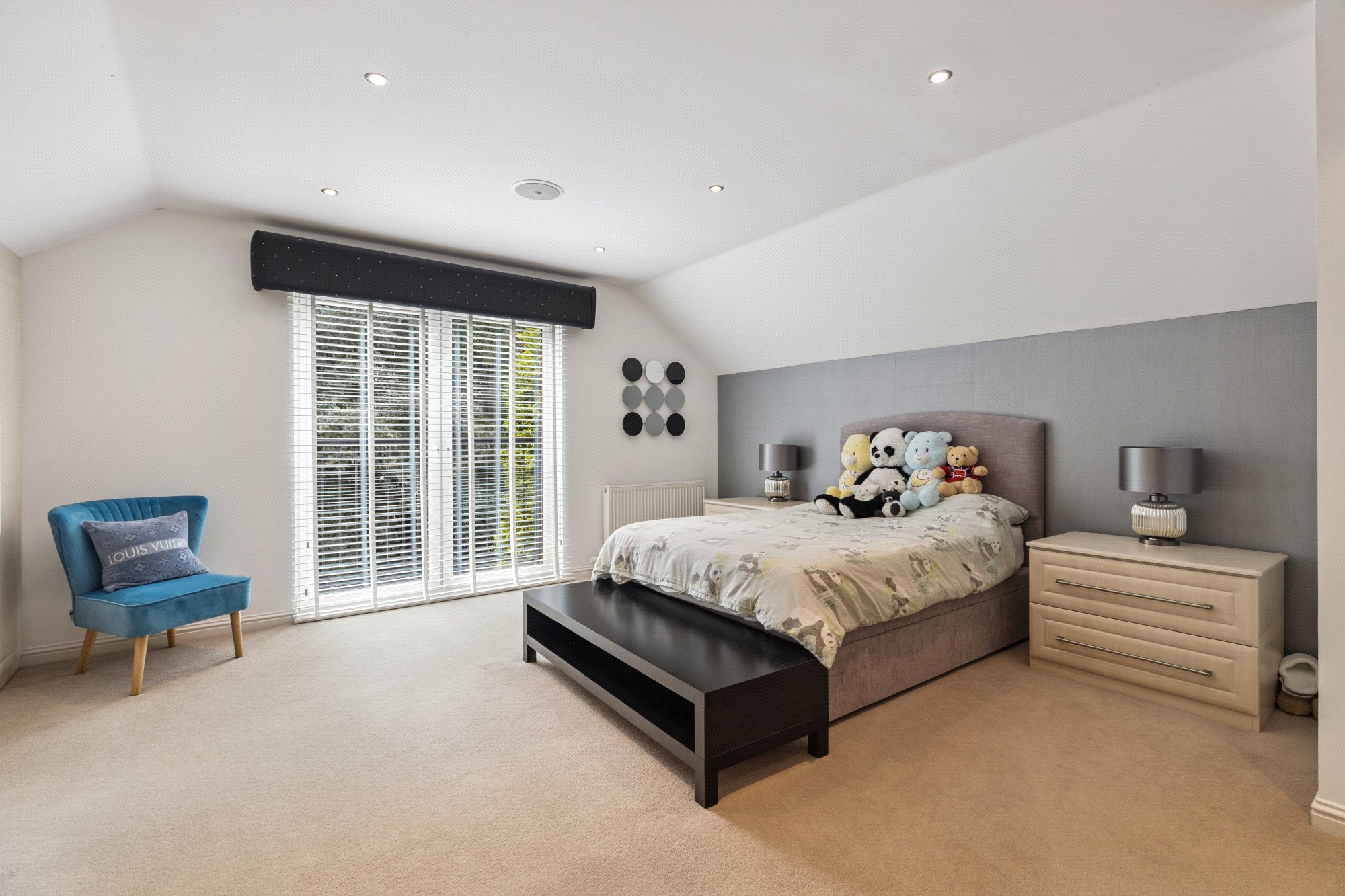 Upstairs, the oak staircase leads to a spacious landing and five generous double bedrooms. The principal suite is particularly impressive, featuring fitted wardrobes, a Juliet balcony overlooking the gardens, and its own stylish en suite shower room. Two further bedrooms enjoy en suite facilities, while the remaining rooms are served by a beautifully finished family bathroom with a separate shower enclosure. All bedrooms benefit from fitted storage and excellent proportions, making this an ideal home for larger families.