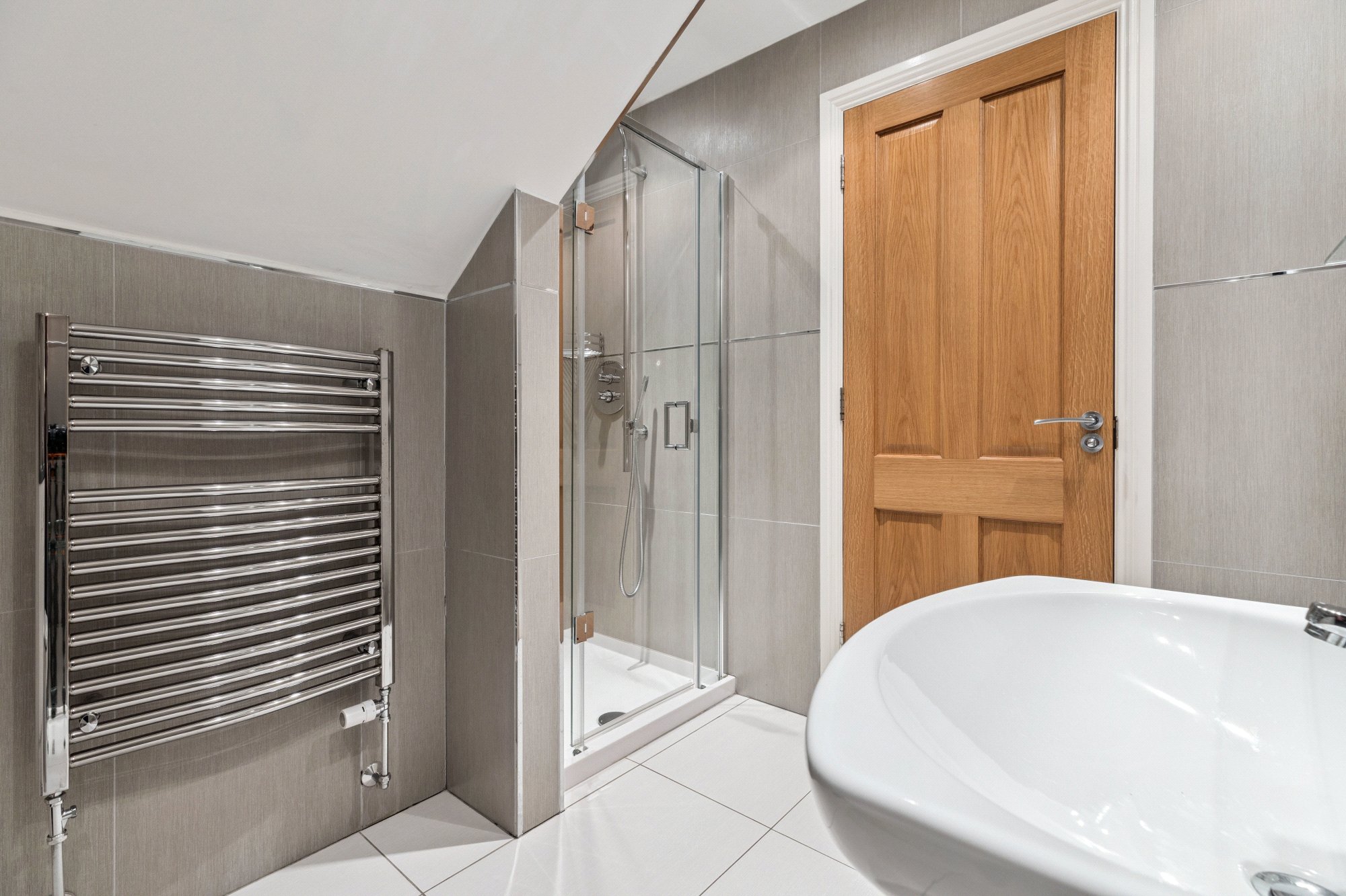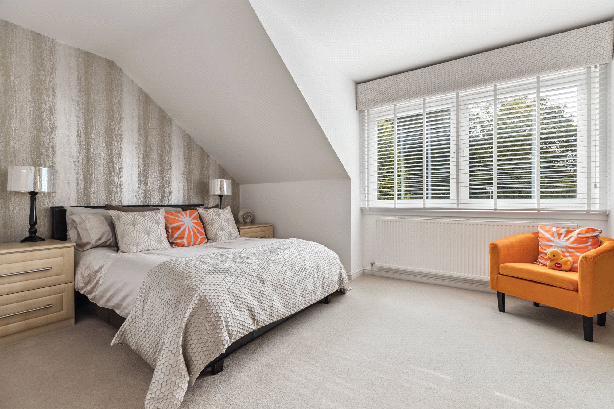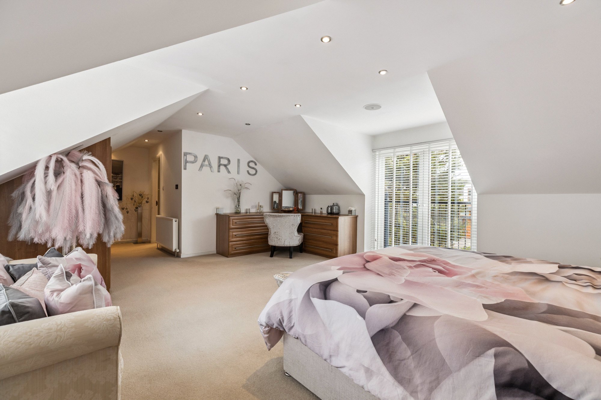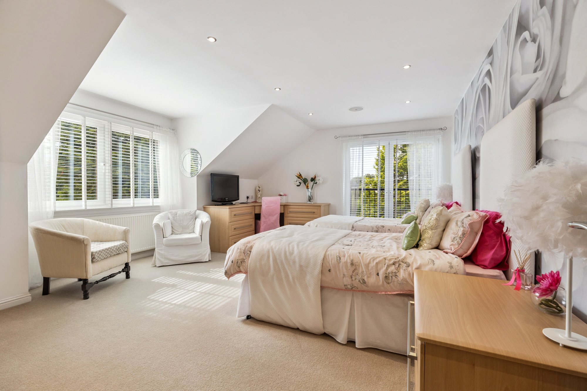 Upstairs, the oak staircase leads to a spacious landing and five generous double bedrooms. The principal suite is particularly impressive, featuring fitted wardrobes, a Juliet balcony overlooking the gardens, and its own stylish en suite shower room. Two further bedrooms enjoy en suite facilities, while the remaining rooms are served by a beautifully finished family bathroom with a separate shower enclosure. All bedrooms benefit from fitted storage and excellent proportions, making this an ideal home for larger families.