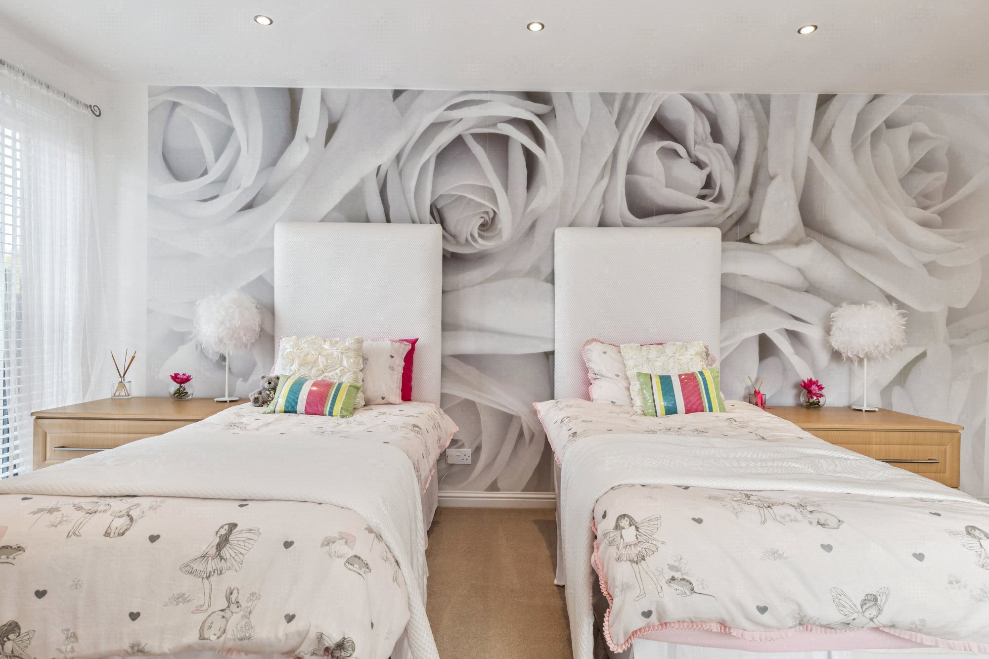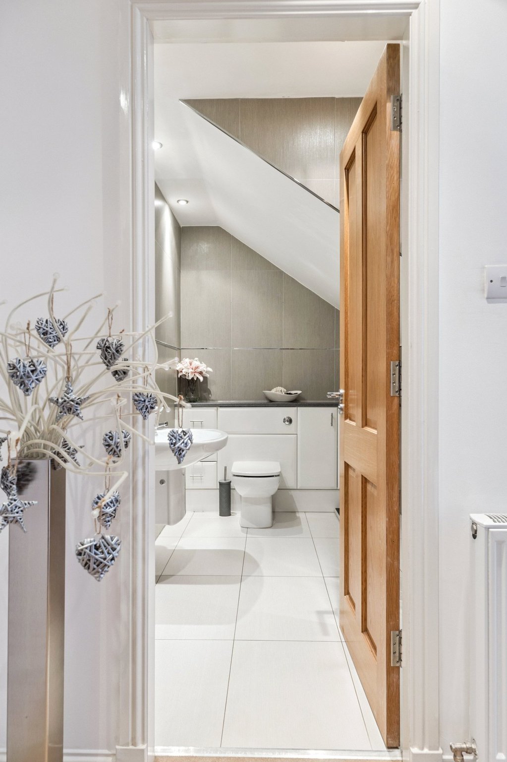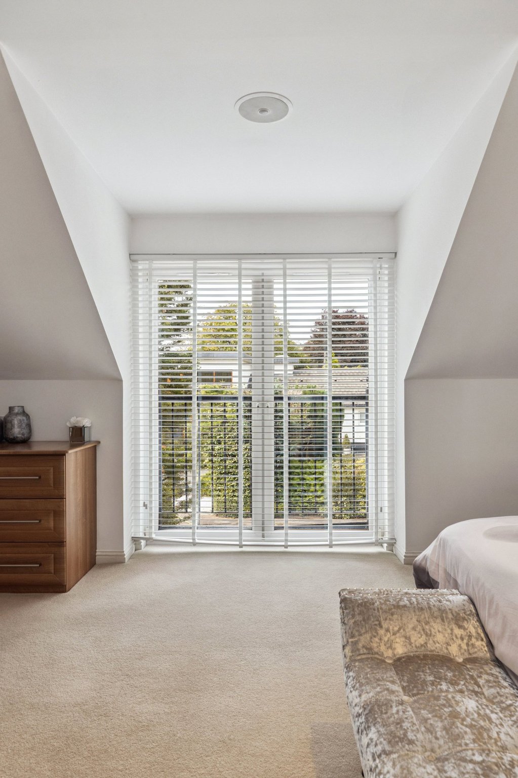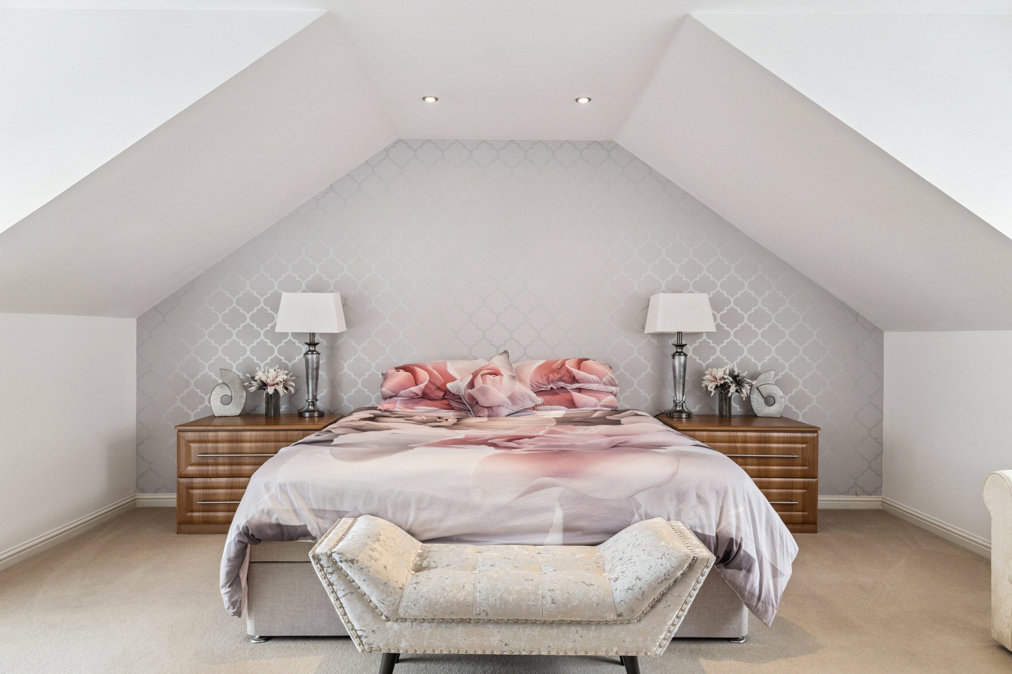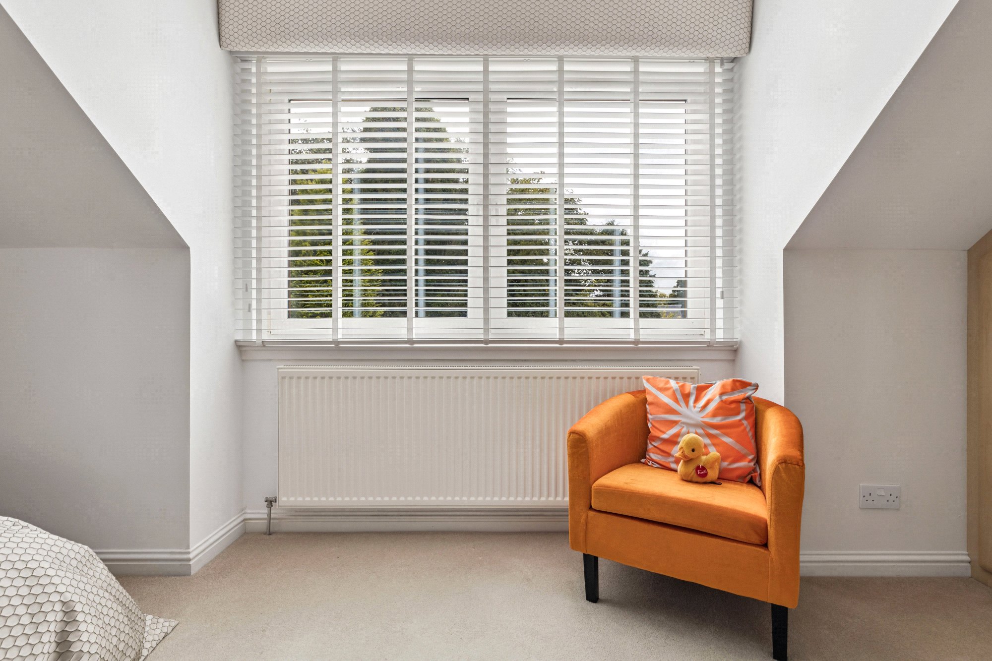 Upstairs, the oak staircase leads to a spacious landing and five generous double bedrooms. The principal suite is particularly impressive, featuring fitted wardrobes, a Juliet balcony overlooking the gardens, and its own stylish en suite shower room. Two further bedrooms enjoy en suite facilities, while the remaining rooms are served by a beautifully finished family bathroom with a separate shower enclosure. All bedrooms benefit from fitted storage and excellent proportions, making this an ideal home for larger families.