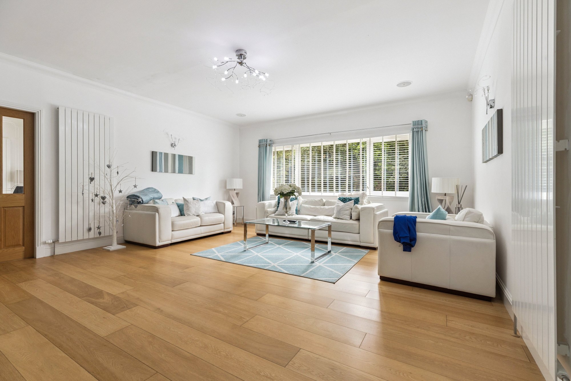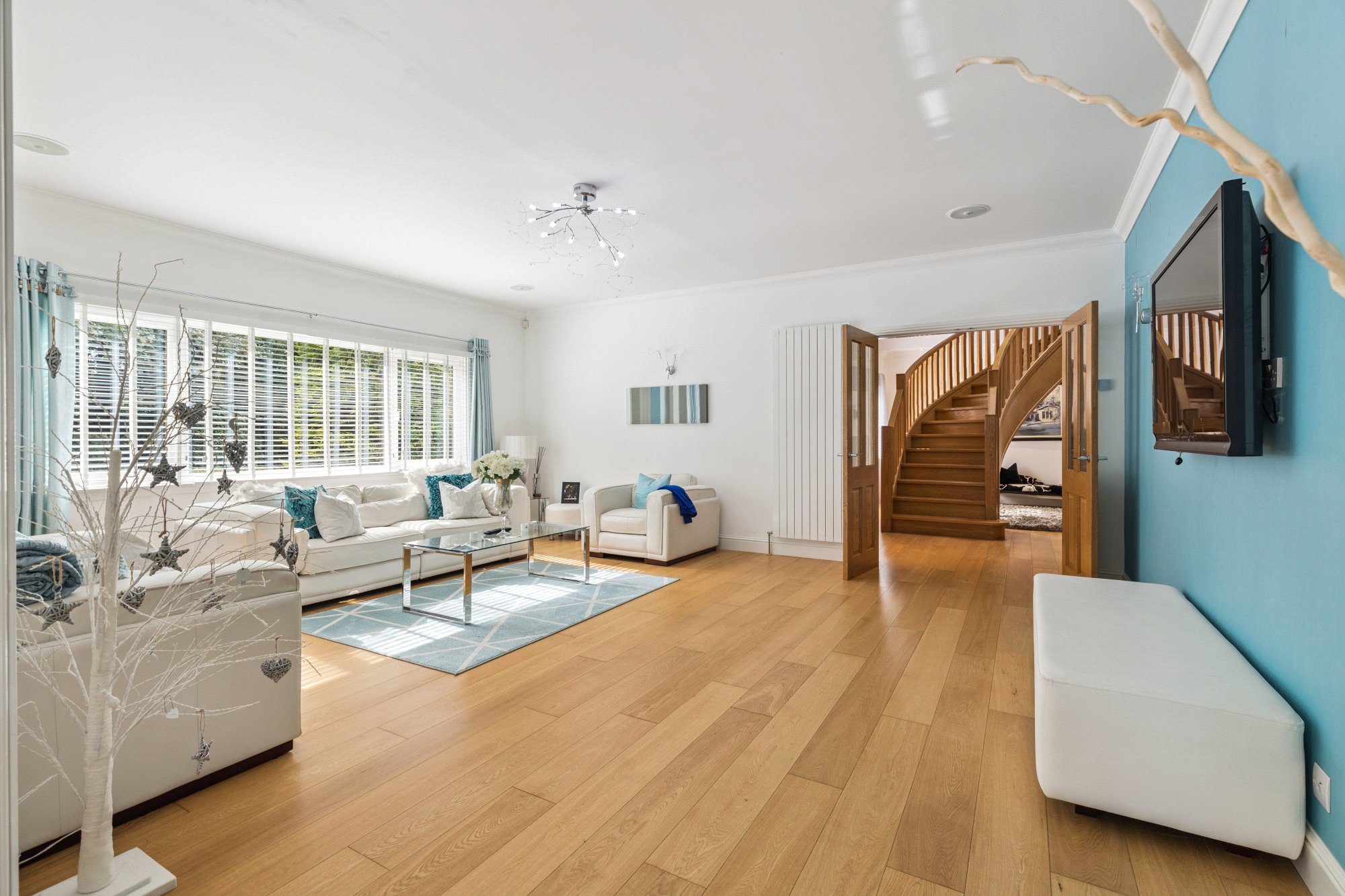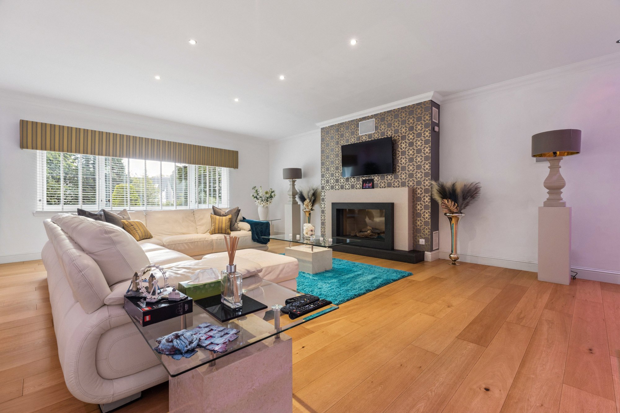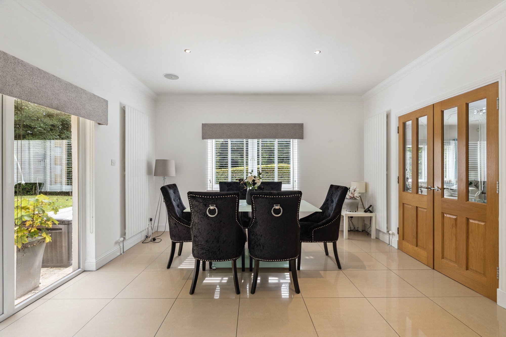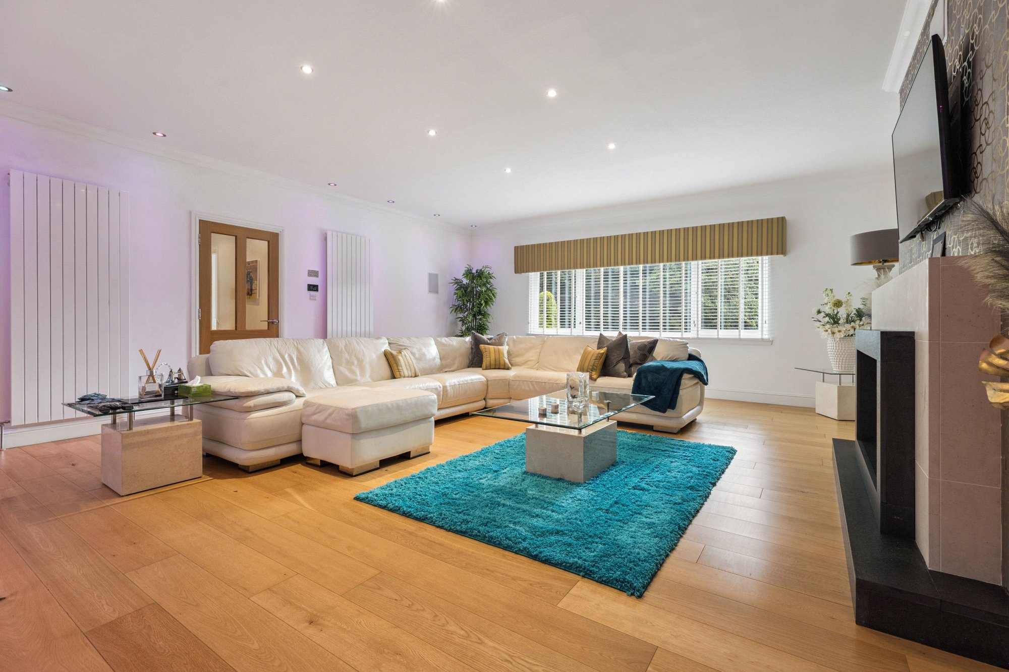 Externally, the property sits within landscaped private gardens that wrap around the house. A block-paved driveway provides ample parking and leads to the integral garage. Expanses of lawn, mature trees, shrubs and planted borders create privacy and greenery, while a series of terraces provide inviting spaces for outdoor dining and entertaining.