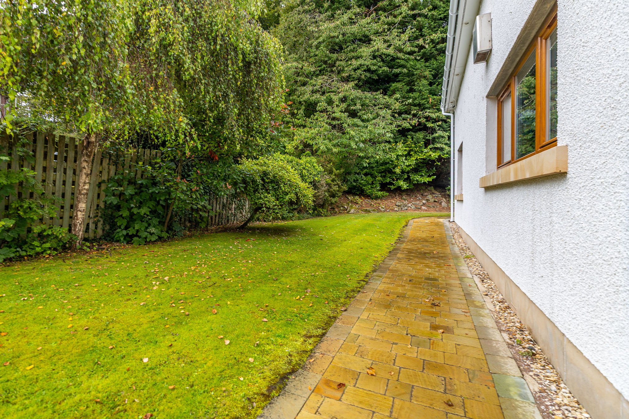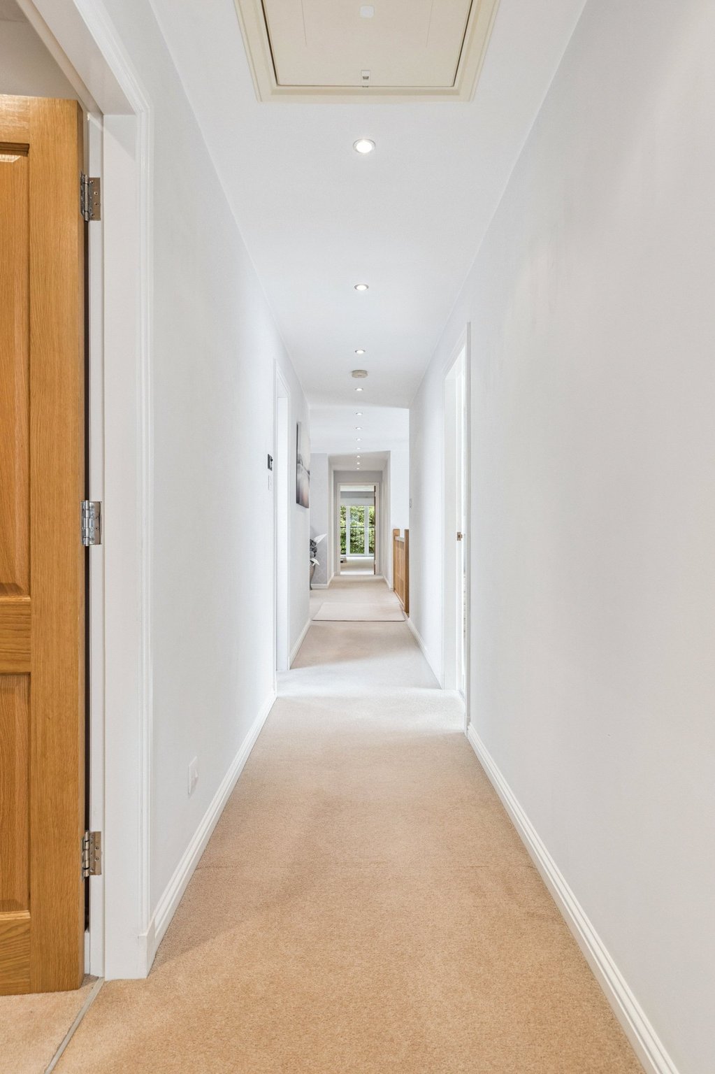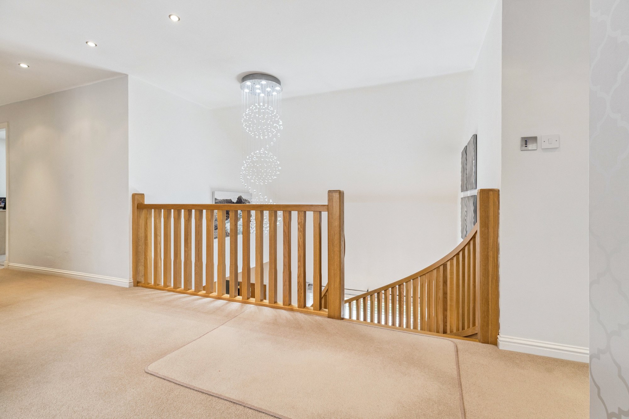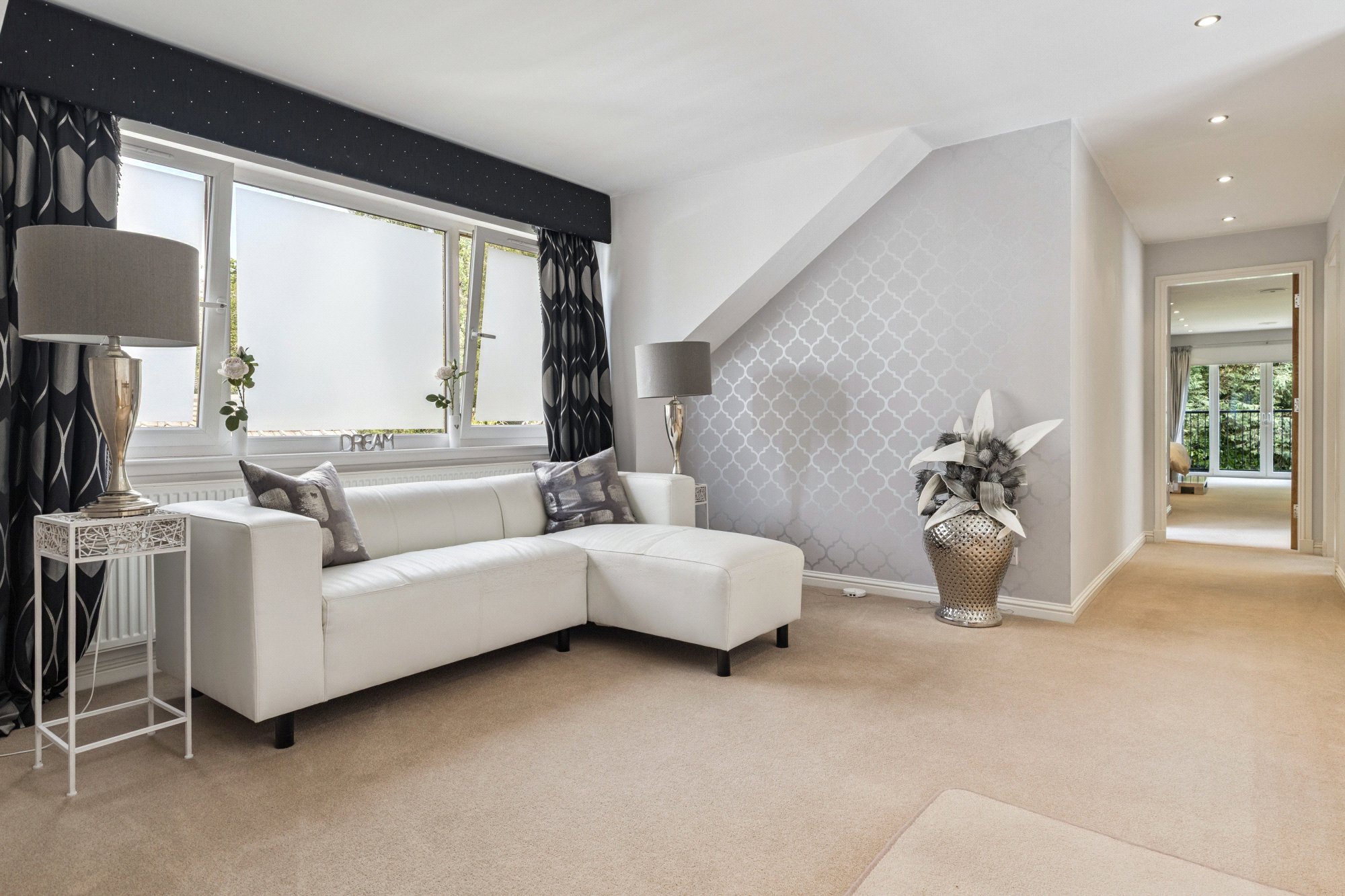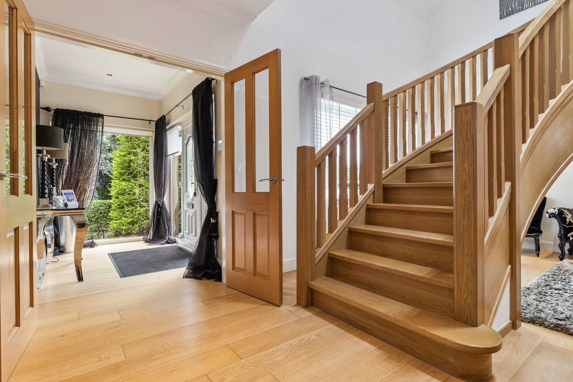 Externally, the property sits within landscaped private gardens that wrap around the house. A block-paved driveway provides ample parking and leads to the integral garage. Expanses of lawn, mature trees, shrubs and planted borders create privacy and greenery, while a series of terraces provide inviting spaces for outdoor dining and entertaining.