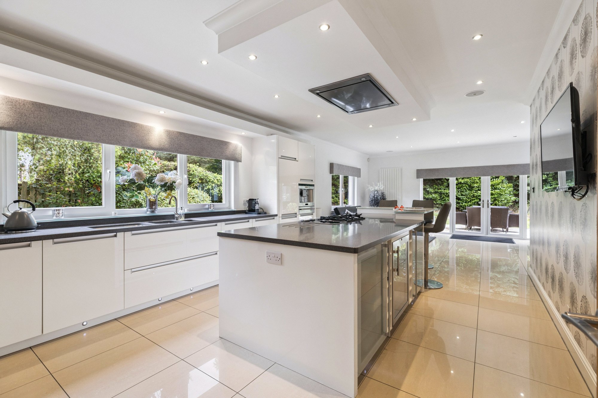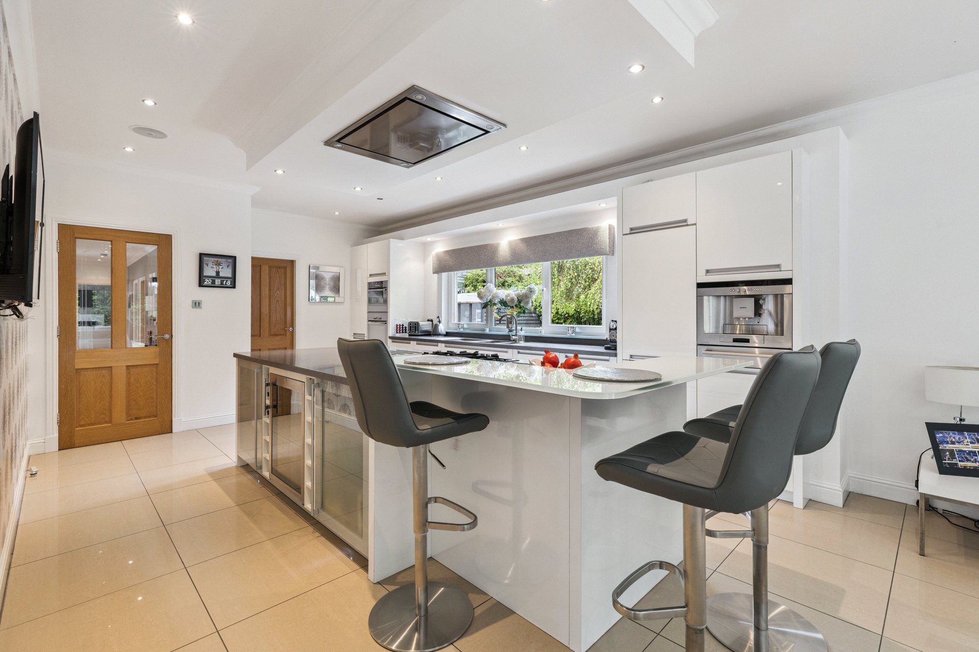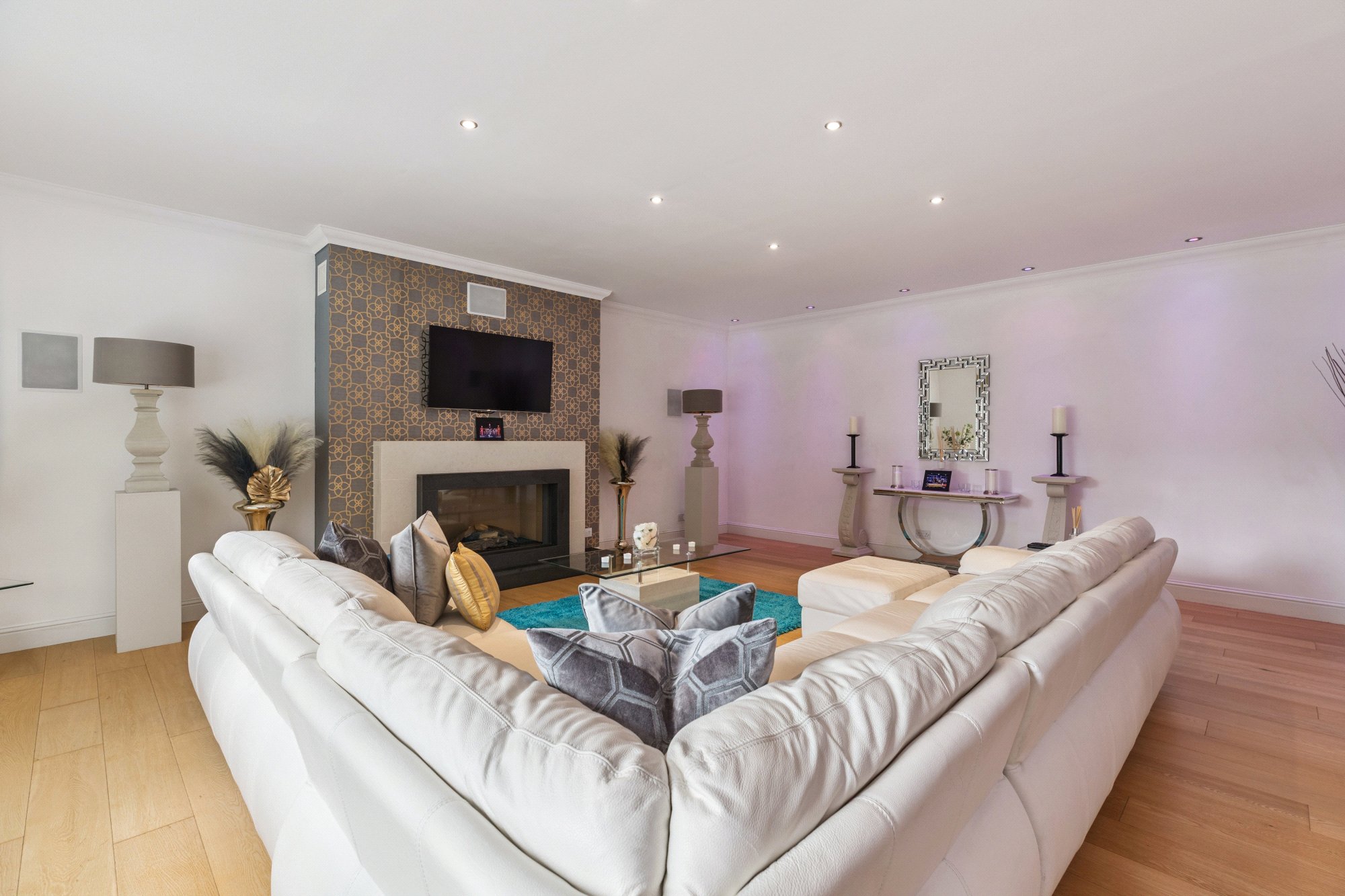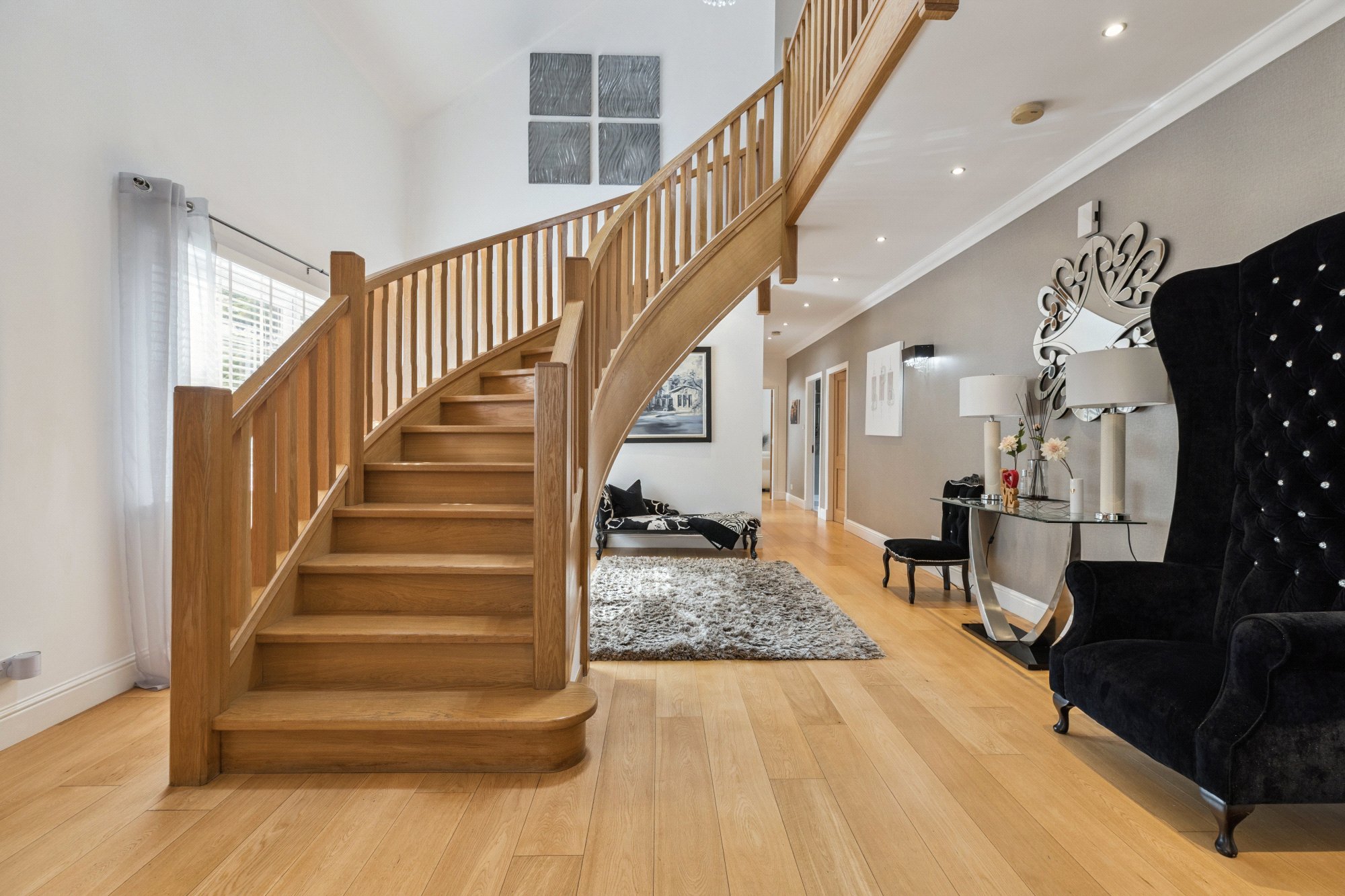 The property is entered via an entrance vestibule leading into a magnificent reception hallway, where a sweeping oak staircase makes an immediate impression. To the left lies the drawing room, a stunning space of grand proportions with a feature fireplace and window formations looking over the front gardens – perfect for formal entertaining as well as everyday family life. A well-sized study provides the ideal setting for home working, while a shower room, media room and utility space add both practicality and flexibility to the ground floor. To the rear, the spectacular kitchen and dining area forms the heart of the home. Sleek cabinetry, a large central island with breakfast bar and a full range of integrated appliances create a highly functional yet stylish space. With room for both relaxed seating and family dining, and French doors opening directly to the gardens, this room has been designed with modern family living and entertaining in mind. Adjacent to the kitchen is a comfortable sitting room, providing an additional living space for quieter moments.