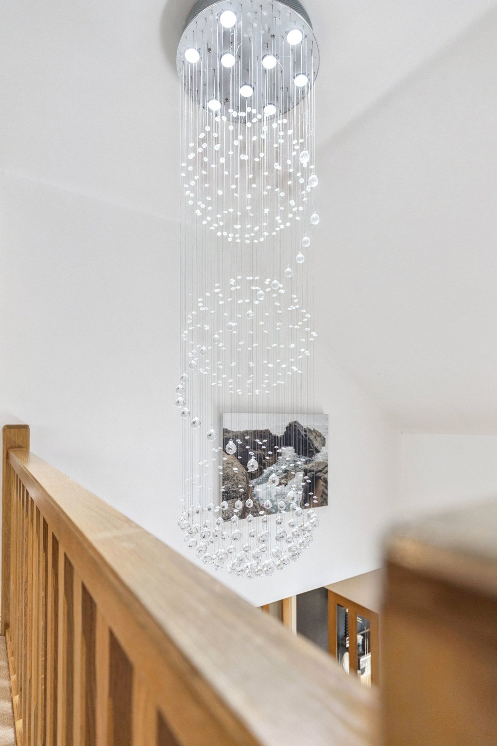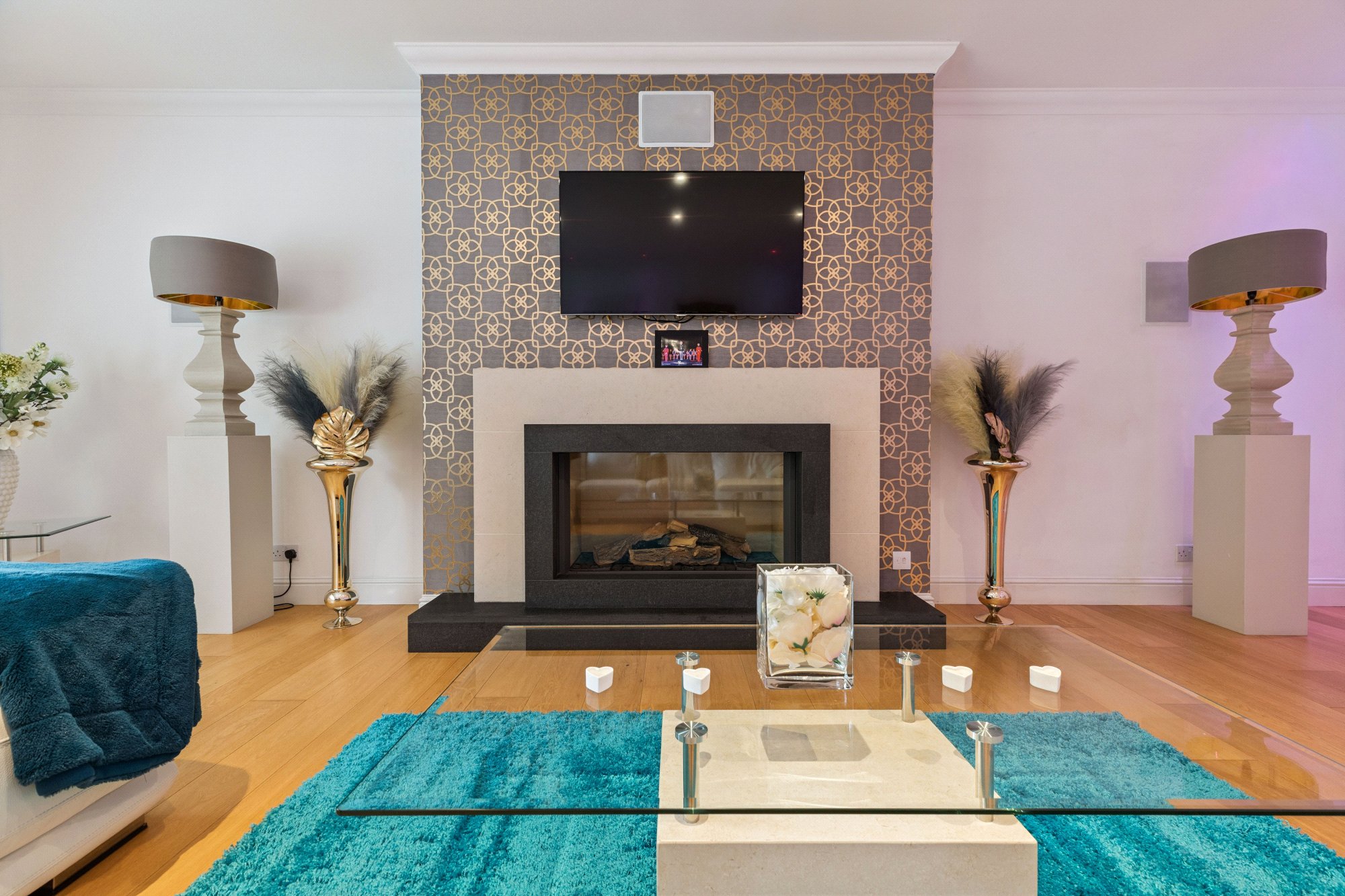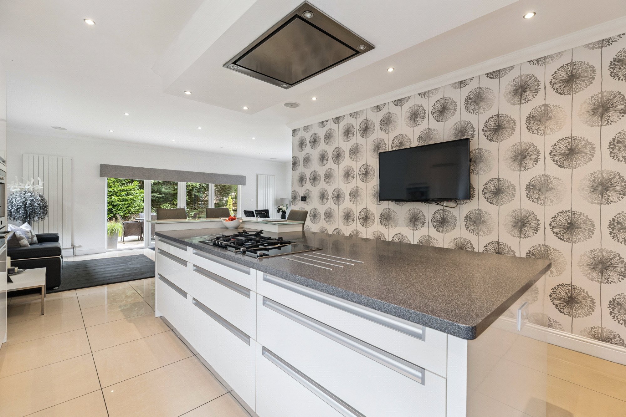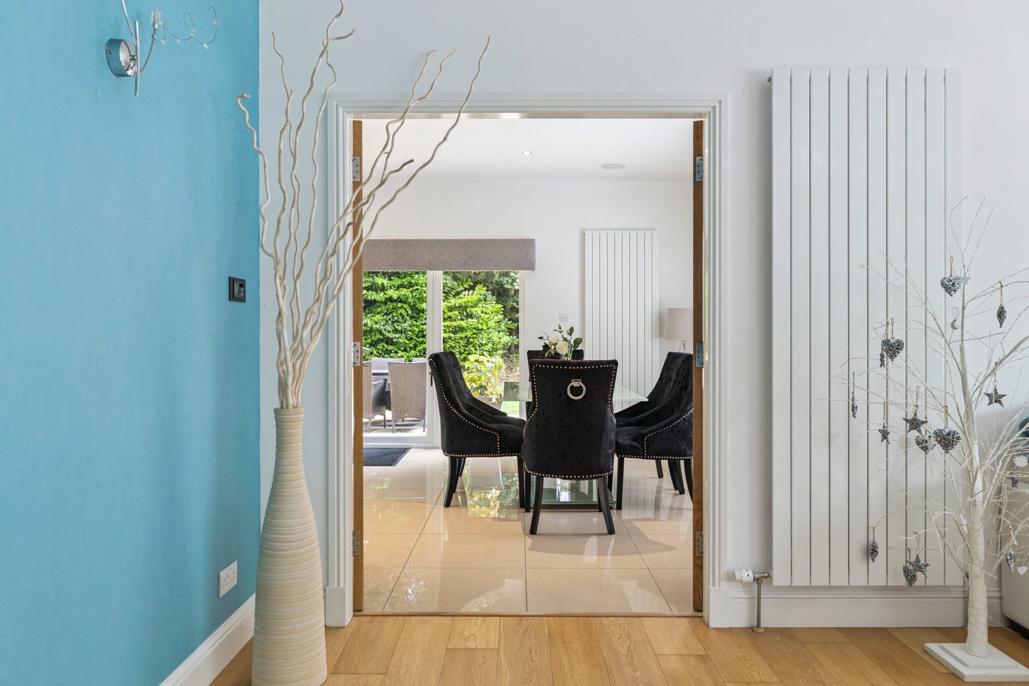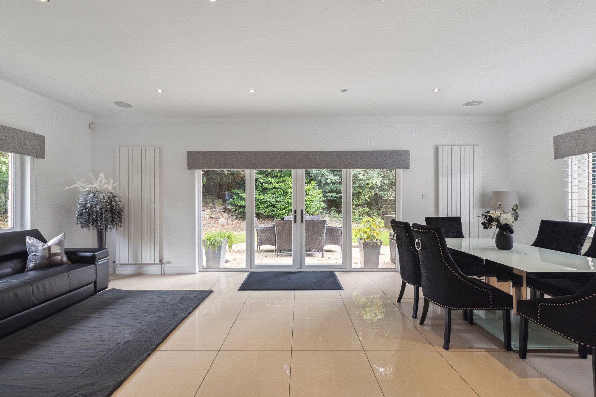 The property is entered via an entrance vestibule leading into a magnificent reception hallway, where a sweeping oak staircase makes an immediate impression. To the left lies the drawing room, a stunning space of grand proportions with a feature fireplace and window formations looking over the front gardens – perfect for formal entertaining as well as everyday family life. A well-sized study provides the ideal setting for home working, while a shower room, media room and utility space add both practicality and flexibility to the ground floor. To the rear, the spectacular kitchen and dining area forms the heart of the home. Sleek cabinetry, a large central island with breakfast bar and a full range of integrated appliances create a highly functional yet stylish space. With room for both relaxed seating and family dining, and French doors opening directly to the gardens, this room has been designed with modern family living and entertaining in mind. Adjacent to the kitchen is a comfortable sitting room, providing an additional living space for quieter moments.
