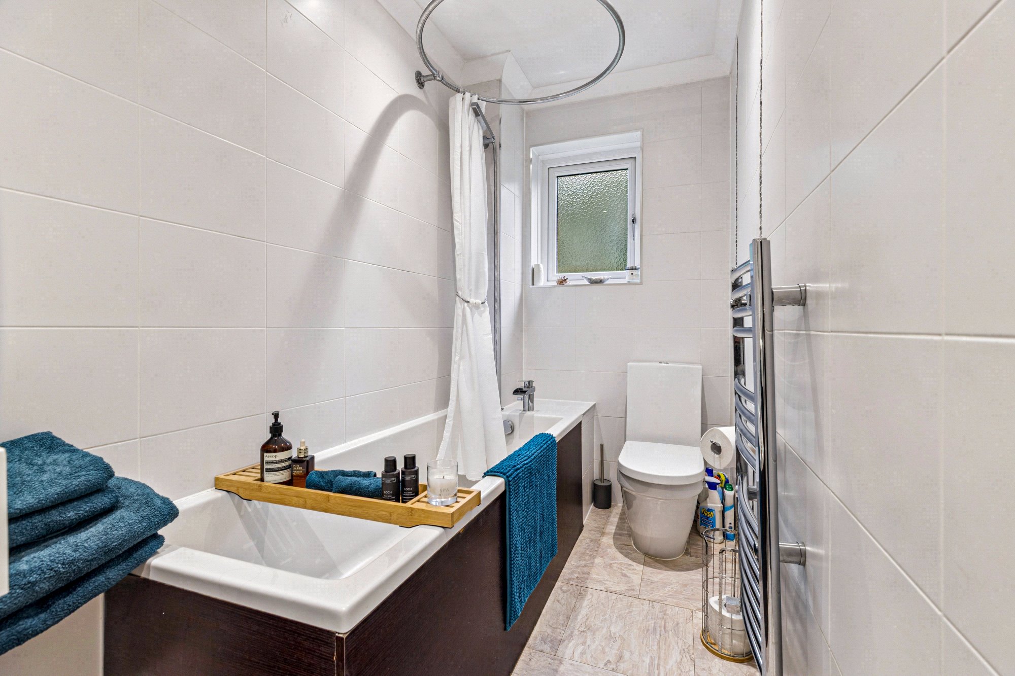 Upstairs, the first-floor landing gives access to a further storage cupboard. Bedroom one benefits from fitted wardrobes, bedroom two includes a useful cupboard space, and bedroom three is also fitted with wardrobes. The family bathroom is complete with a shower over the bath.