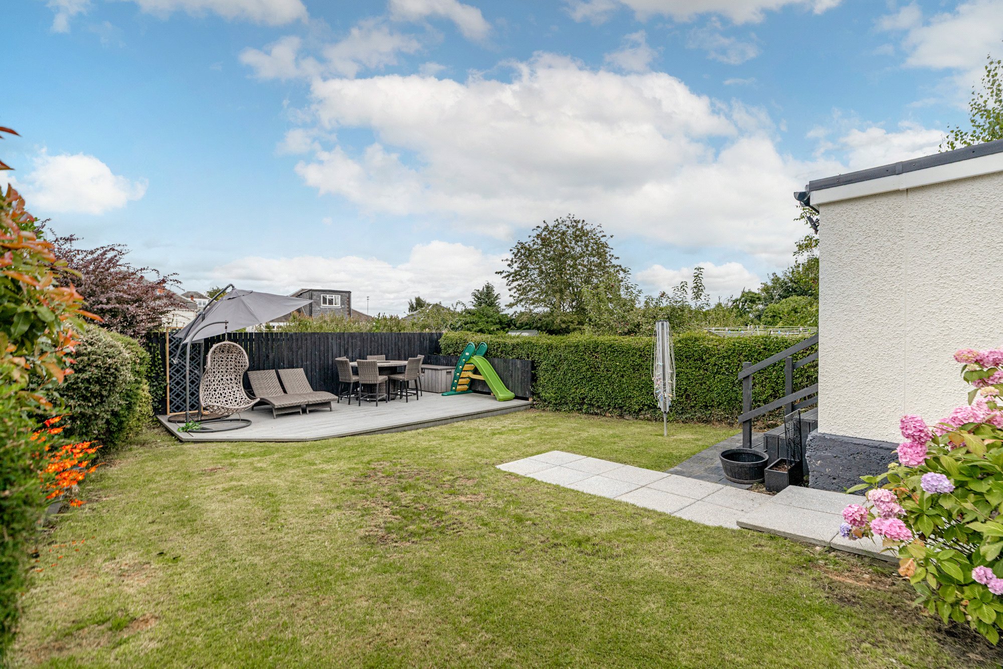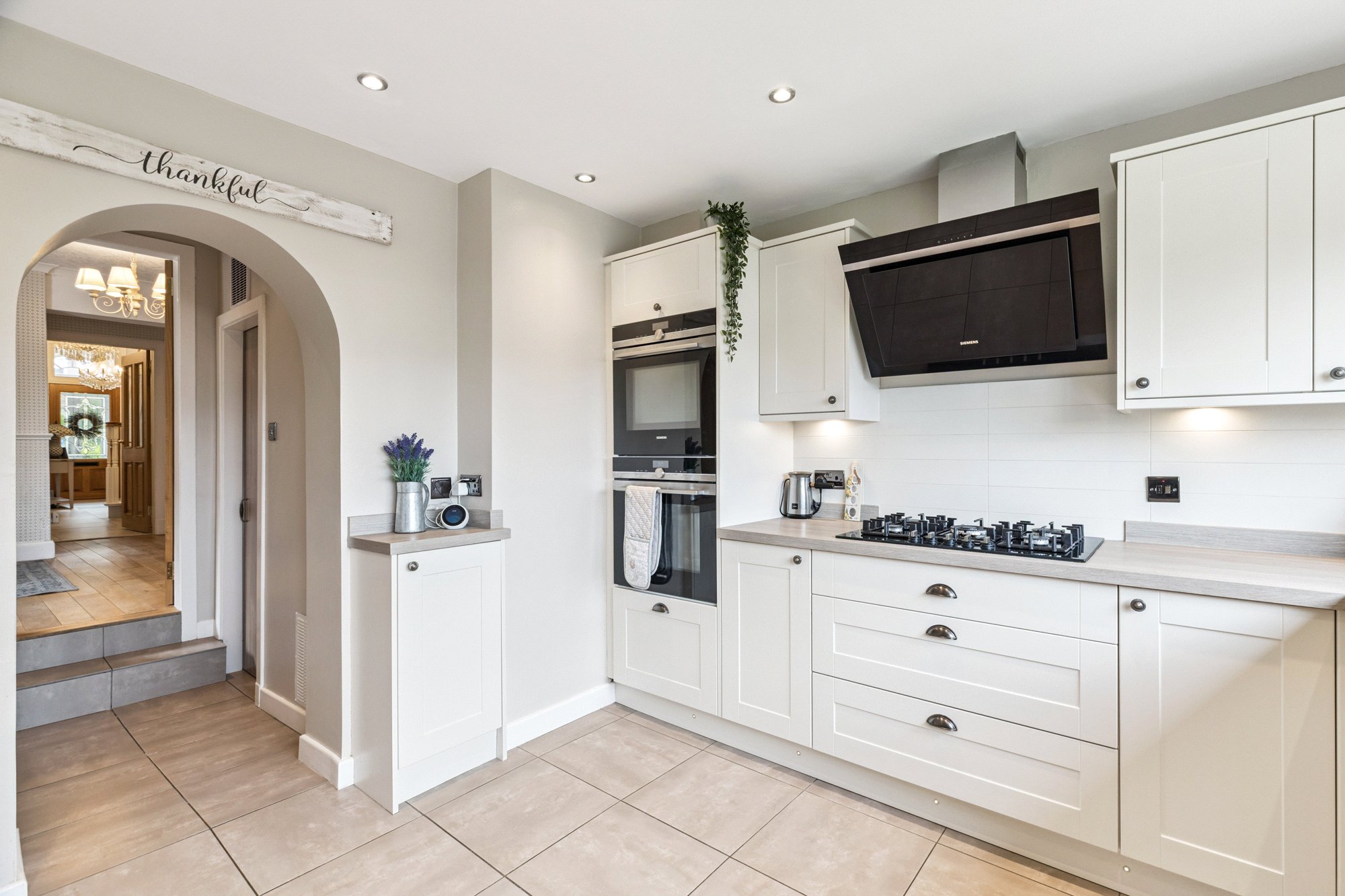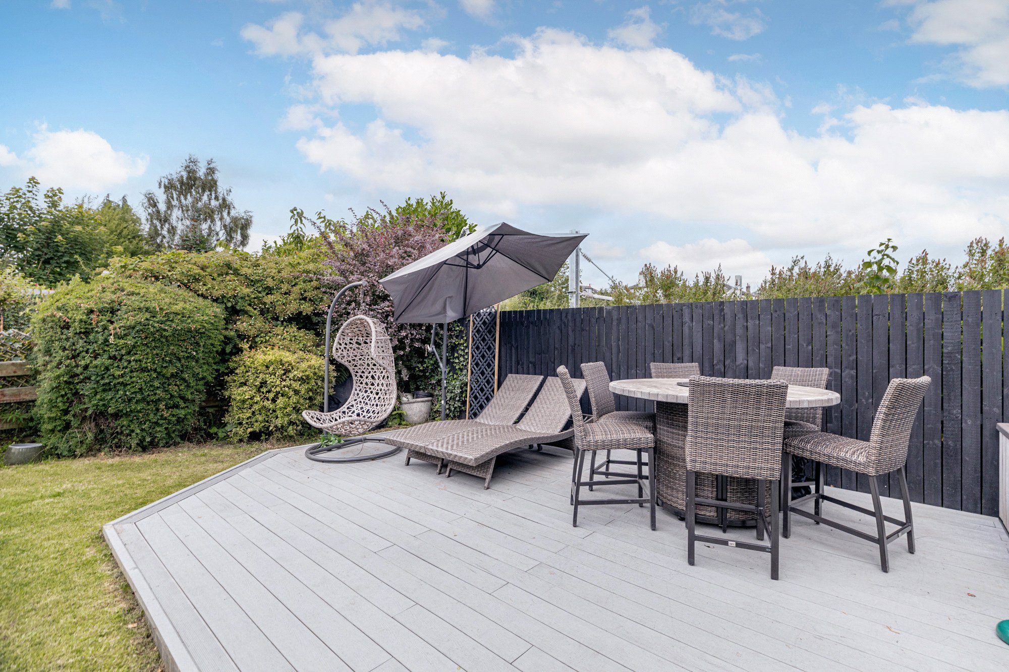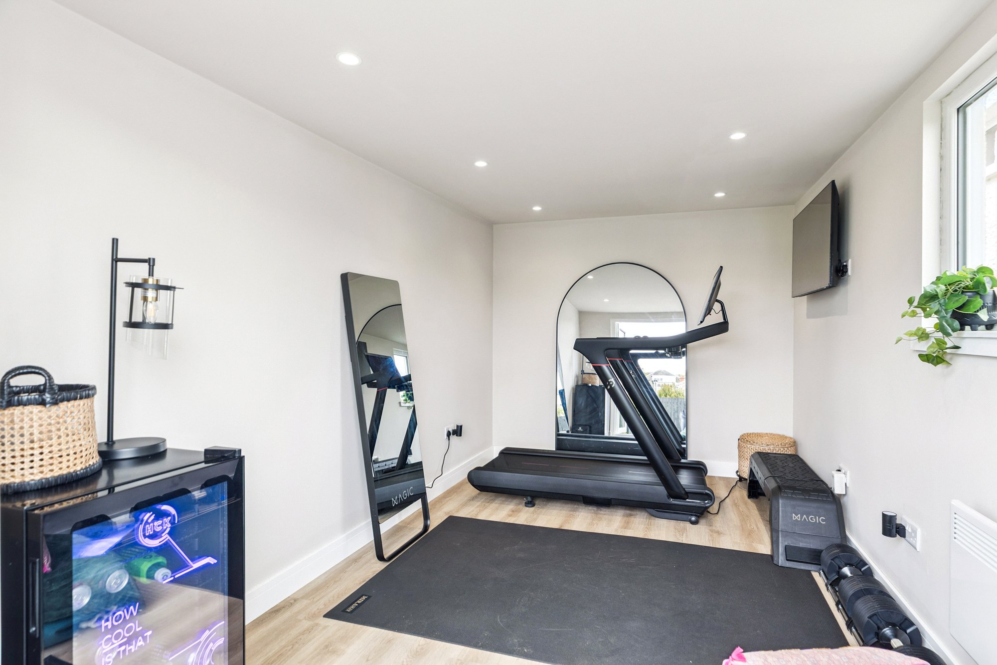 Externally, the monoblocked driveway offers off-street parking and leads to a detached garage, partially converted to create a flexible studio space with French doors, while still retaining front storage. The generous rear garden is mostly laid to lawn with a decked terrace—ideal for al fresco dining and entertaining.