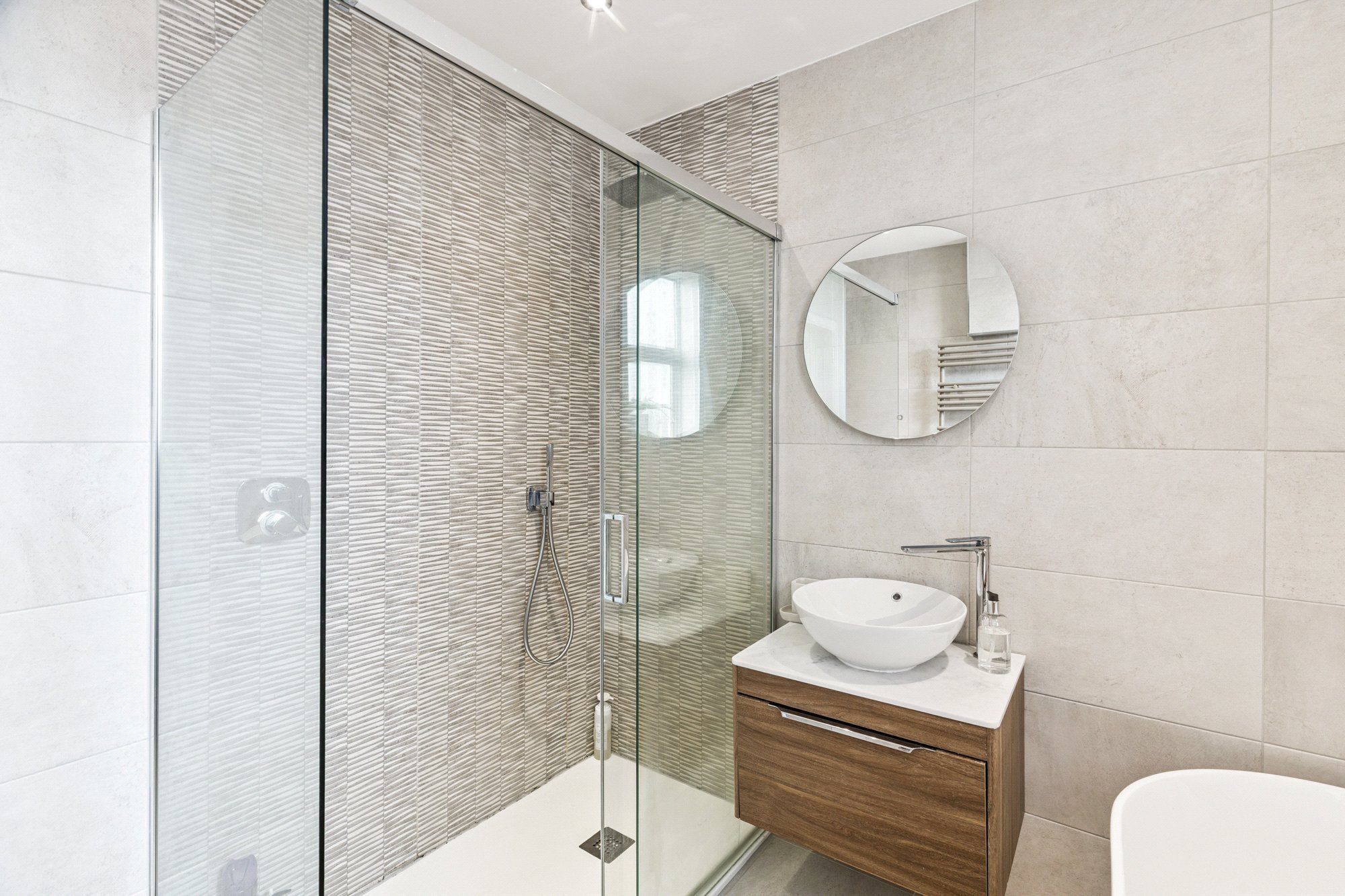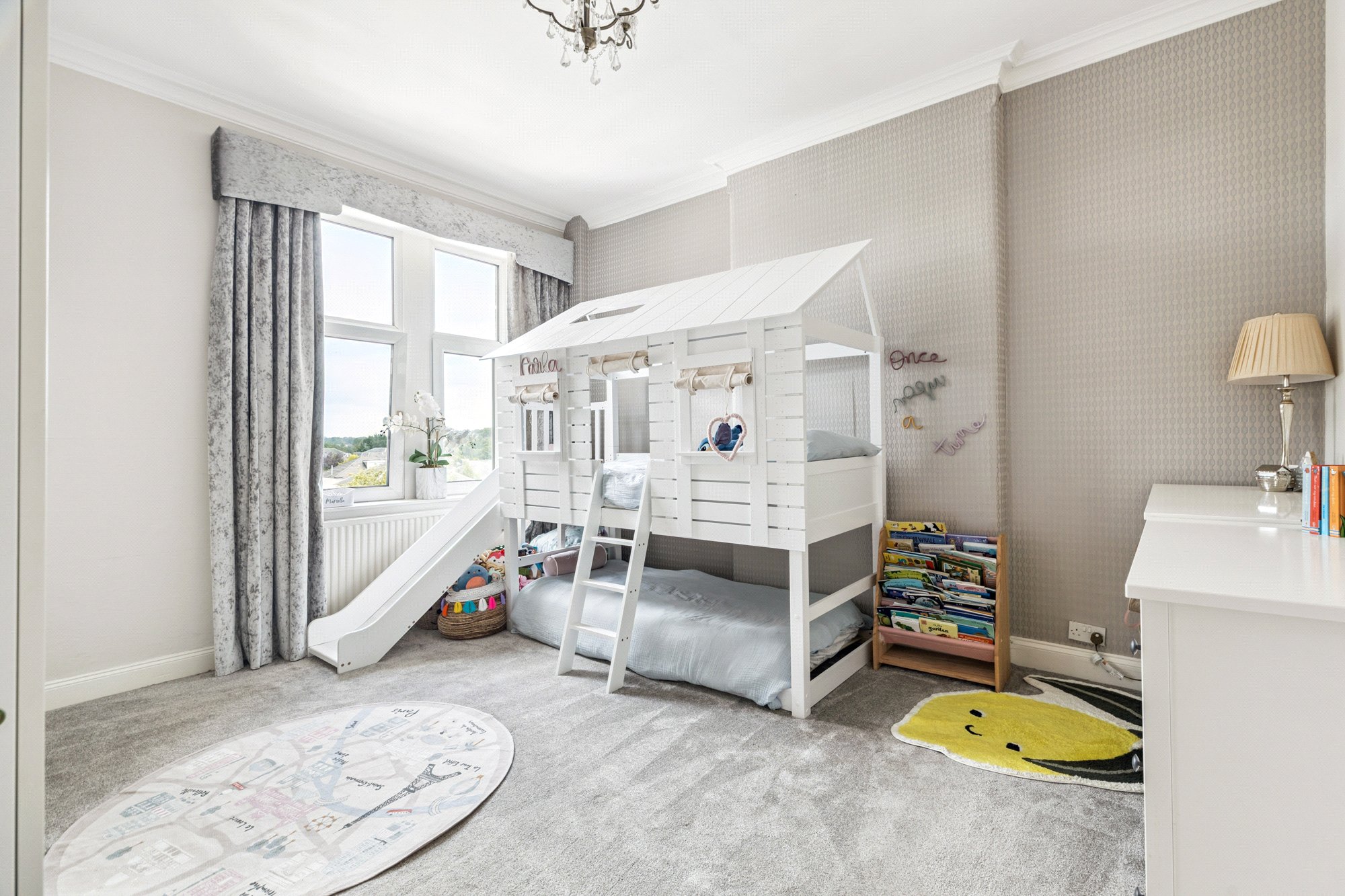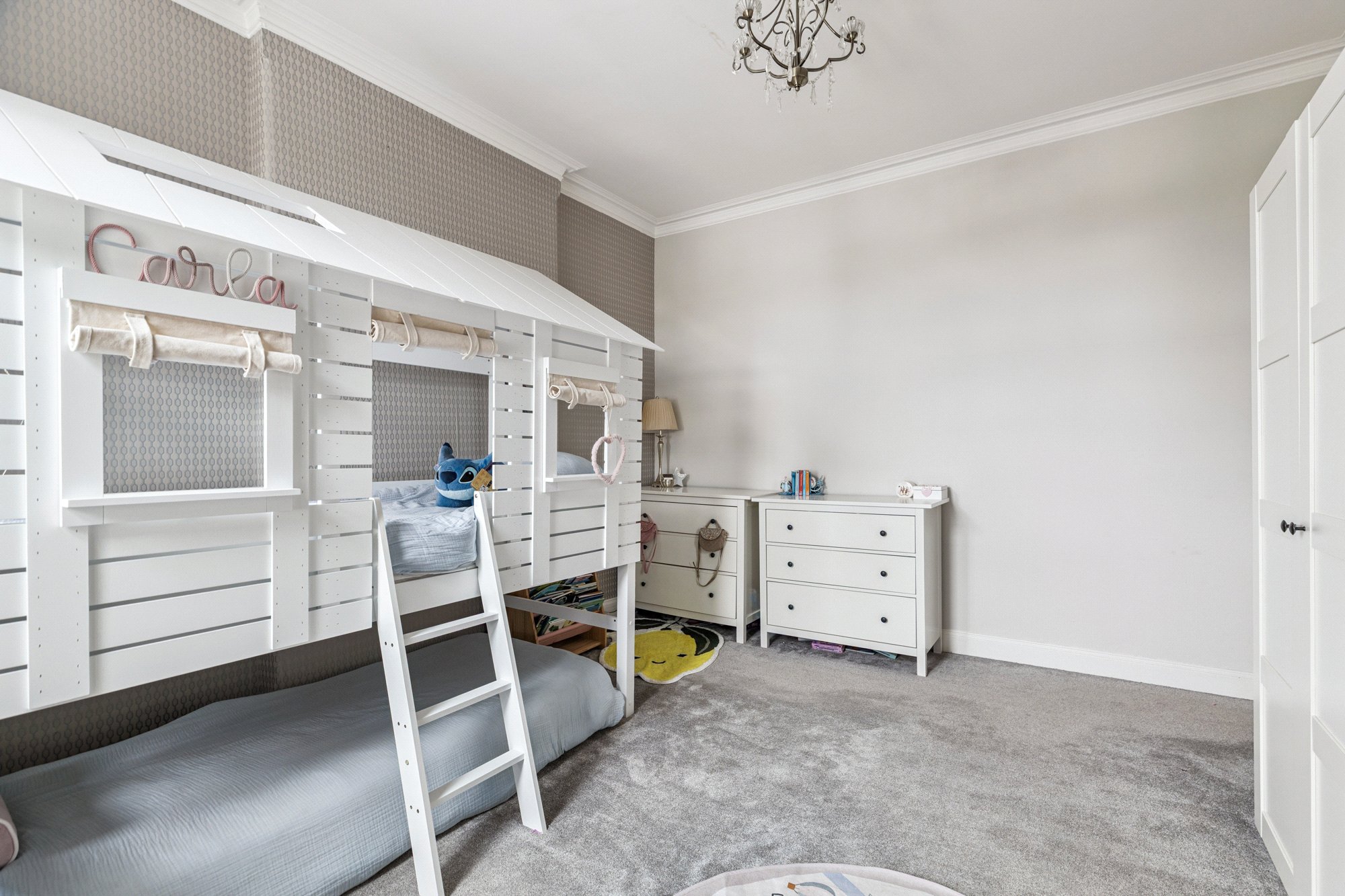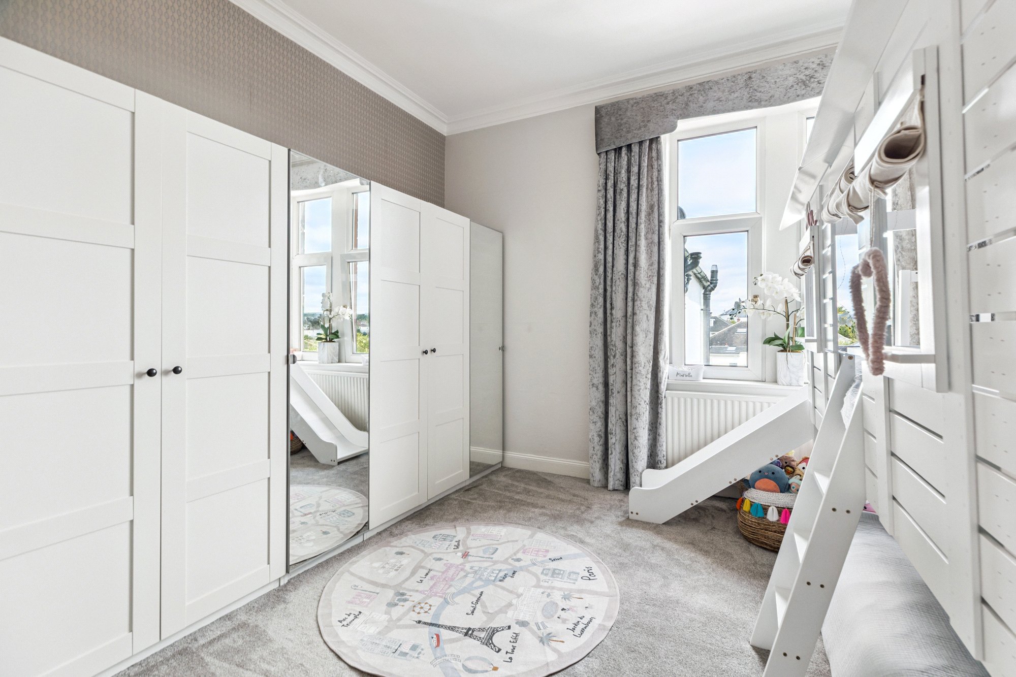 Upstairs, a broad landing provides access to four well-proportioned bedrooms. The bay-windowed principal bedroom enjoys open outlooks over St Ann’s, while two additional double bedrooms and a fourth room—ideal as a study or nursery—overlook the rear garden. A luxurious family bathroom features a roll-top bath, walk-in shower, and high-end fittings throughout.