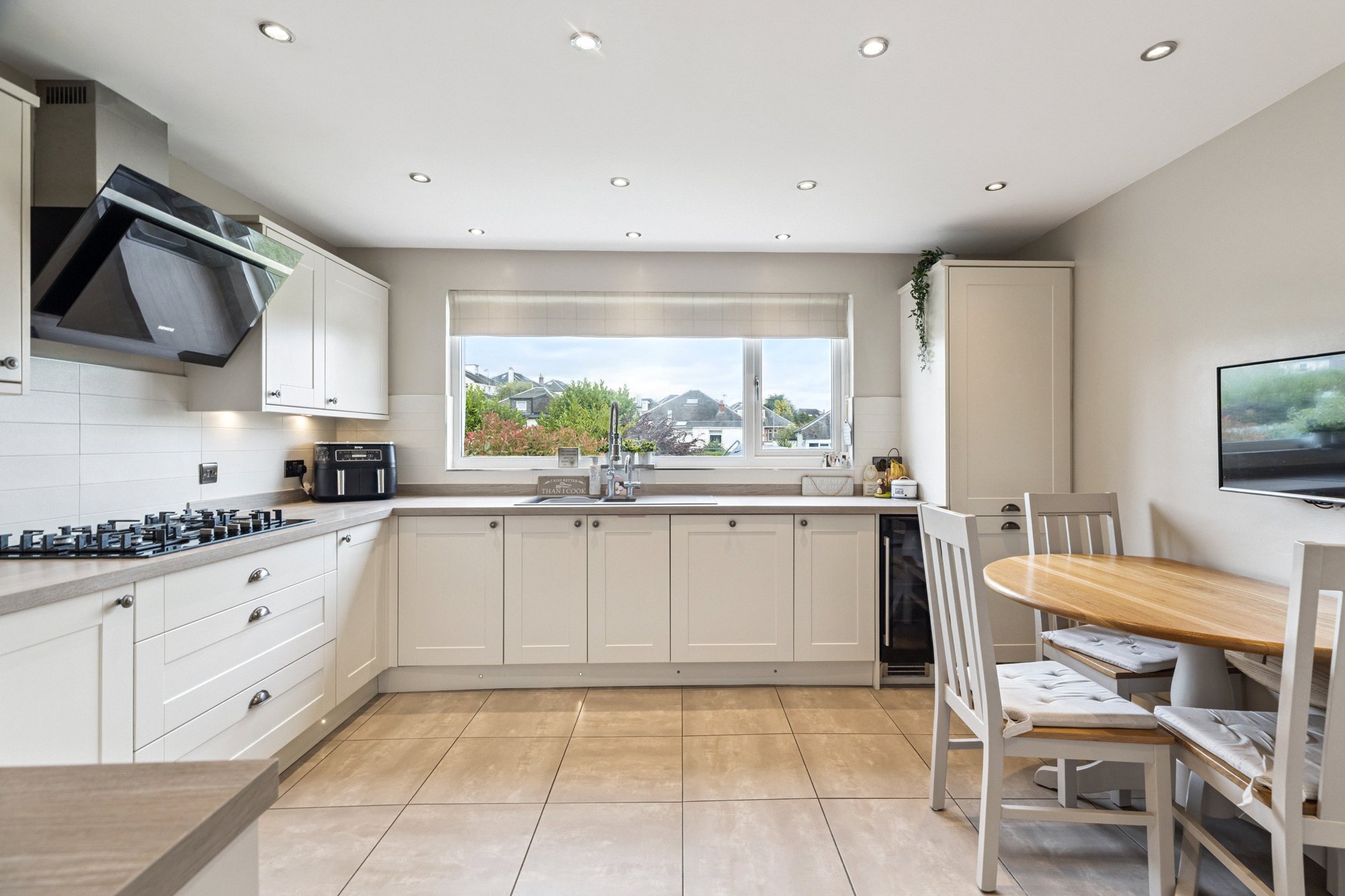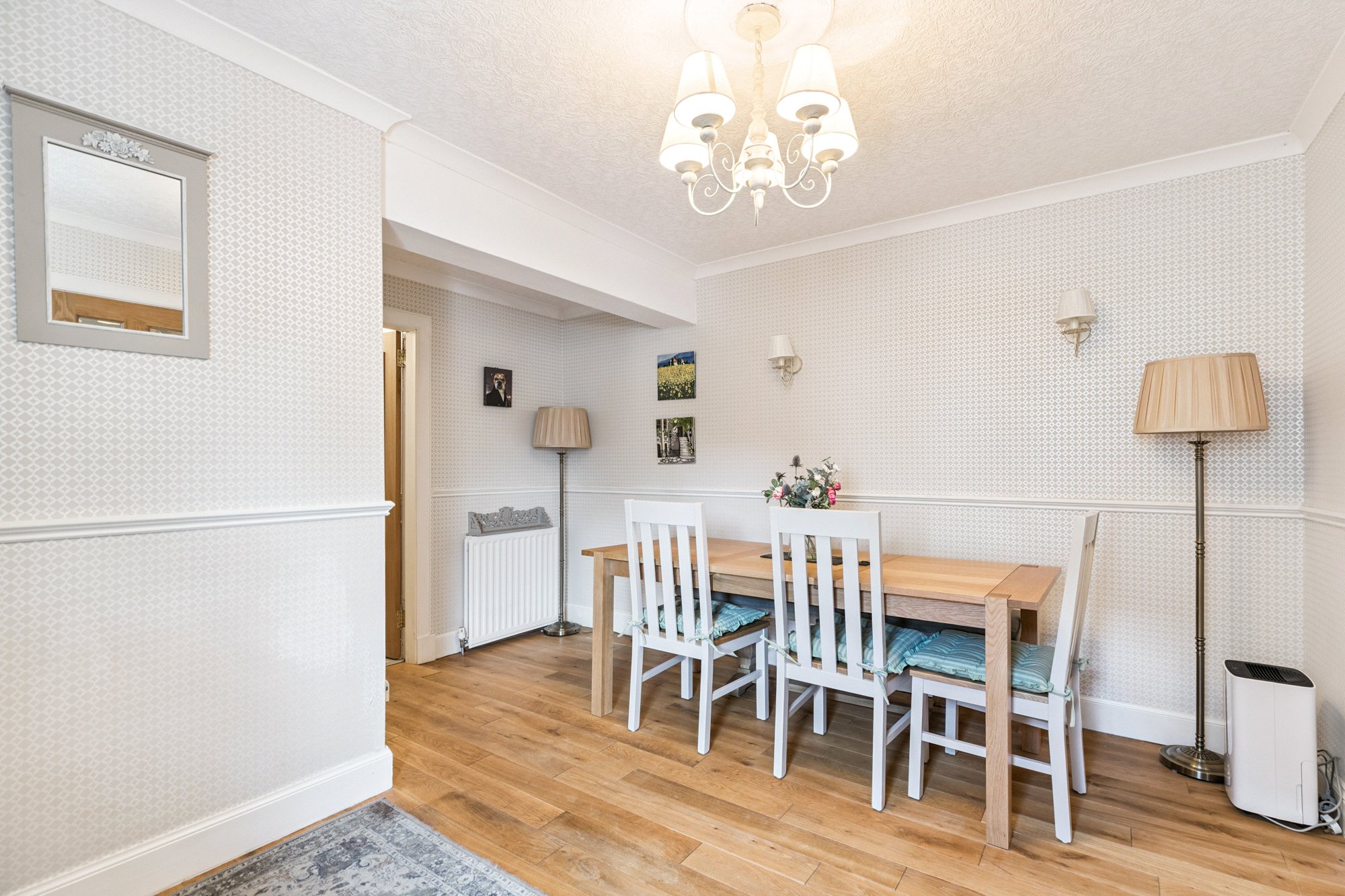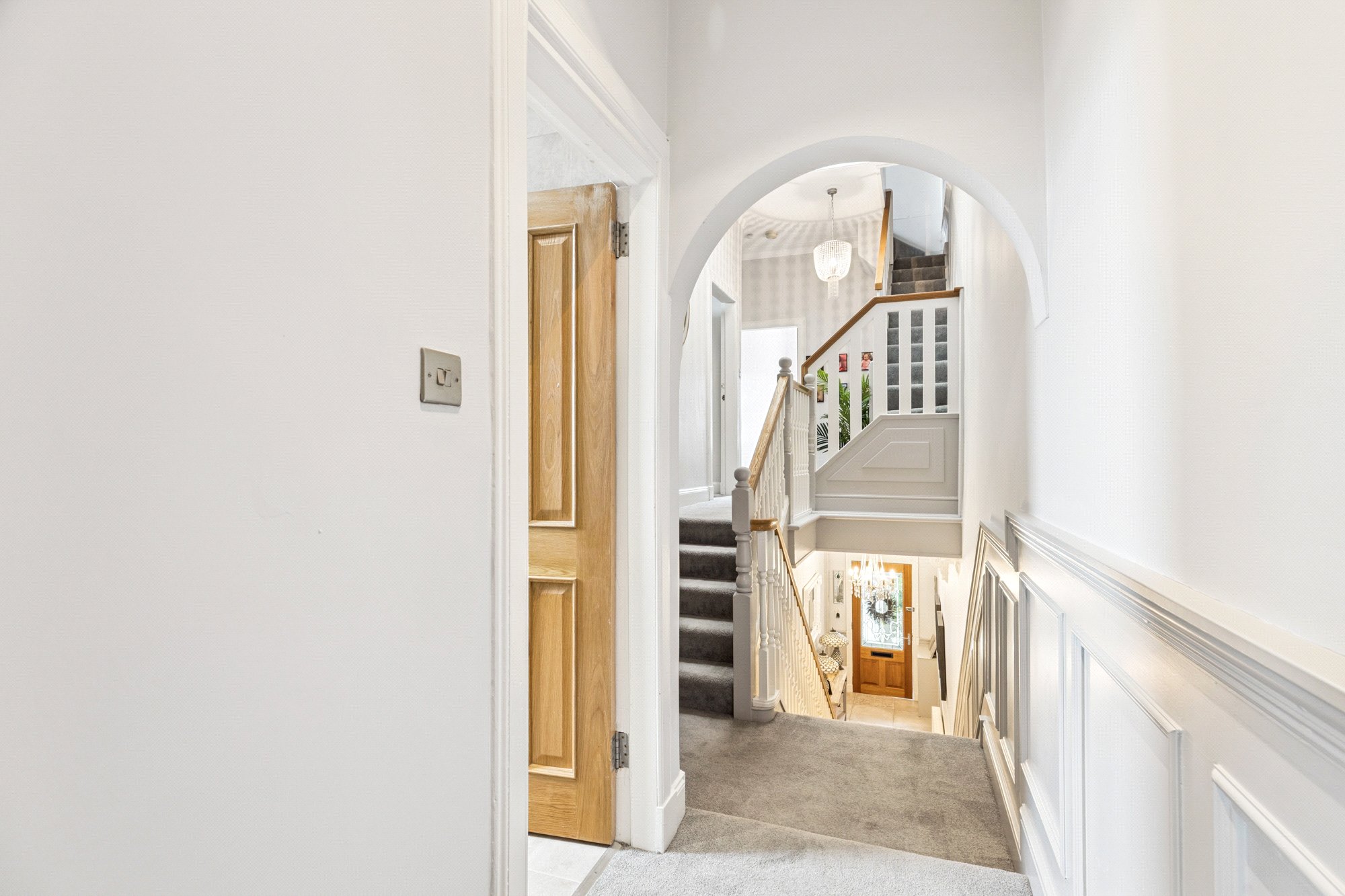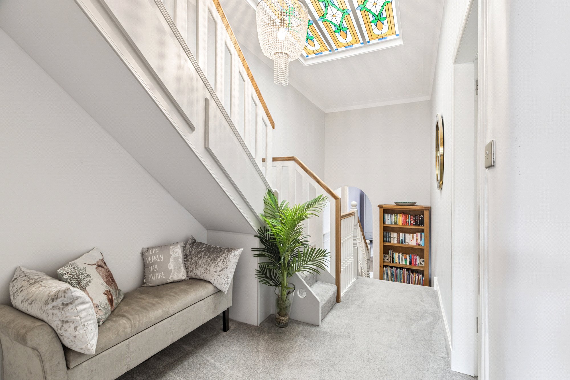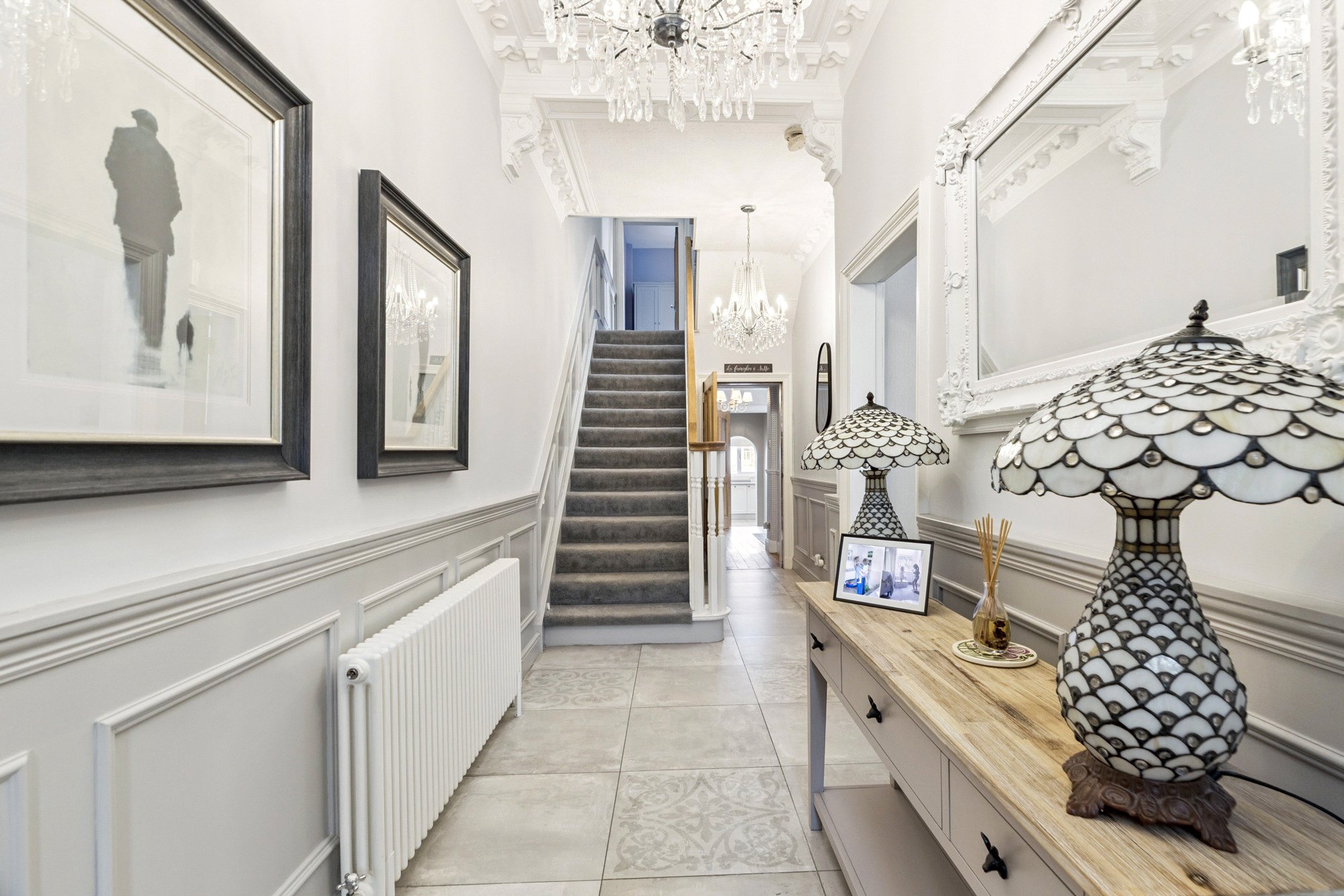 A welcoming entrance vestibule leads into a striking tiled reception hallway with understair storage and a sweeping staircase to the upper level. To the front, the elegant bay-windowed lounge is enhanced by an original fireplace and intricate ceiling cornicing. To the rear, a bright and spacious family room offers peaceful garden views. The stylish dining/morning room flows into a well-appointed kitchen, fitted with a range of wall and base units, complementary worktops, and ample space for a breakfast table. A guest WC, cloakroom, and separate utility room complete the ground floor.