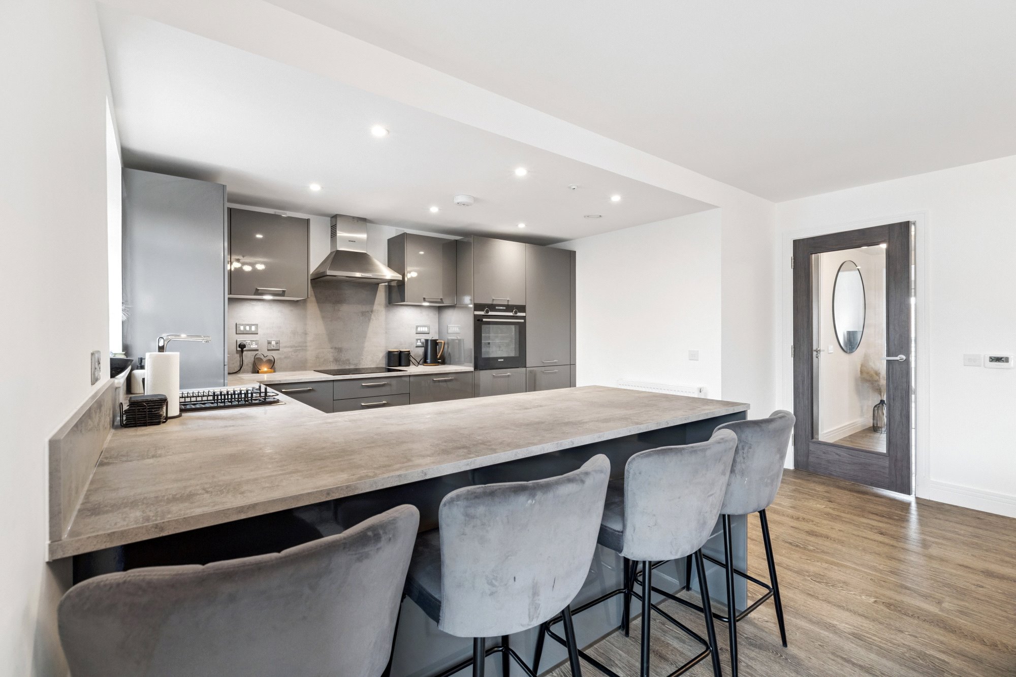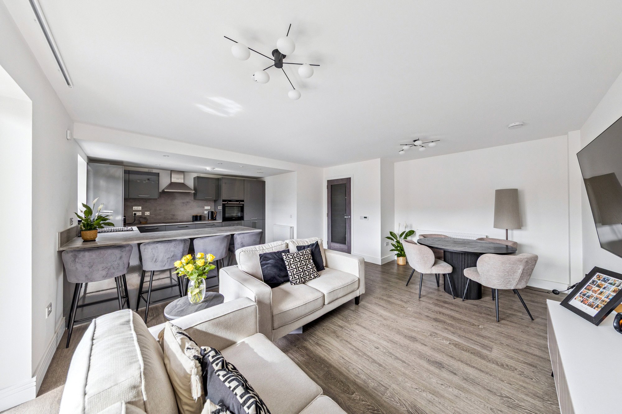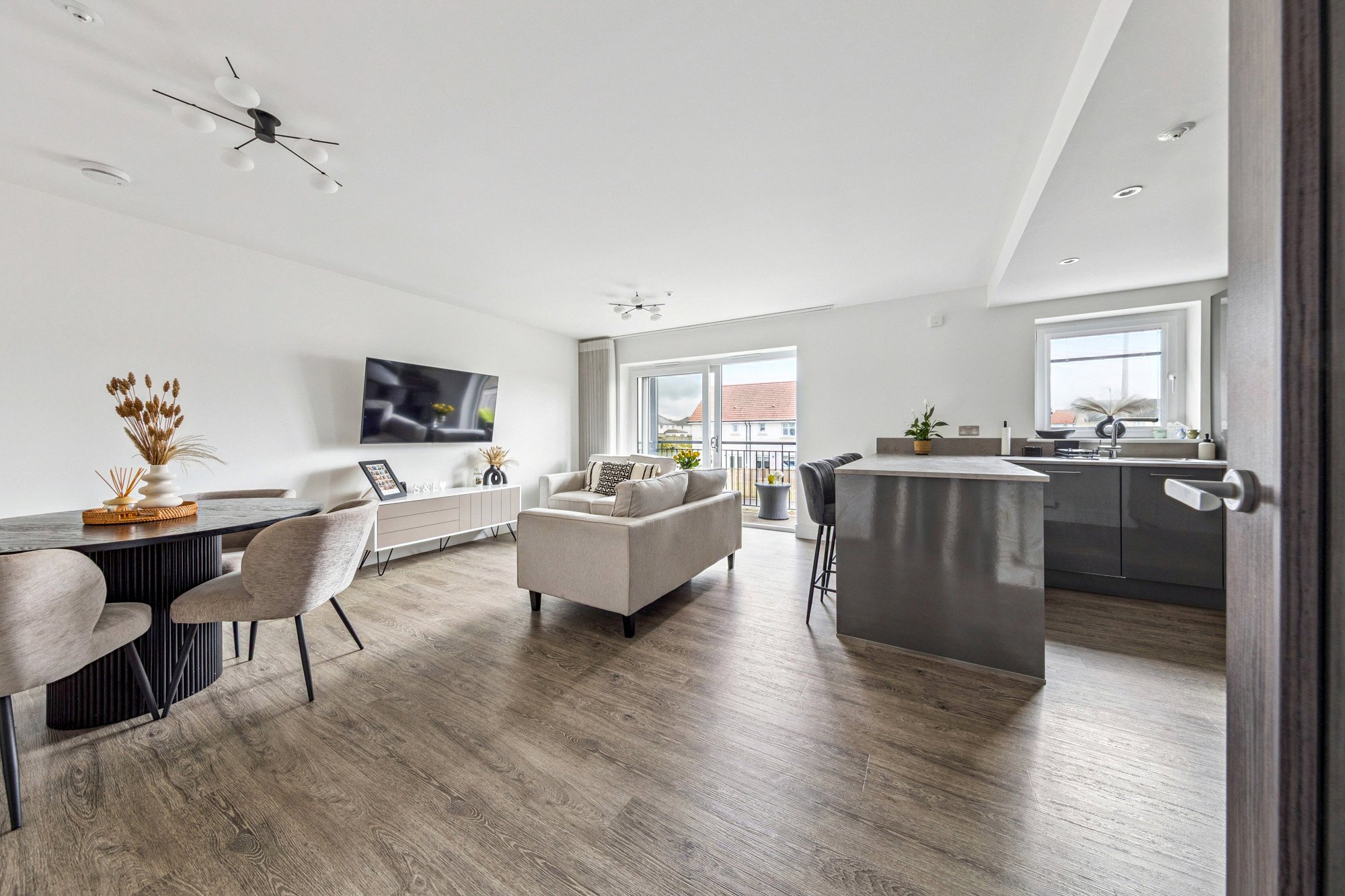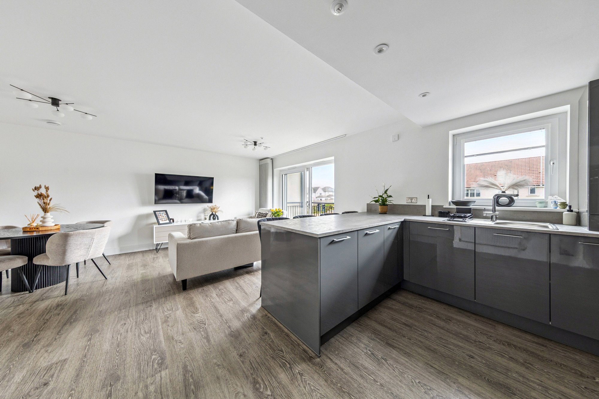 The property enjoys a bright and spacious layout with high-quality finishes throughout. Upon entering, the welcoming reception hall offers generous storage, including a utility cupboard. The impressive lounge and dining area is bathed in natural light, with French doors opening onto a private balcony - perfect for relaxing or entertaining. The space flows seamlessly into the well-appointed breakfasting kitchen by Silver Birch, featuring a range of wall and base units, complementary worktops, a breakfast bar, and Siemens appliances. The principal bedroom benefits from fitted wardrobes and a stylish ensuite shower room, while the second double bedroom also includes fitted storage. A modern three-piece bathroom with window completes the accommodation. High-quality Amtico flooring extends through the principal rooms, adding both elegance and durability.