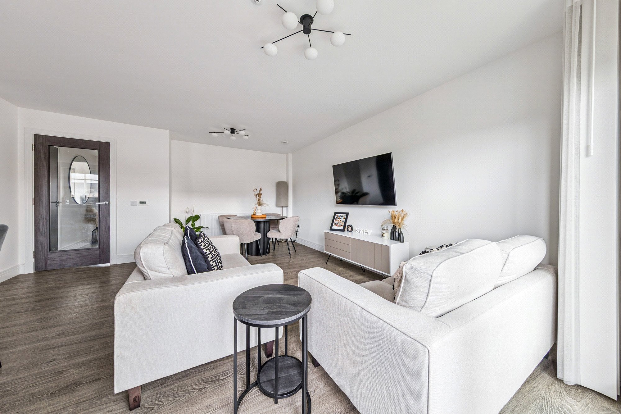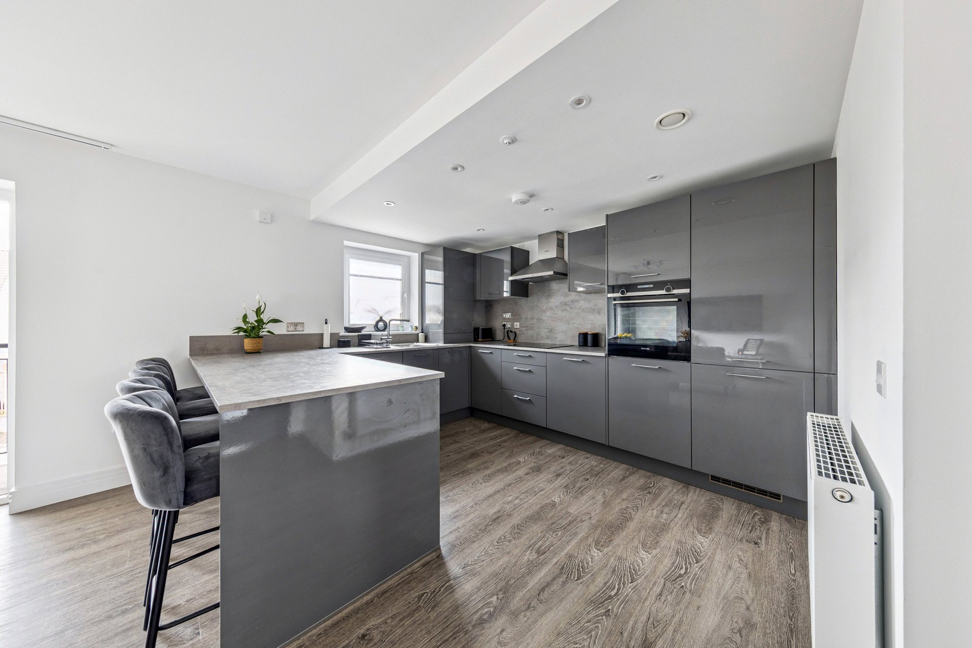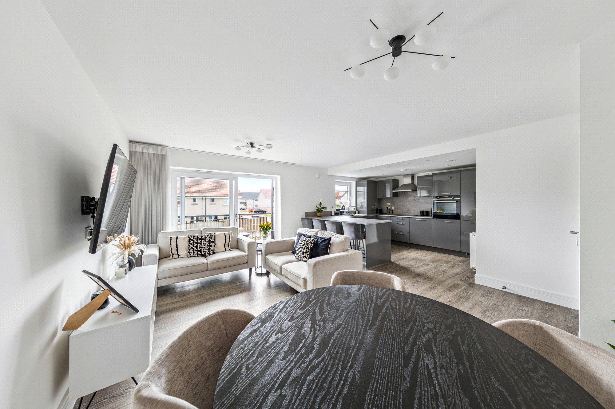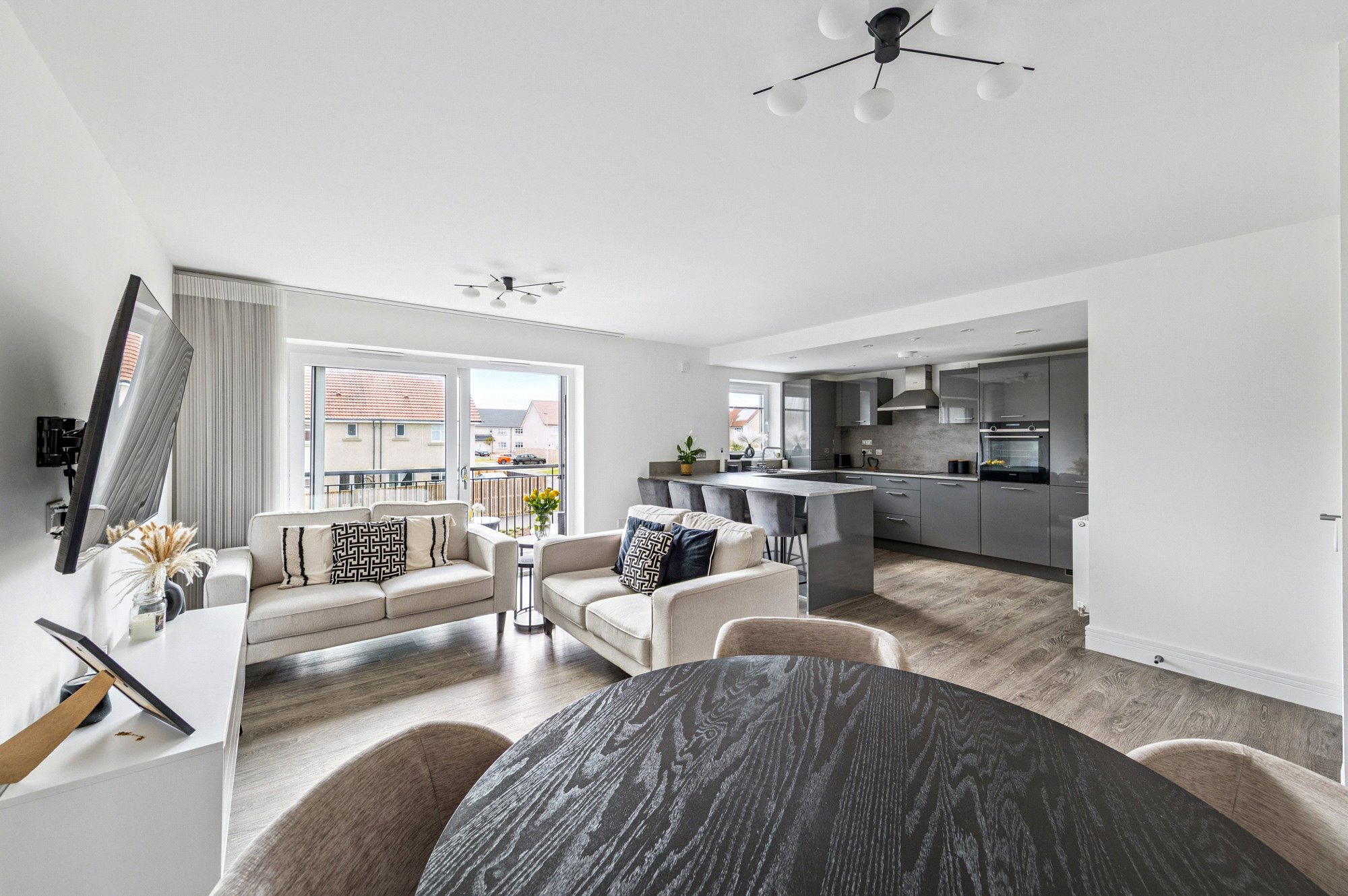 The property enjoys a bright and spacious layout with high-quality finishes throughout. Upon entering, the welcoming reception hall offers generous storage, including a utility cupboard. The impressive lounge and dining area is bathed in natural light, with French doors opening onto a private balcony - perfect for relaxing or entertaining. The space flows seamlessly into the well-appointed breakfasting kitchen by Silver Birch, featuring a range of wall and base units, complementary worktops, a breakfast bar, and Siemens appliances. The principal bedroom benefits from fitted wardrobes and a stylish ensuite shower room, while the second double bedroom also includes fitted storage. A modern three-piece bathroom with window completes the accommodation. High-quality Amtico flooring extends through the principal rooms, adding both elegance and durability.