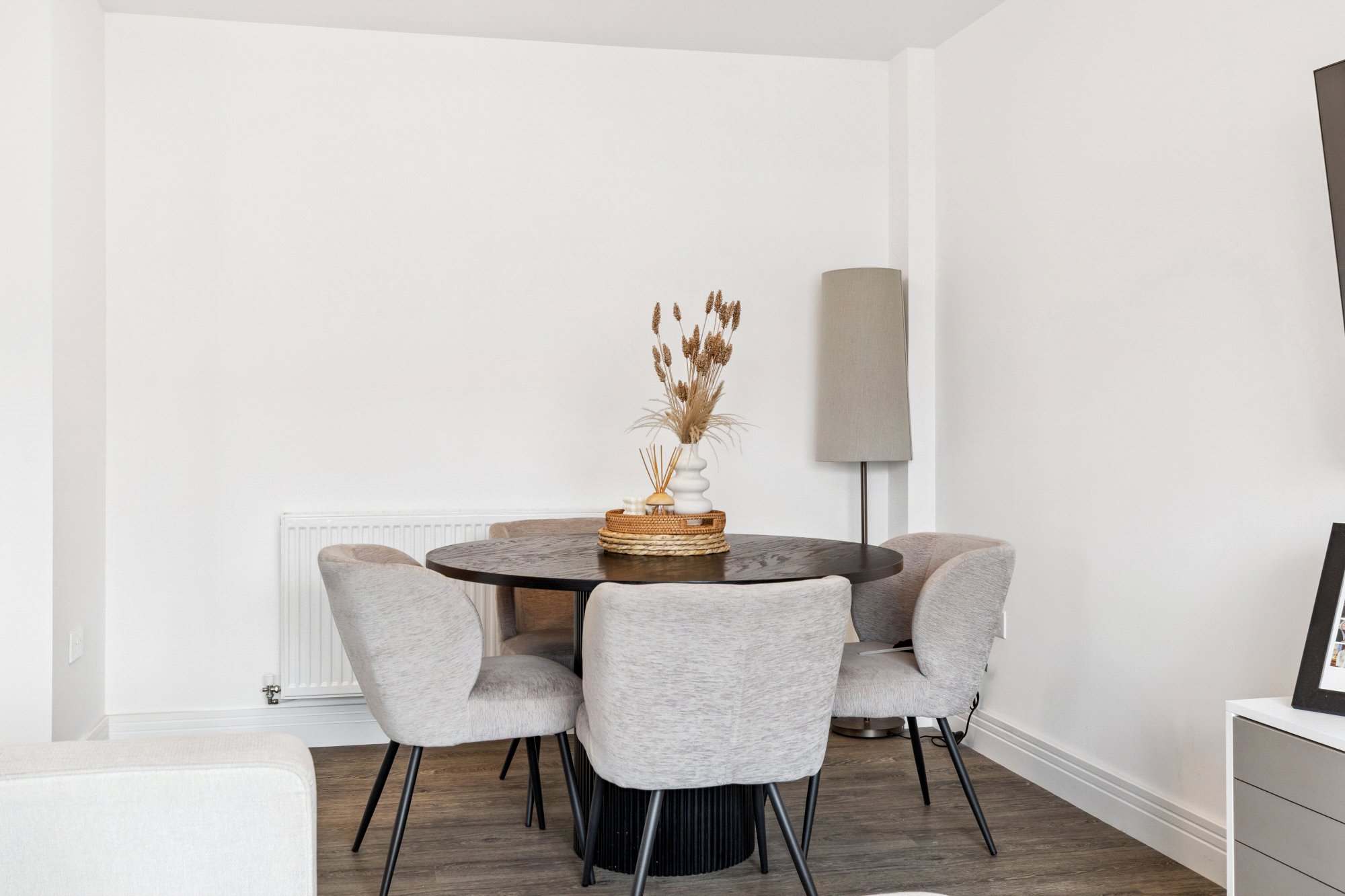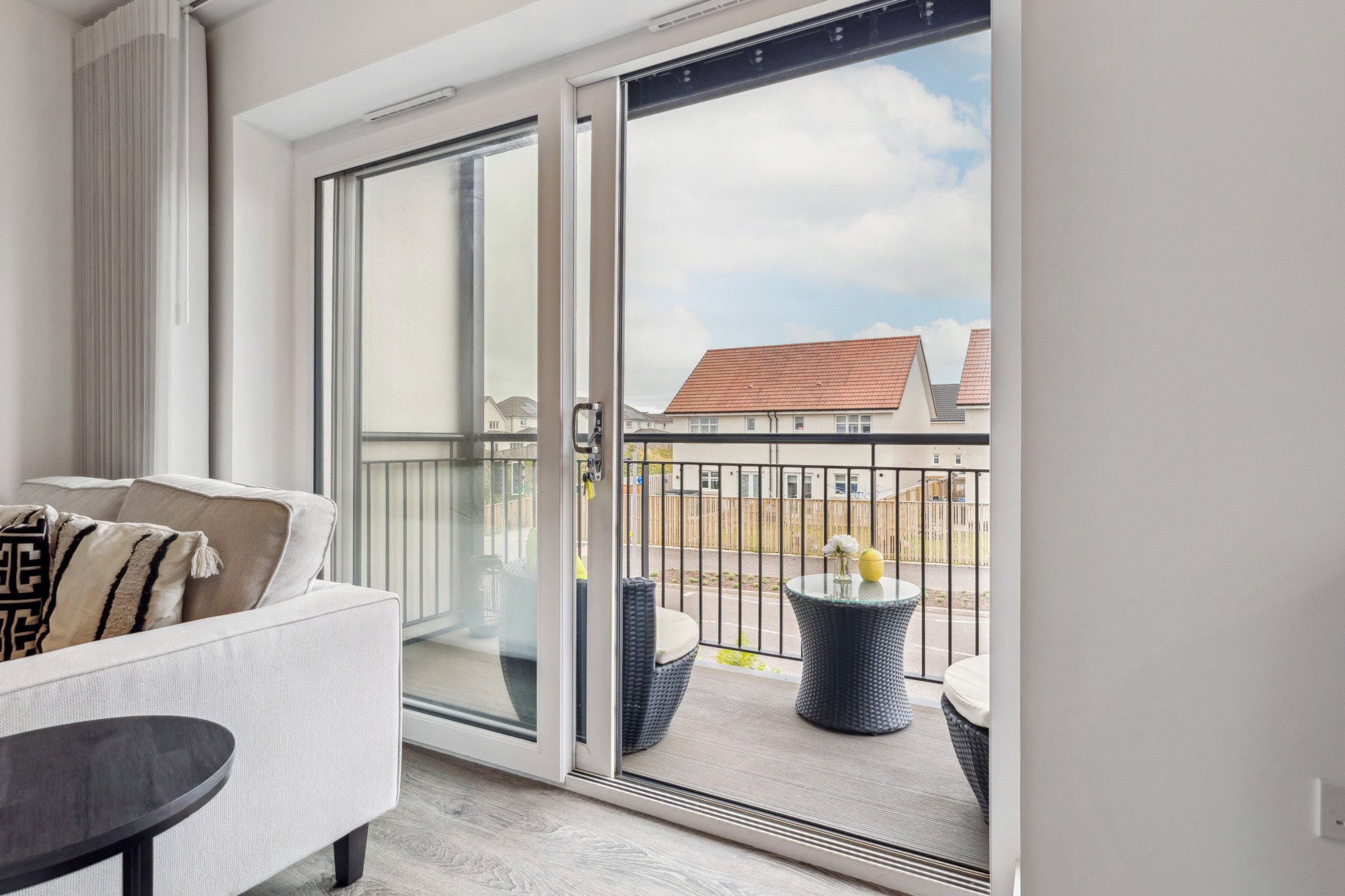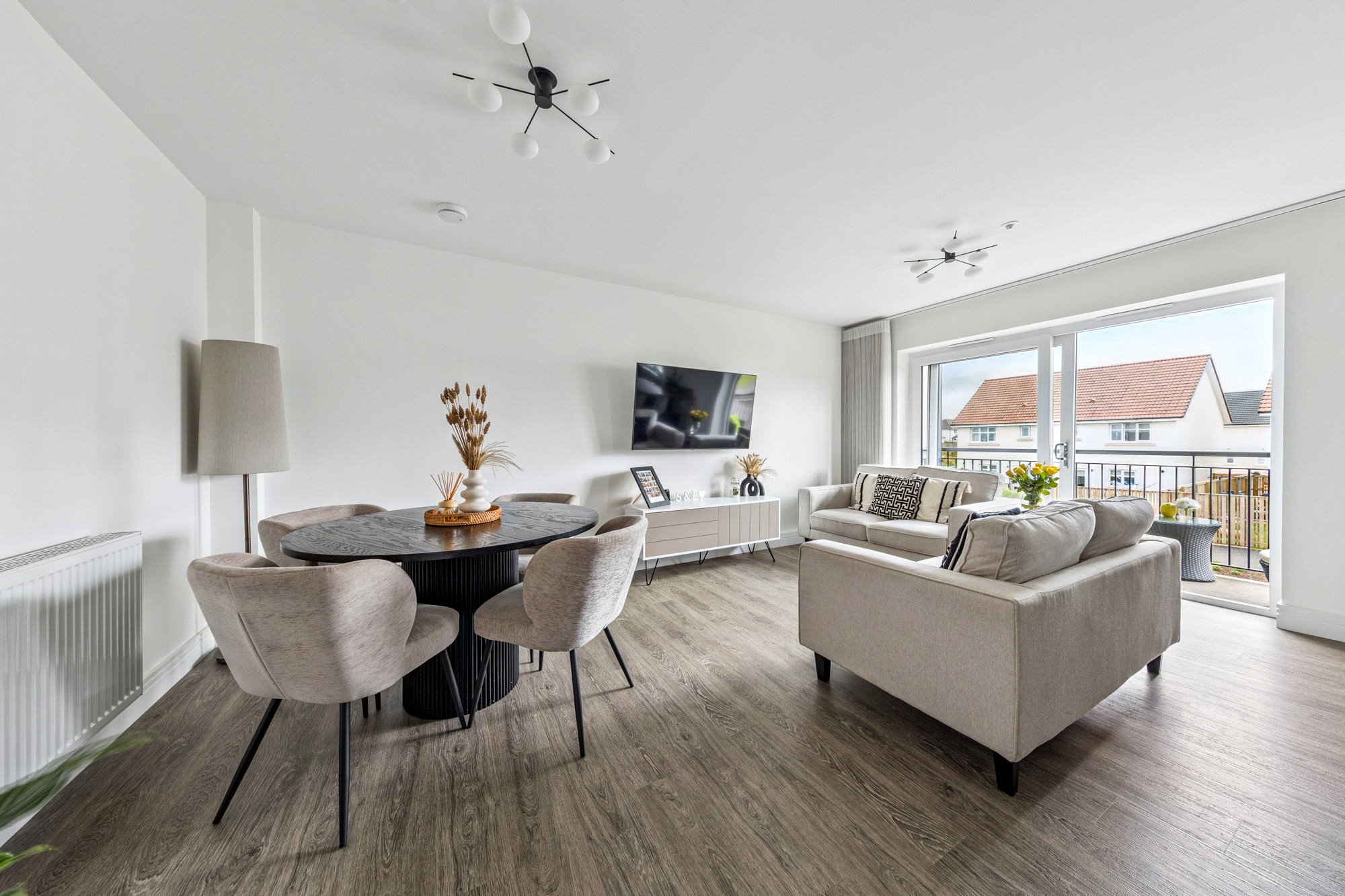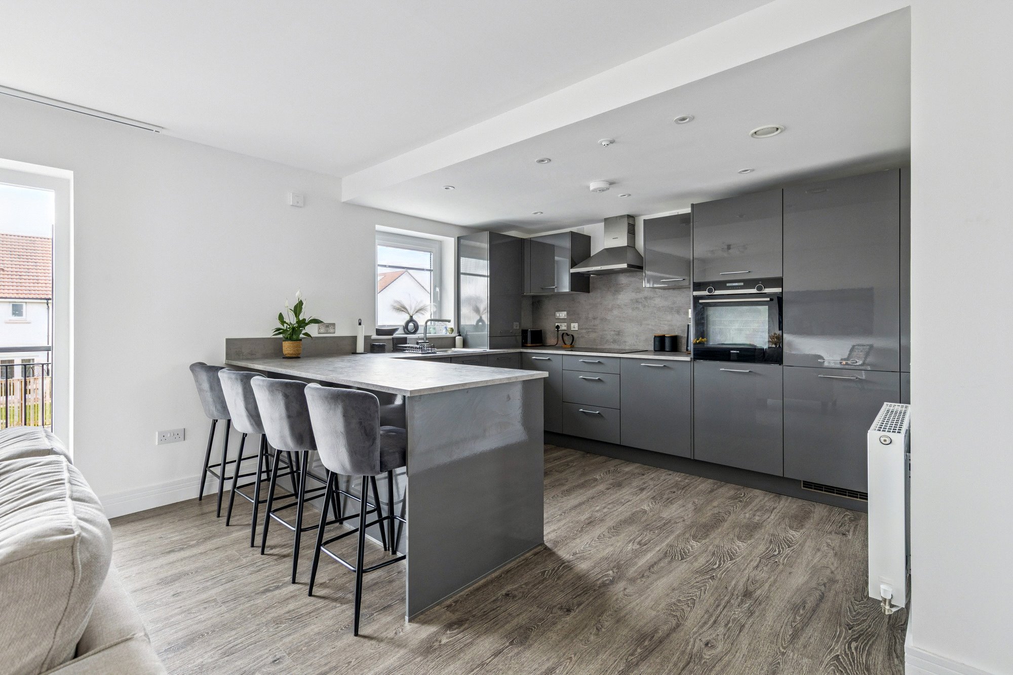 The property enjoys a bright and spacious layout with high-quality finishes throughout. Upon entering, the welcoming reception hall offers generous storage, including a utility cupboard. The impressive lounge and dining area is bathed in natural light, with French doors opening onto a private balcony - perfect for relaxing or entertaining. The space flows seamlessly into the well-appointed breakfasting kitchen by Silver Birch, featuring a range of wall and base units, complementary worktops, a breakfast bar, and Siemens appliances. The principal bedroom benefits from fitted wardrobes and a stylish ensuite shower room, while the second double bedroom also includes fitted storage. A modern three-piece bathroom with window completes the accommodation. High-quality Amtico flooring extends through the principal rooms, adding both elegance and durability.