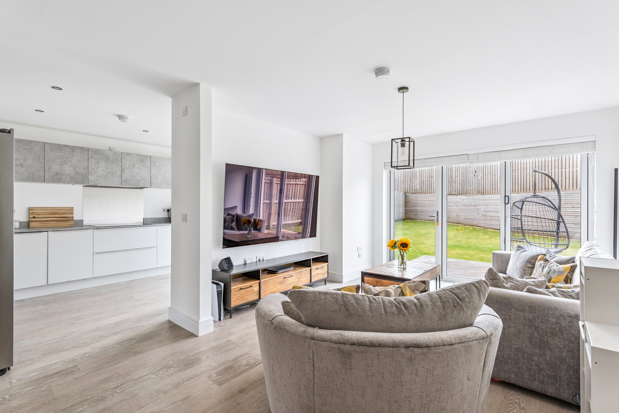 The welcoming entrance hallway gives access to a cloakroom/WC and the main ground floor living areas. To the rear, the property showcases a bright and spacious open-plan kitchen, dining, and family zone—perfectly suited to modern family life. The kitchen is partially separated by a feature wall and fitted with an excellent selection of floor and wall units along with generous worktop space. A useful storage cupboard sits beneath the staircase. Large bi-fold doors extend the living space out into the garden, flooding the area with natural light and providing seamless indoor-outdoor living.