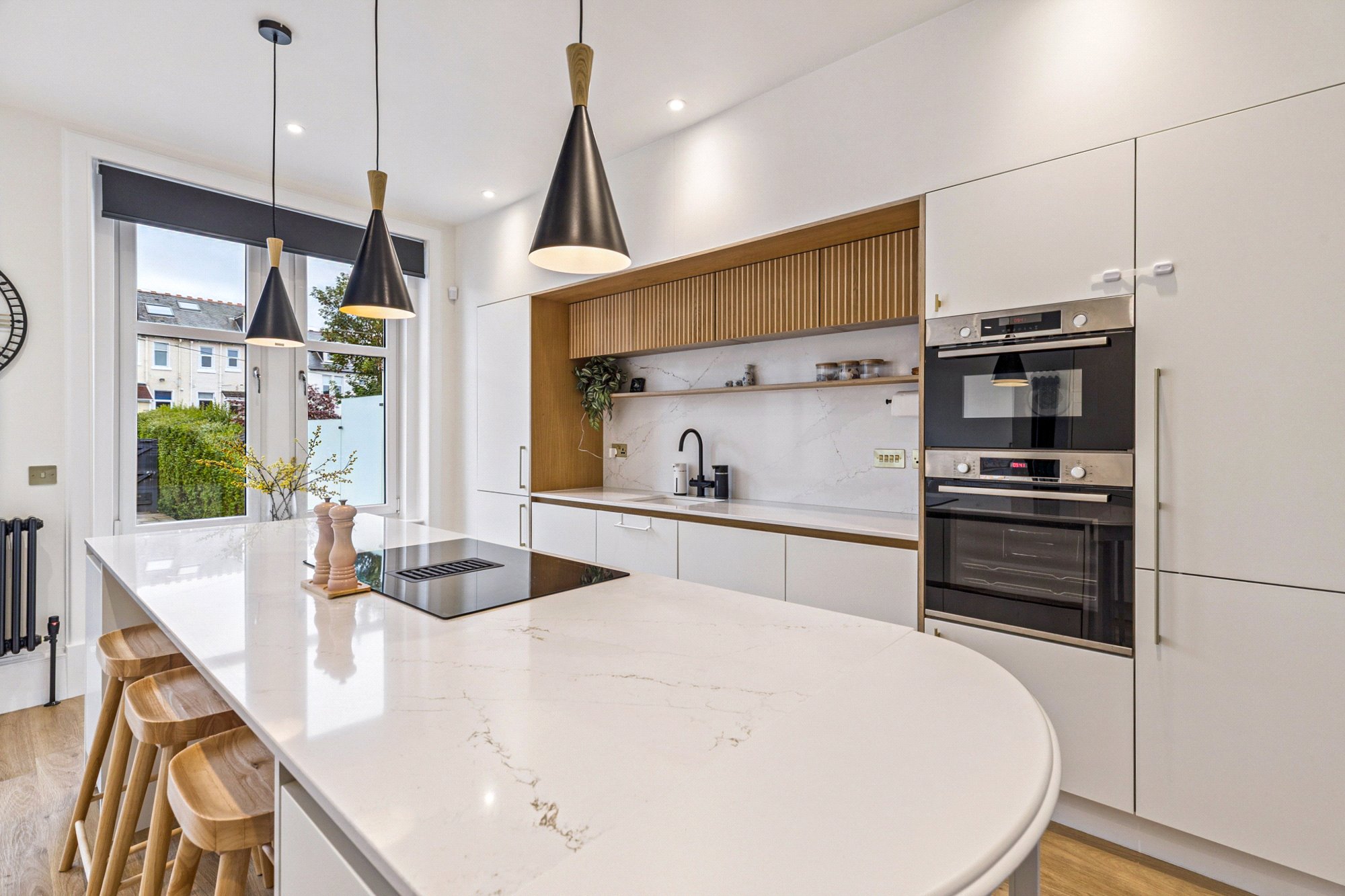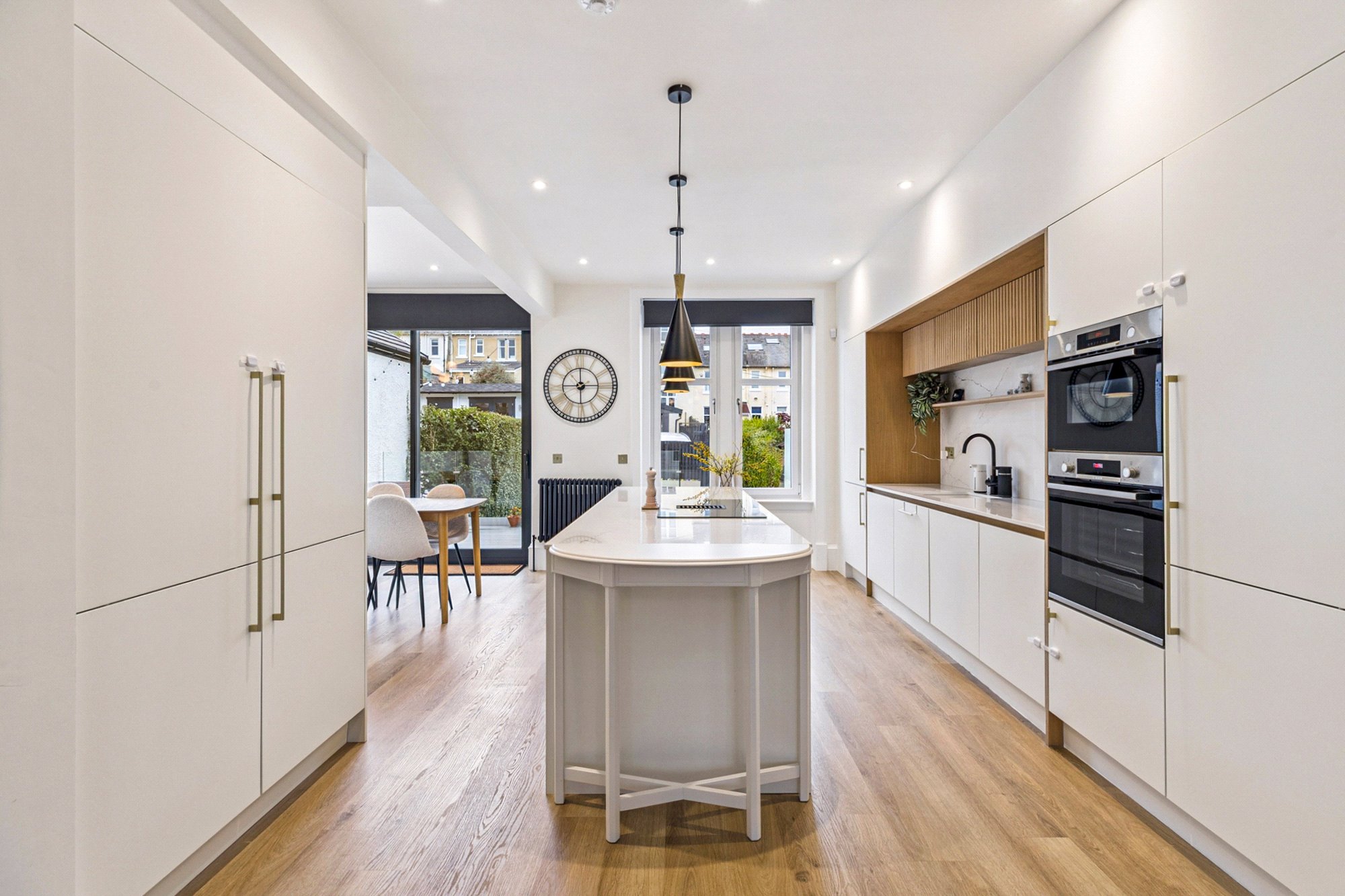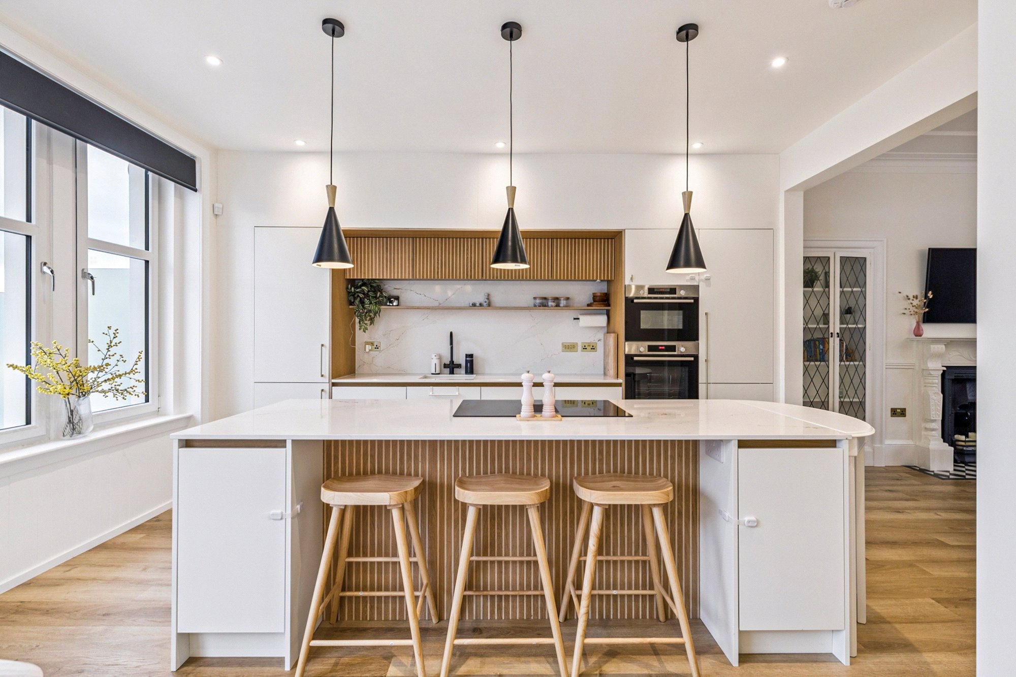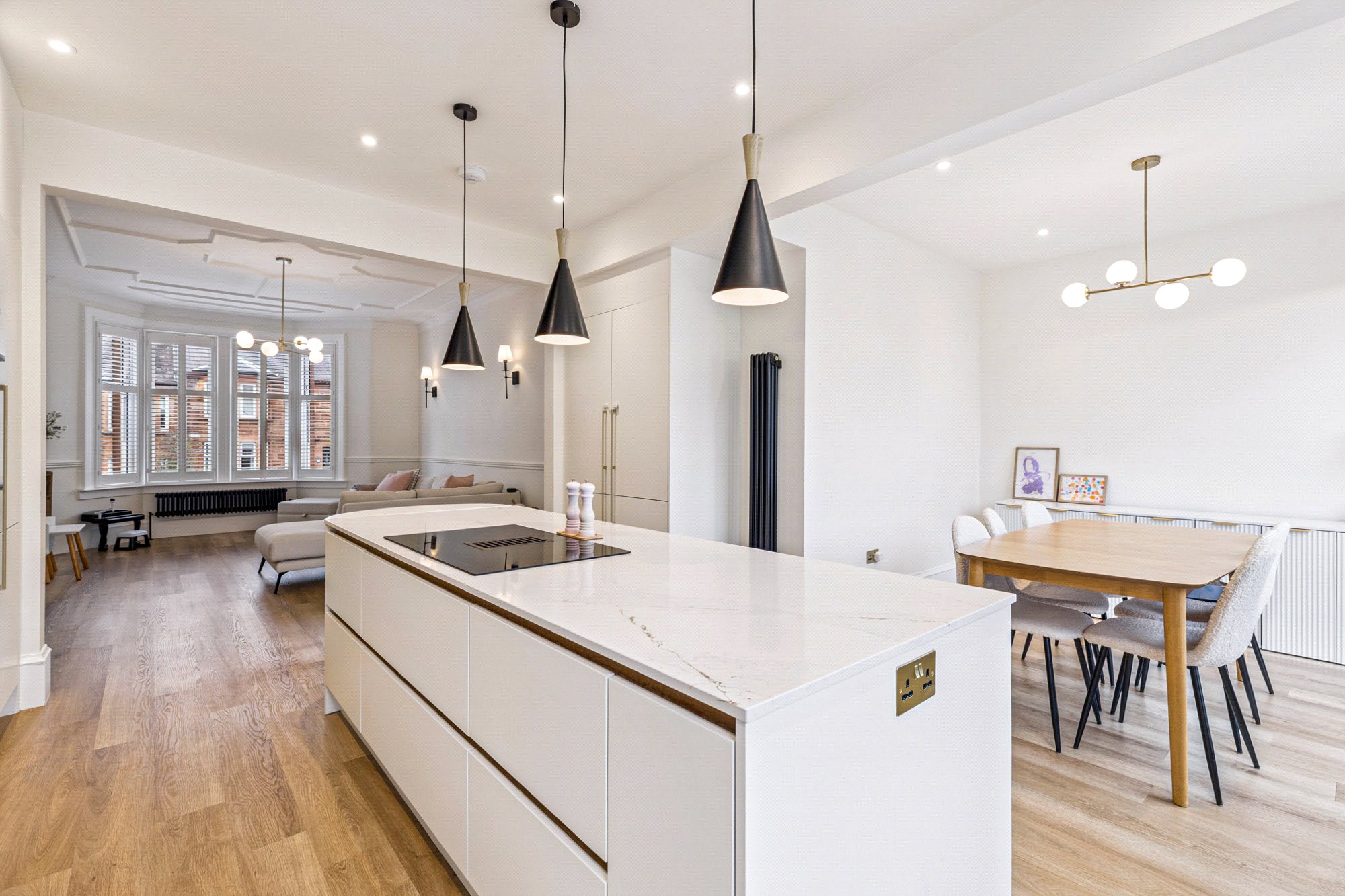 The accommodation begins with a welcoming vestibule and hallway, giving access to a guest WC and utility cupboard. At the heart of the home is the magnificent open-plan lounge, kitchen, and dining room. The lounge features a charming bay window and fireplace, while the contemporary kitchen is a bespoke Caddisfly design, complete with a Silestone worktop, vented downdraft induction hob, boiling tap, central island, integrated appliances and a breakfasting bar. The dining area is ideal for both family living and entertaining, with sliding doors opening directly onto a private decked terrace with glass balustrade overlooking the rear garden.
