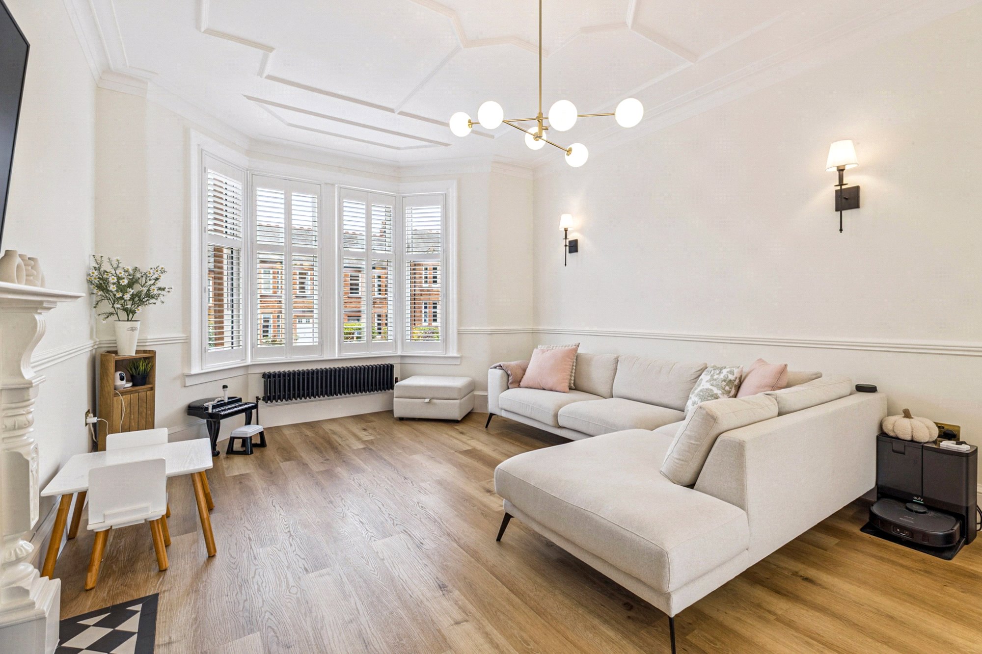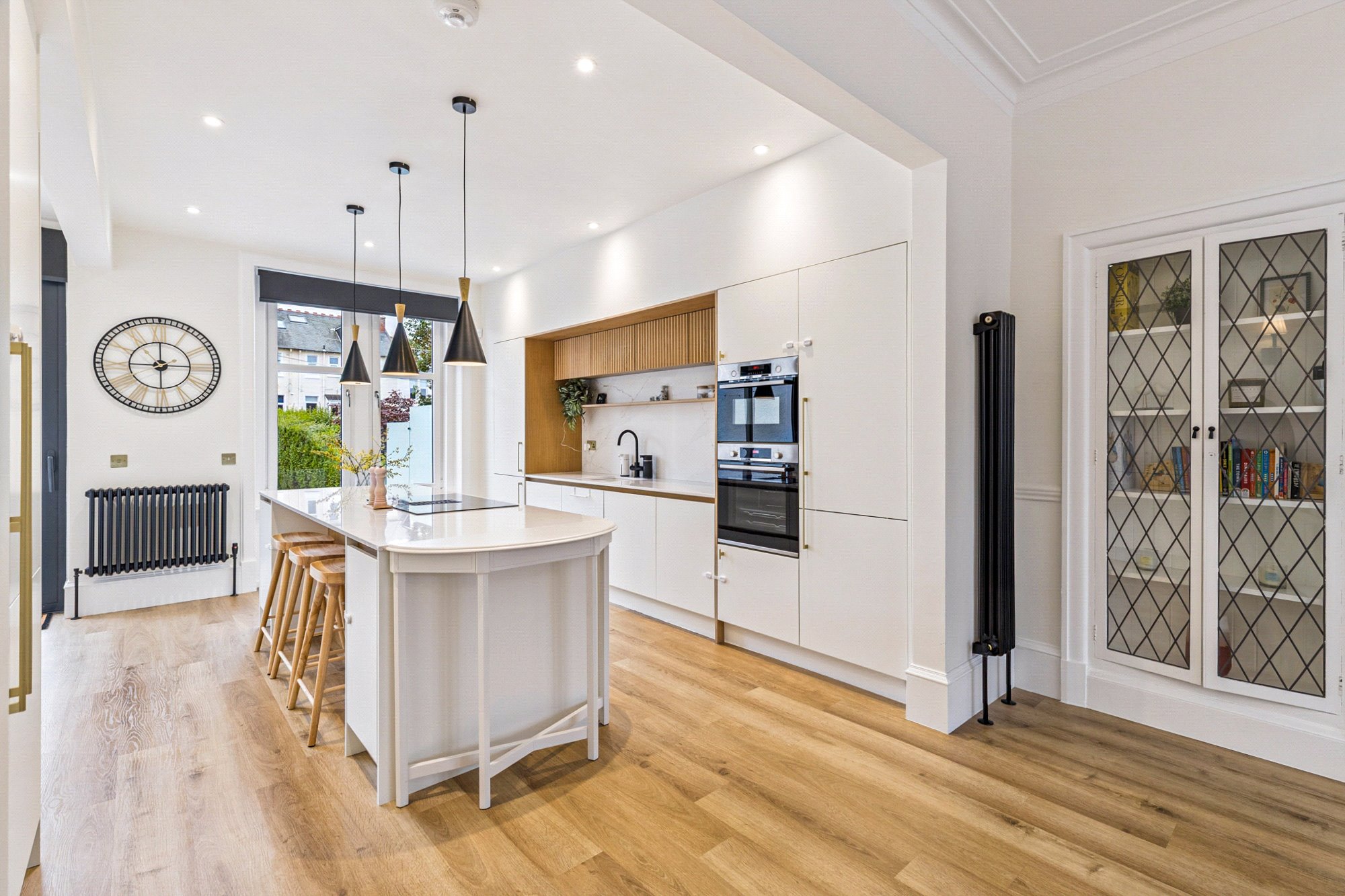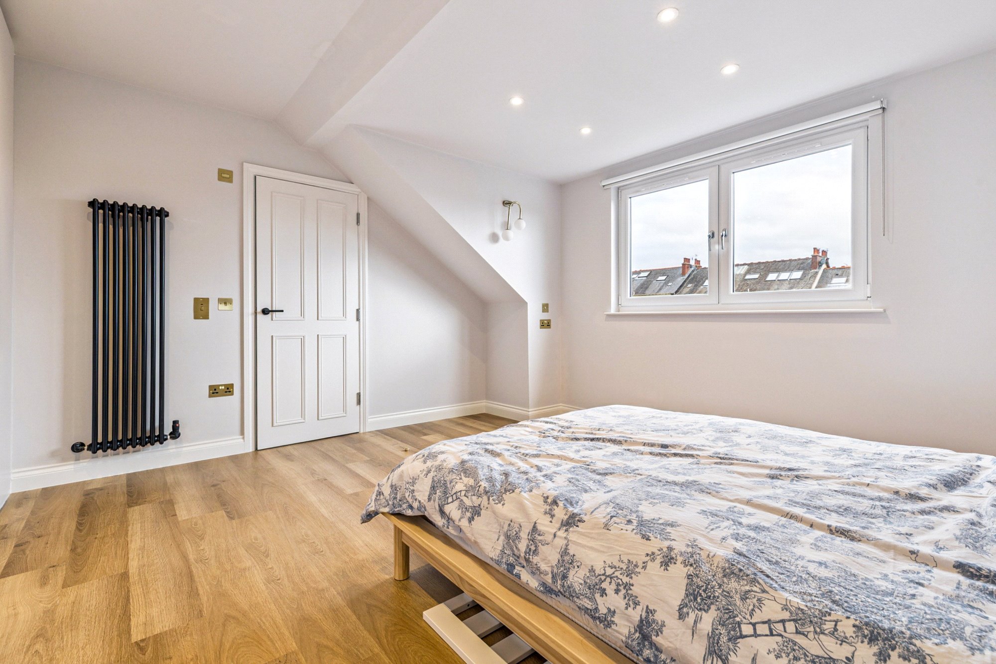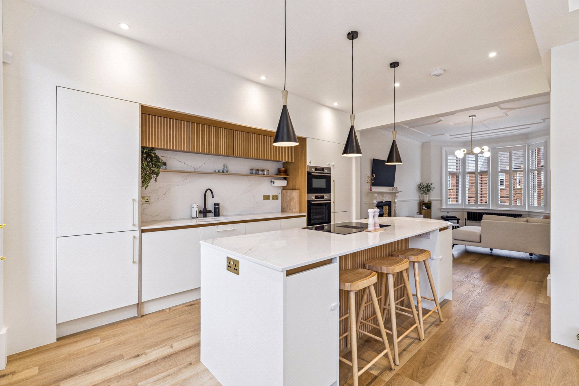 On the first floor, a spacious landing gives access to three well-proportioned bedrooms. Bedroom two enjoys a bay window and fitted wardrobes, while bedroom three overlooks the rear garden. Bedroom four provides flexibility as a home office or nursery. The luxurious family bathroom is finished to an exceptional standard with large porcelain tiles from Mandarin Stone, featuring a freestanding bath, double vanity, separate walk-in shower, and underfloor heating for added comfort.