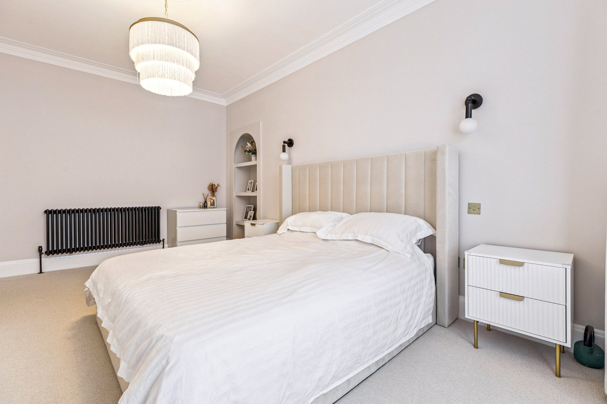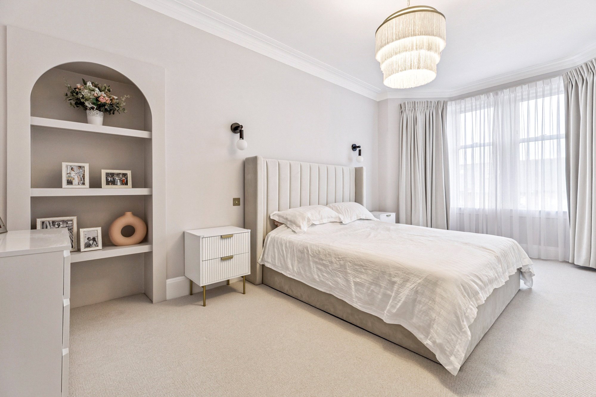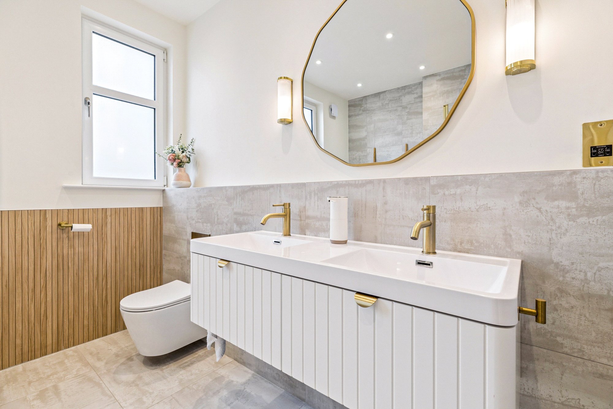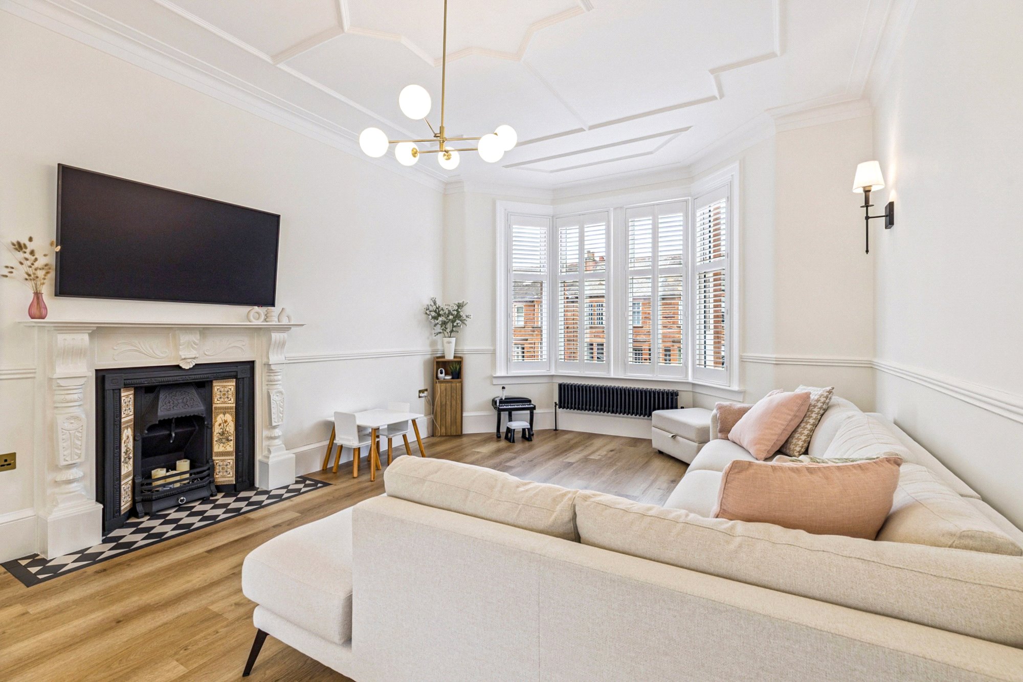 On the first floor, a spacious landing gives access to three well-proportioned bedrooms. Bedroom two enjoys a bay window and fitted wardrobes, while bedroom three overlooks the rear garden. Bedroom four provides flexibility as a home office or nursery. The luxurious family bathroom is finished to an exceptional standard with large porcelain tiles from Mandarin Stone, featuring a freestanding bath, double vanity, separate walk-in shower, and underfloor heating for added comfort.