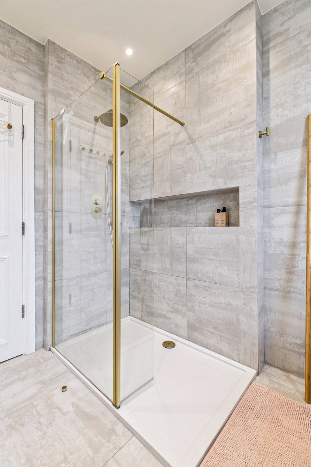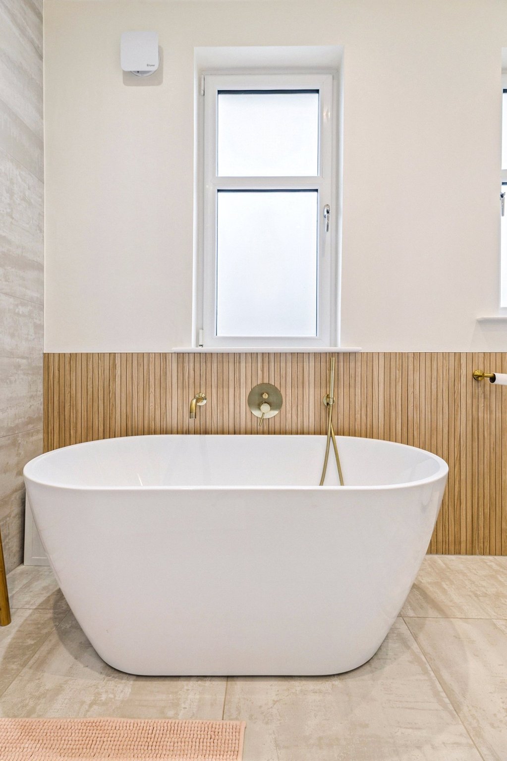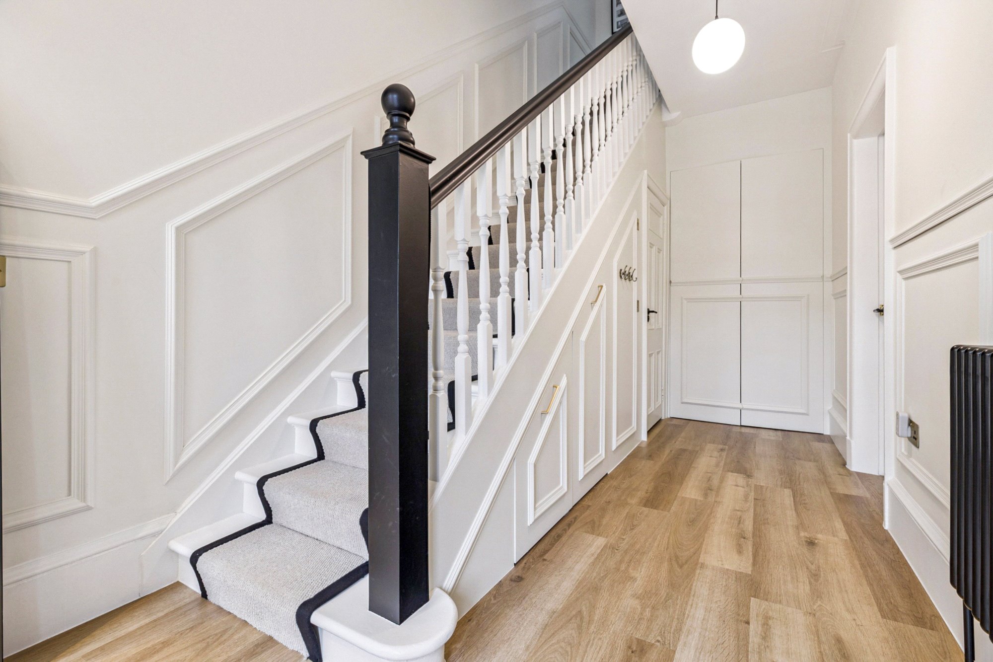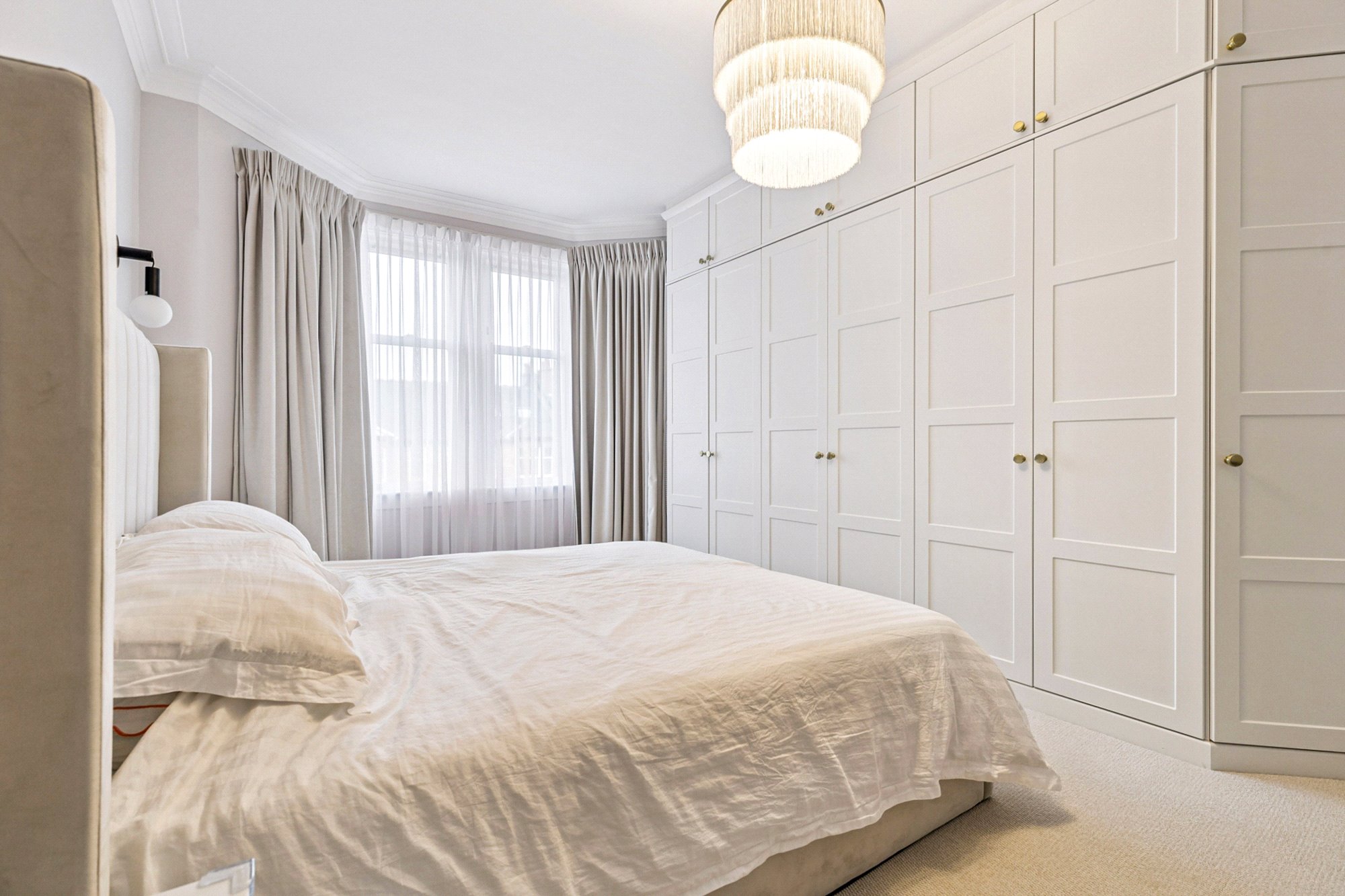 On the first floor, a spacious landing gives access to three well-proportioned bedrooms. Bedroom two enjoys a bay window and fitted wardrobes, while bedroom three overlooks the rear garden. Bedroom four provides flexibility as a home office or nursery. The luxurious family bathroom is finished to an exceptional standard with large porcelain tiles from Mandarin Stone, featuring a freestanding bath, double vanity, separate walk-in shower, and underfloor heating for added comfort.