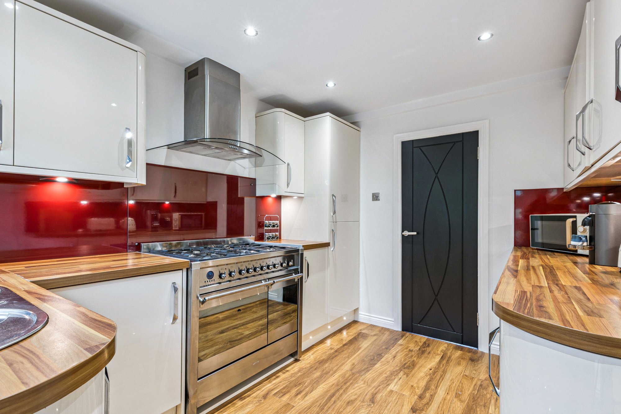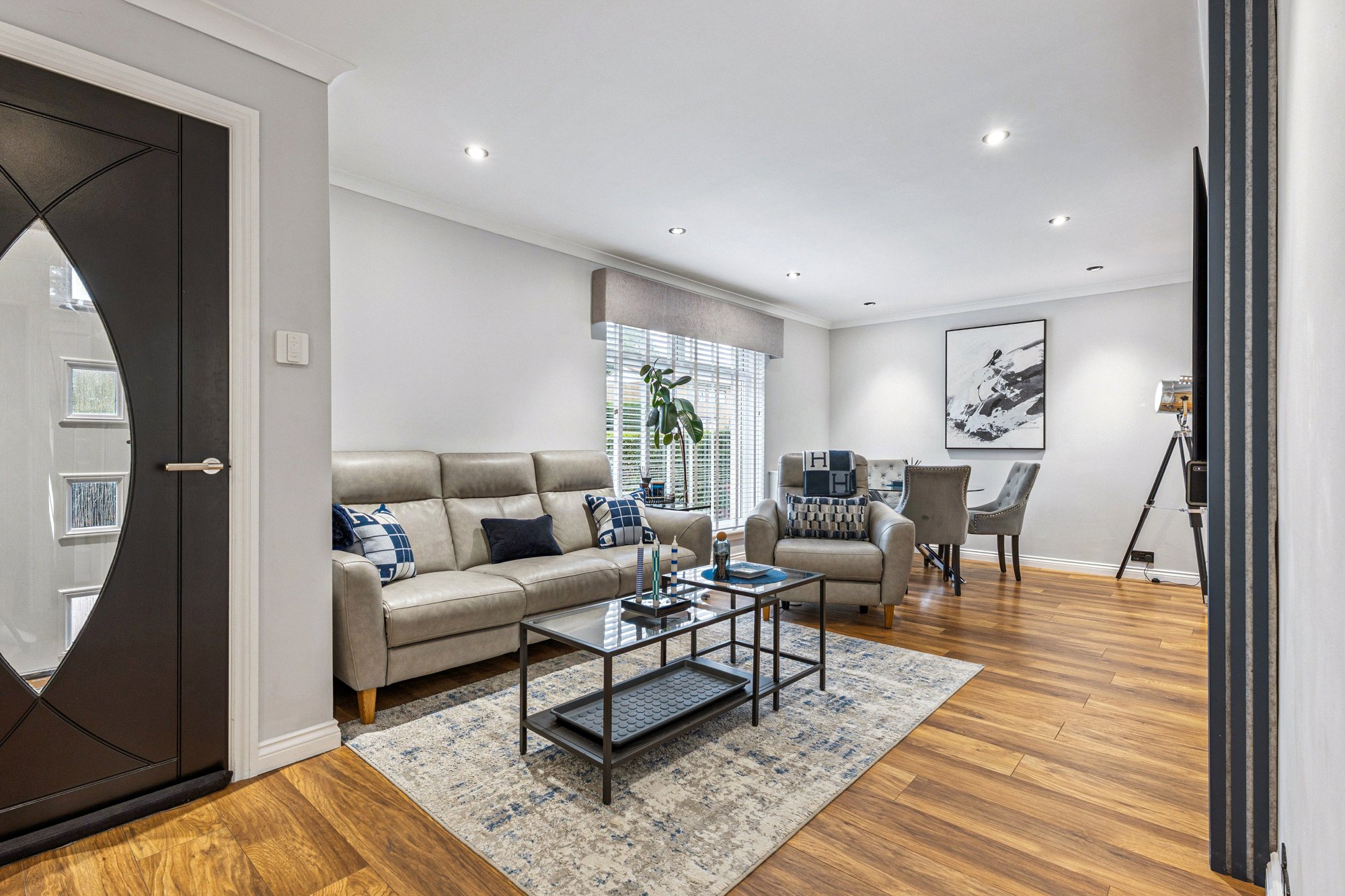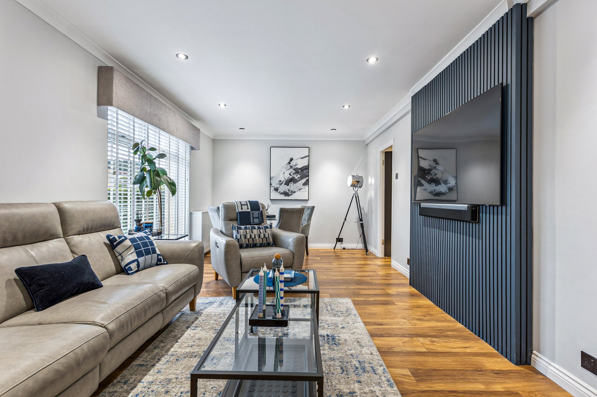 On the ground floor, the property welcomes you with a vestibule leading into an elegant lounge/dining room with a large front-facing window, allowing natural light to flood the space. The contemporary fitted kitchen is equipped with floor and wall-mounted units, complimentary worktops, a range cooker/oven, and has direct access to the rear garden. An inner hall provides a useful utility store and separate cloakroom, while the stylish family bathroom is fitted with a modern three-piece white suite. A striking staircase, with increased ceiling height, feature lighting and glass balustrade, provides a real showpiece within the home.