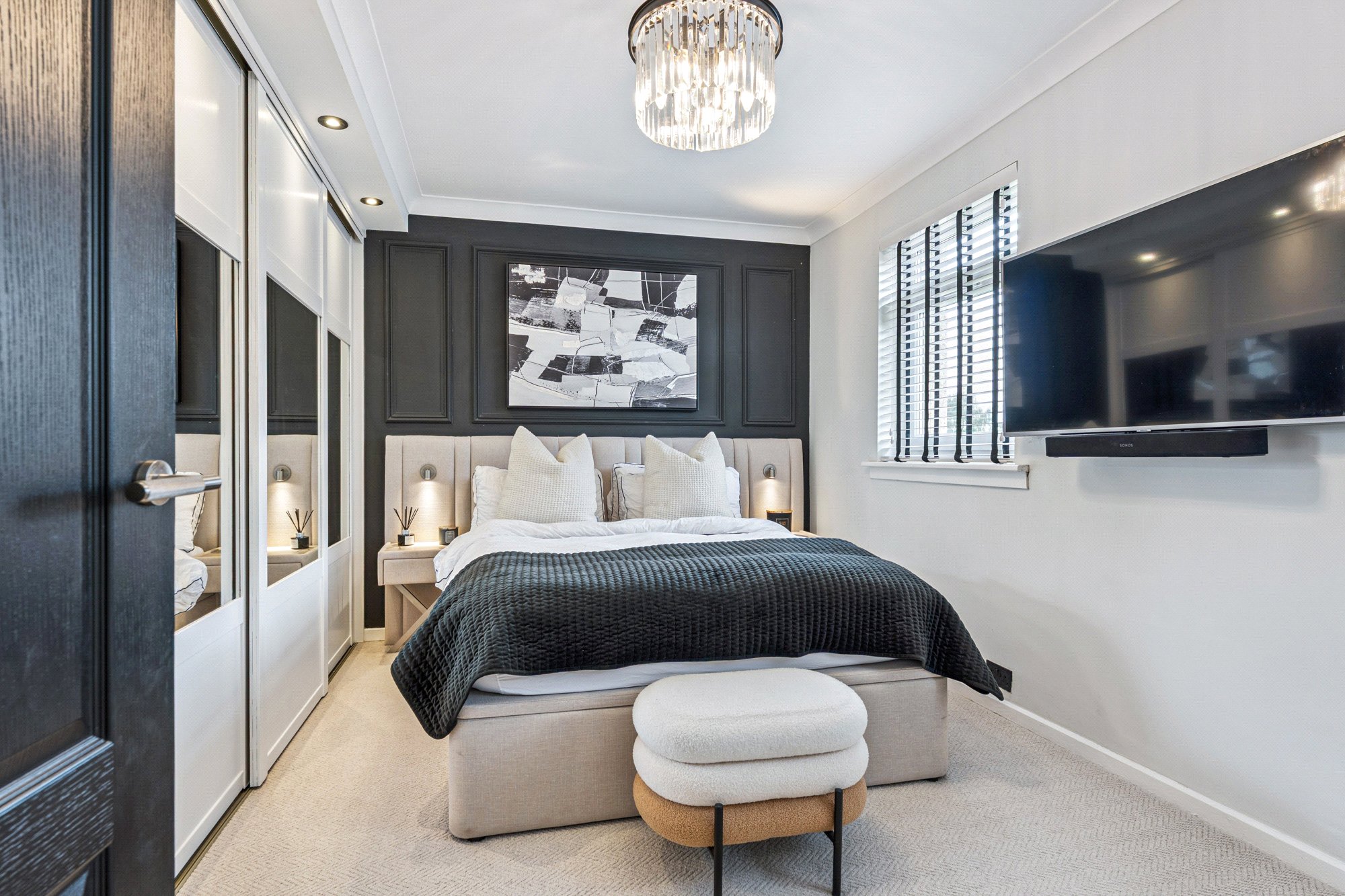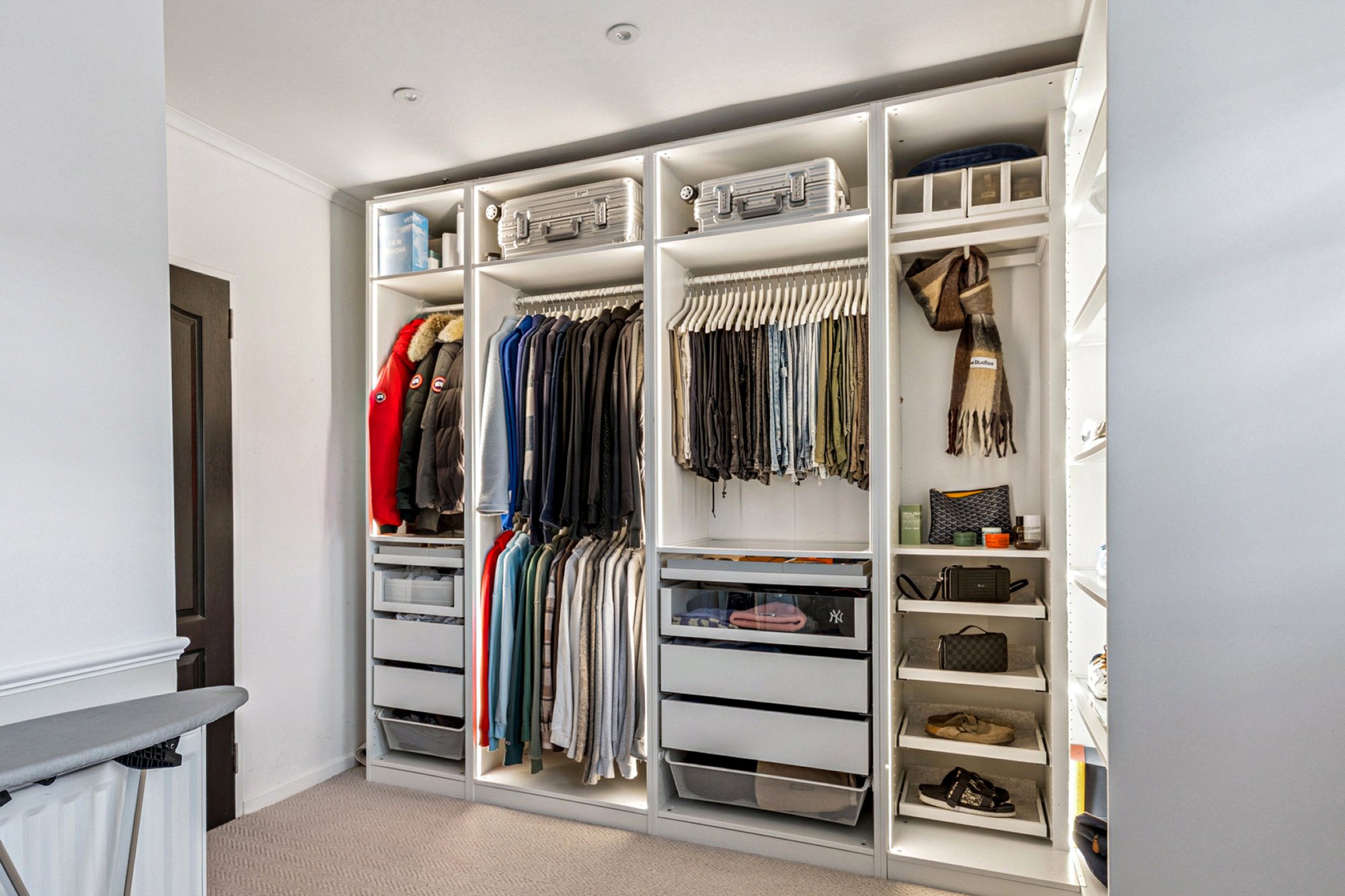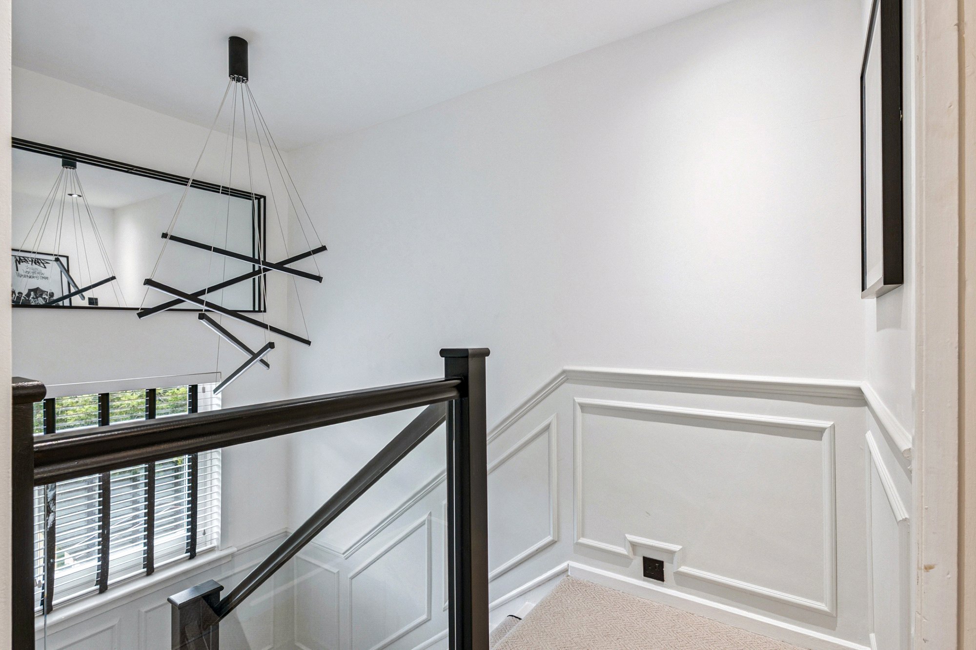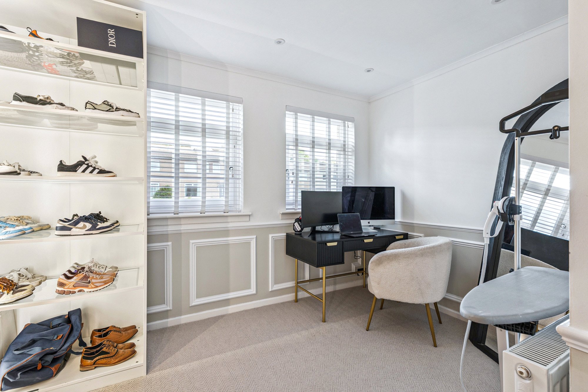 Upstairs, the magnificent principal bedroom enjoys twin windows, fitted wardrobes and bespoke panelling detail. The second bedroom is another generous double, while the third bedroom offers flexibility, currently styled as a chic dressing room with ample fitted storage.