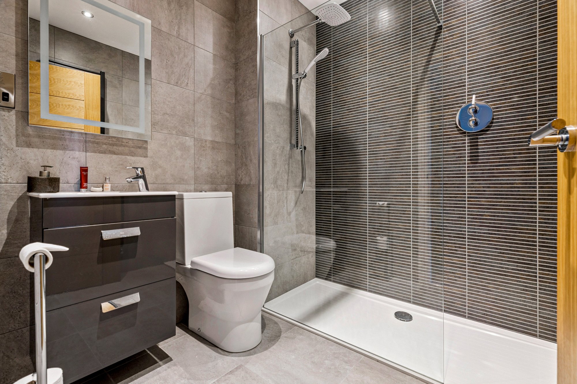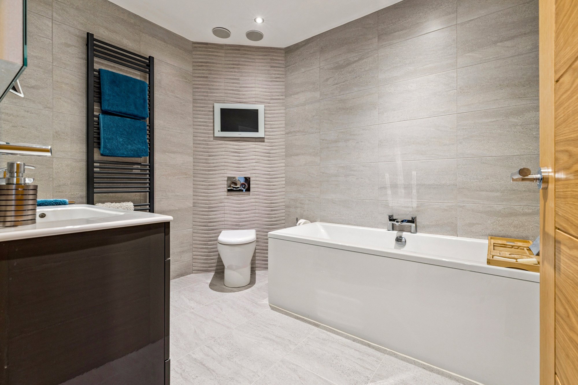 The accommodation is generously proportioned and beautifully presented throughout. A large, welcoming hallway with two storage cupboards leads to a guest WC and a spacious utility room, which in turn provides access to a private, partially floored attic space – ideal for additional storage. The principal bedroom is a luxurious retreat, featuring fitted wardrobes, a double window formation, and a stunning en suite bathroom complete with underfloor heating, a walk-in shower, and built-in television. The second double bedroom also benefits from fitted wardrobes and a stylish en suite shower room. At the heart of the apartment lies the impressive open-plan lounge, dining, and kitchen area. A striking bay window, complemented by a total of seven windows, floods the space with natural light while offering far-reaching views. The kitchen is equipped with an excellent range of wall and base units, integrated appliances, complementary granite worktops, and a breakfast bar – perfect for modern living and entertaining.