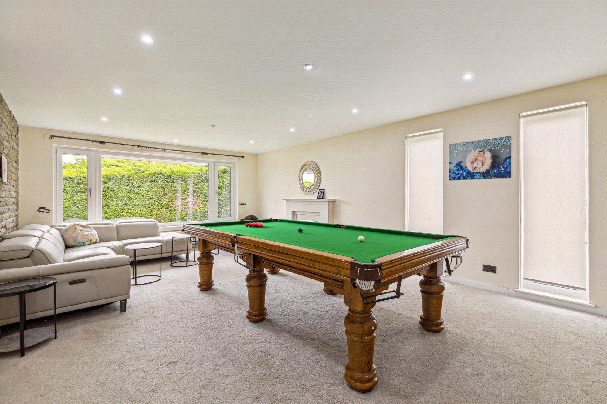 The accommodation features a welcoming canopy entrance leading into a spacious reception hallway. The bright formal lounge, complete with glass double doors opening to the garden, provides an inviting space for relaxation. A large family room offers ample space for entertaining. The kitchen and dining area is fitted with a range of wall-mounted and floor units, complemented by coordinating work surfaces, while a utility room offers additional storage and space for laundry appliances.