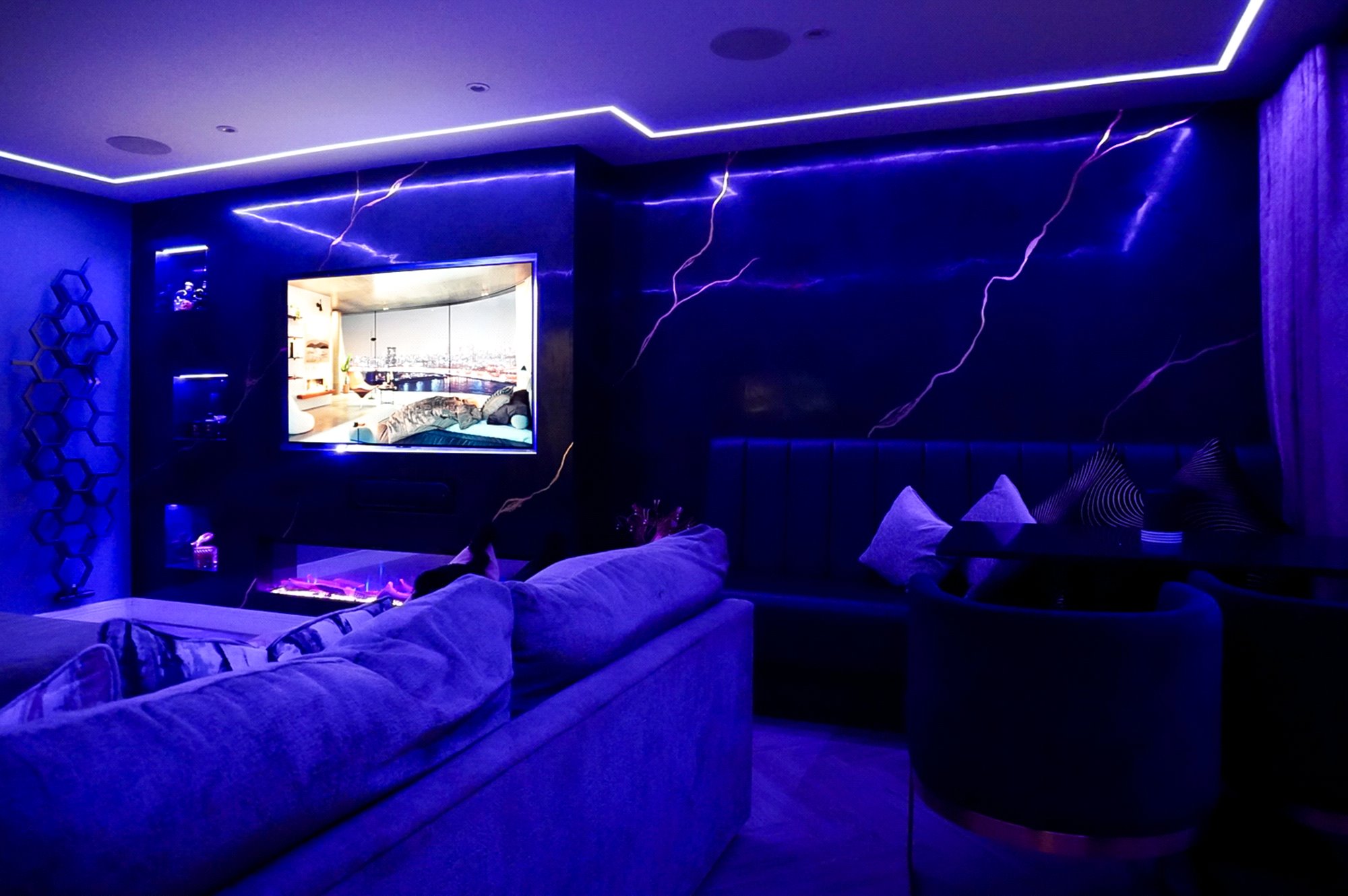 On the ground floor, a welcoming entrance hall leads into a bright and spacious open-plan lounge and dining area featuring contemporary décor, statement lighting, and a stunning feature media wall — the ideal focal point for relaxing or entertaining. The modern kitchen offers sleek cabinetry, generous workspace, and quality fittings, making it the heart of the home.