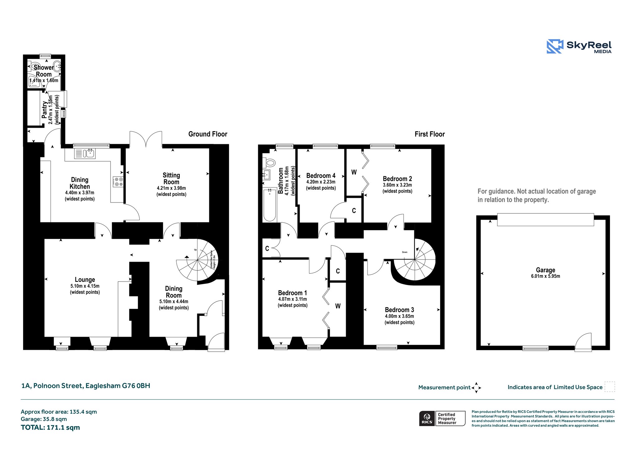 The accommodation on the ground floor begins with a welcoming entrance vestibule which leads through to a dining hall featuring a striking spiral staircase providing access to the first floor. There is a bright sitting room with French doors opening directly onto the rear garden, while the spacious lounge enjoys pleasant views over The Orry. The dining kitchen is well equipped with a range of wall-mounted and floor-standing units, offering ample space for family dining. To the rear, a pantry leads to a shower room and provides a door with direct access to the rear garden.