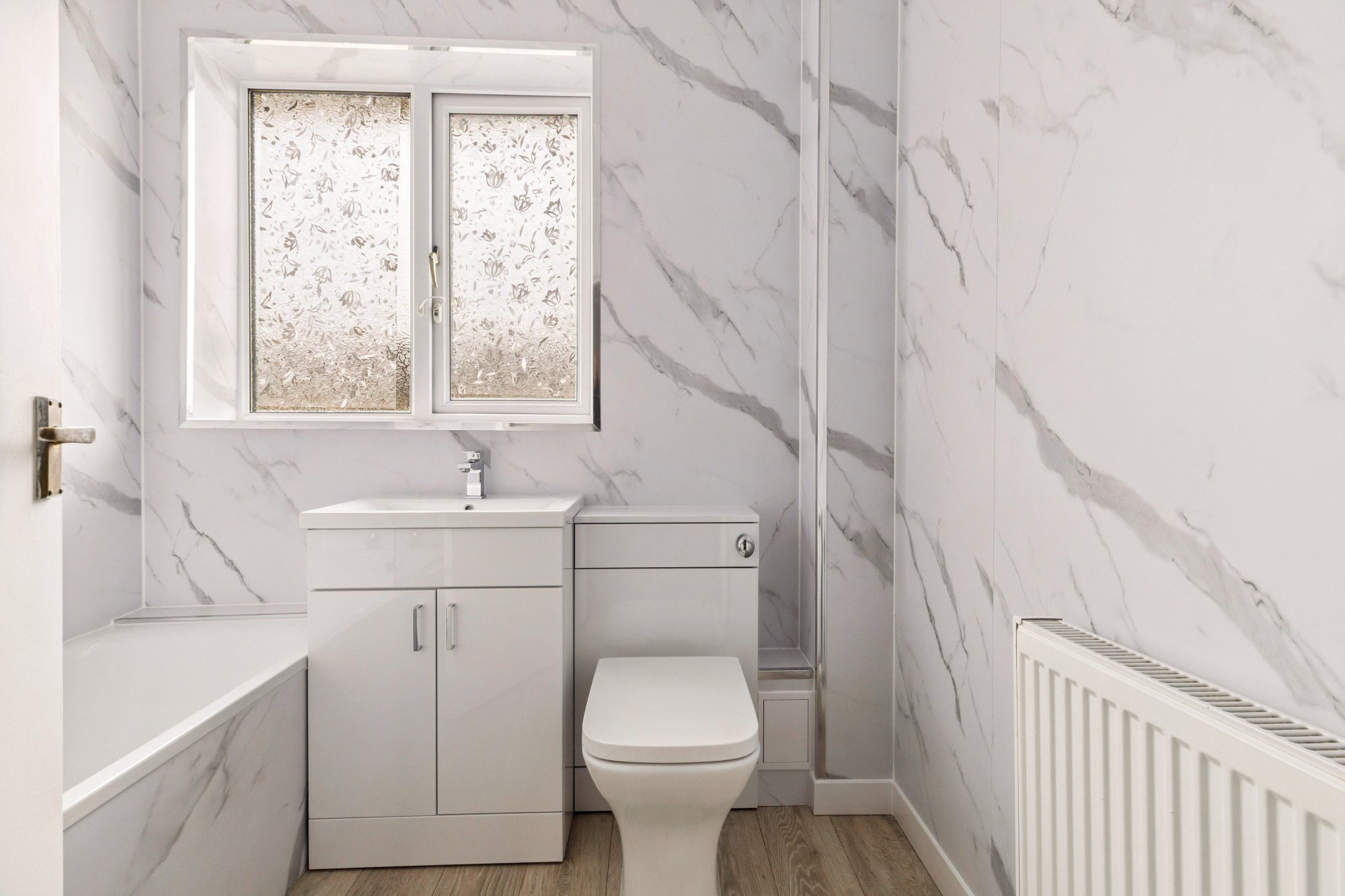The modern fitted kitchen is a particular highlight, finished with contemporary cabinetry, tiled splashbacks, and integrated cooking appliances. Dual-aspect windows ensure the room feels bright and fresh throughout the day. Both main bedrooms are generous doubles and include built in storage, offering peaceful and practical sleeping accommodation. The bathroom is finished in a modern style with a three-piece suite, and an over bath shower.