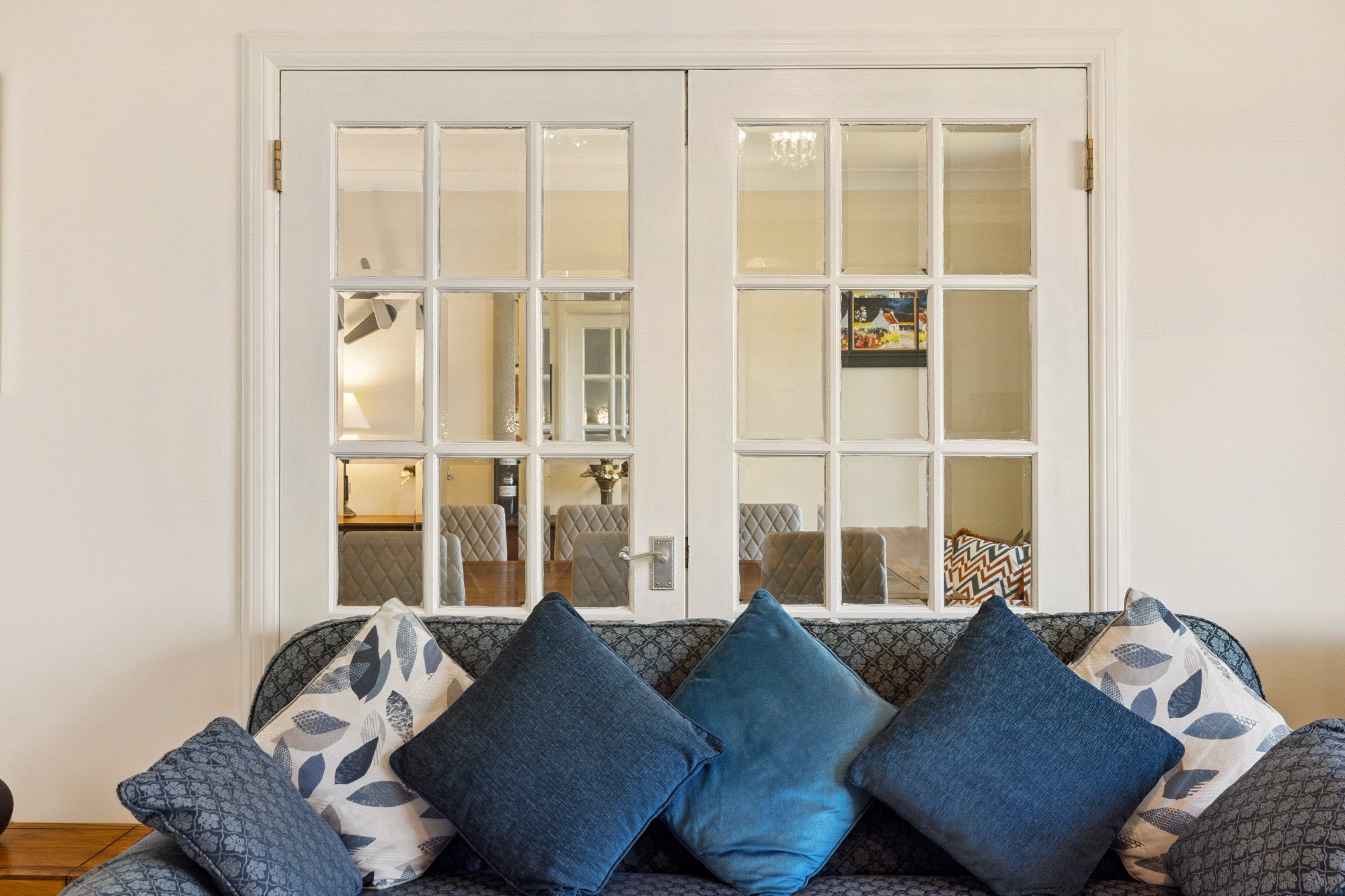 The welcoming reception hallway gives access to all main apartments and includes multiple storage cupboards. The impressive lounge is a standout feature - bright and spacious, with dual-aspect windows and direct access to a private balcony, creating an ideal space for relaxation and entertaining. Adjacent is a well-proportioned dining room, perfect for hosting and flexible enough to serve as a home office if required.
