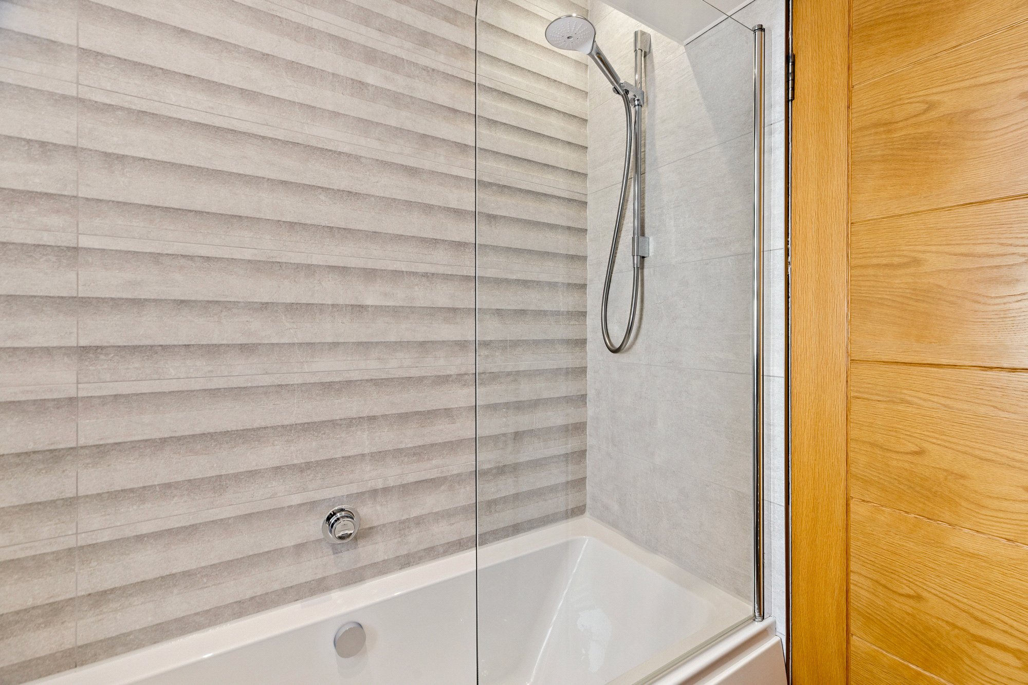 Two well-proportioned double bedrooms occupy the ground floor, each offering versatile use and generous floor area. A contemporary bathroom serves this level, fitted with a bath and separate shower for added convenience. Additional storage cupboards are thoughtfully placed throughout the hallway.
