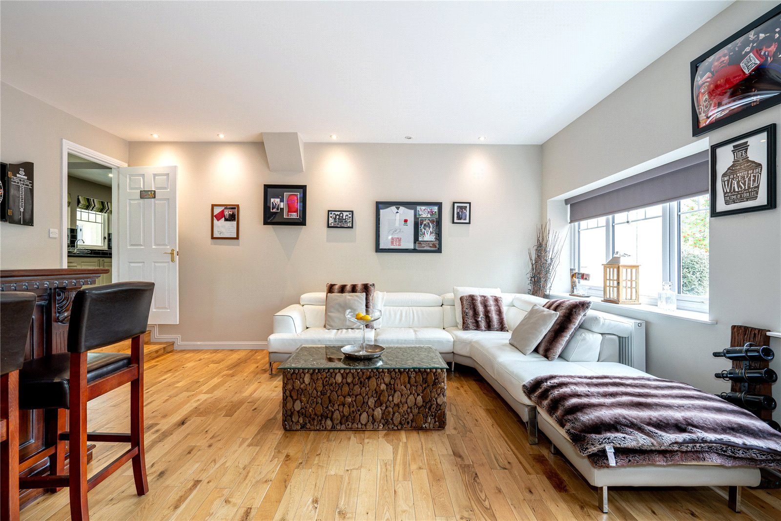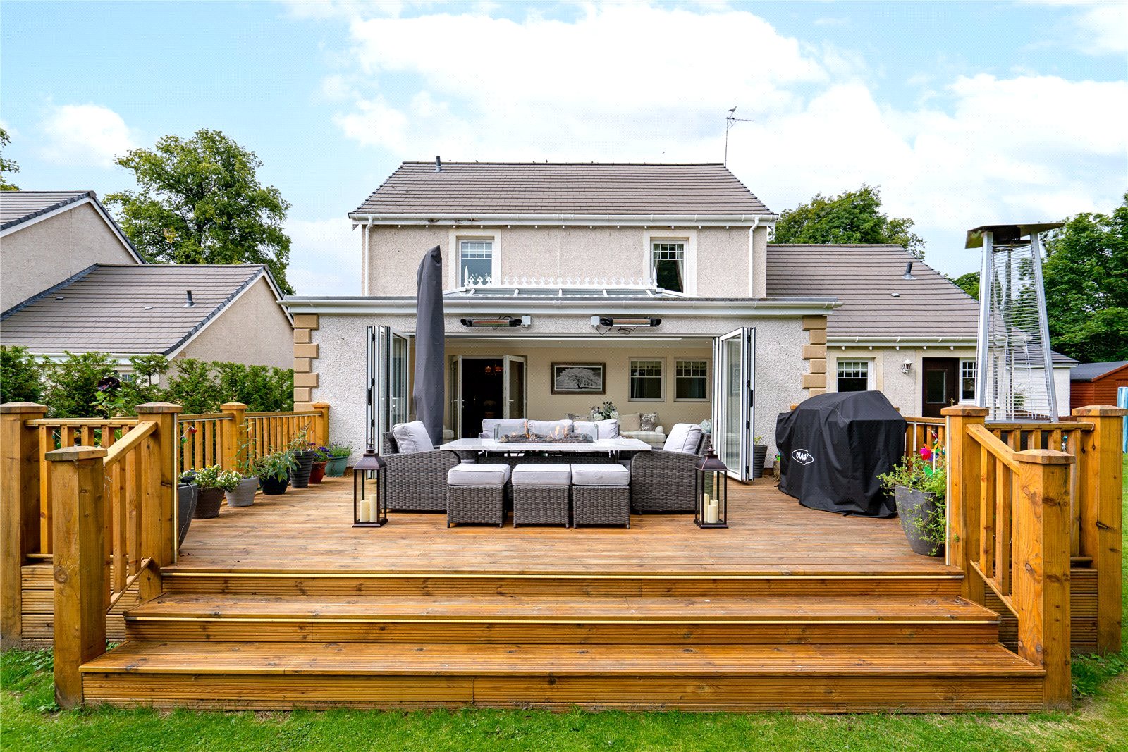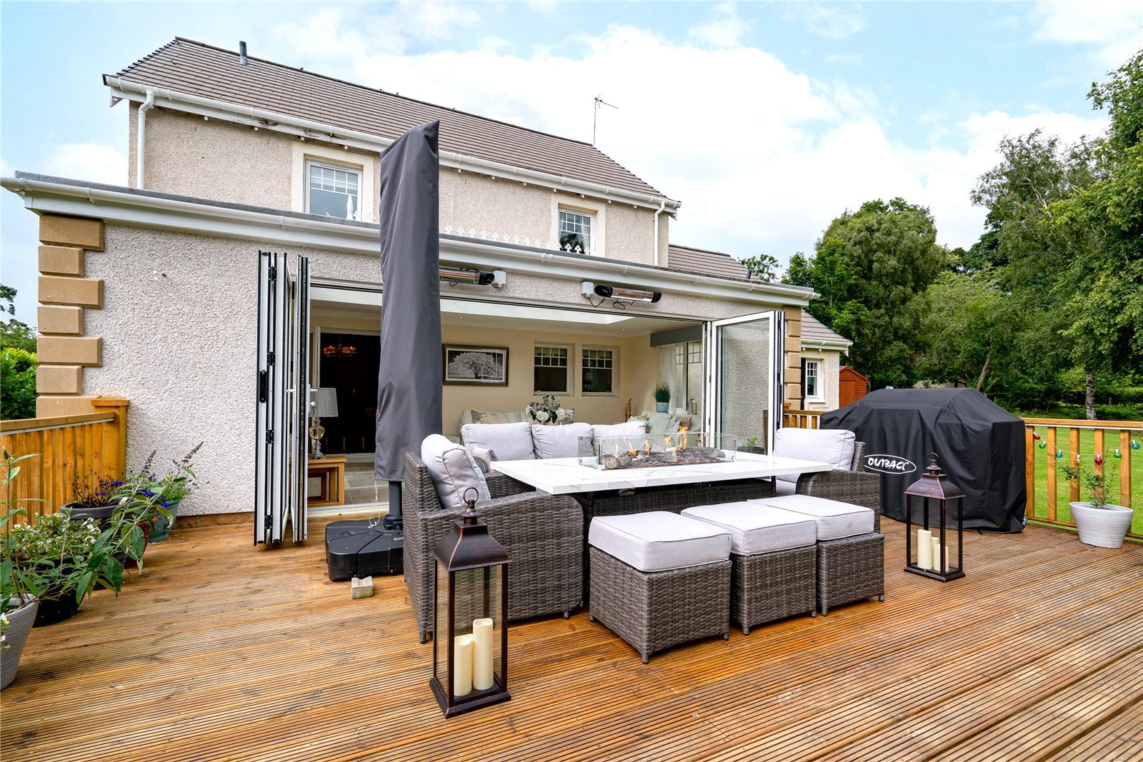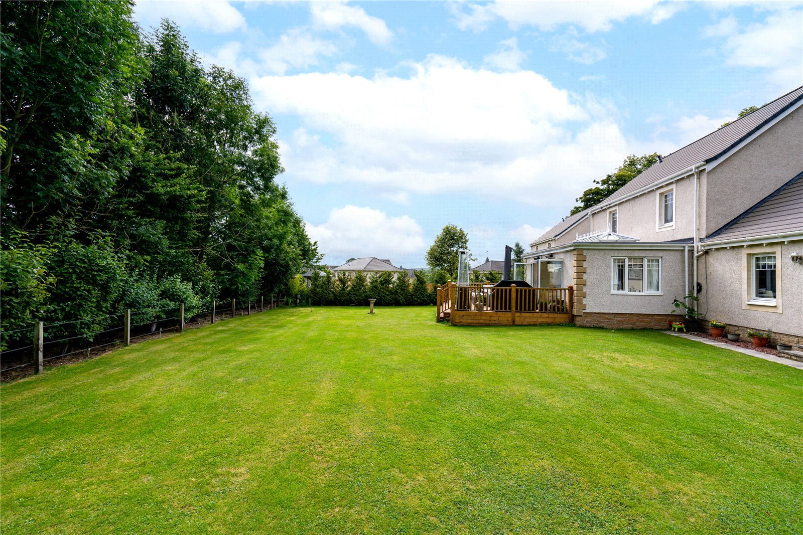 The aforementioned garden grounds are of a scale seldom offered to the market. These include an expansive driveway which provides ample off street parking whilst leading to a recently constructed detached garage. The remaining gardens are mainly laid to lawn with a wooded backdrop ensuring a high degree of privacy. The sun terrace laid in timber decking with balustrade is another successful addition to the property.