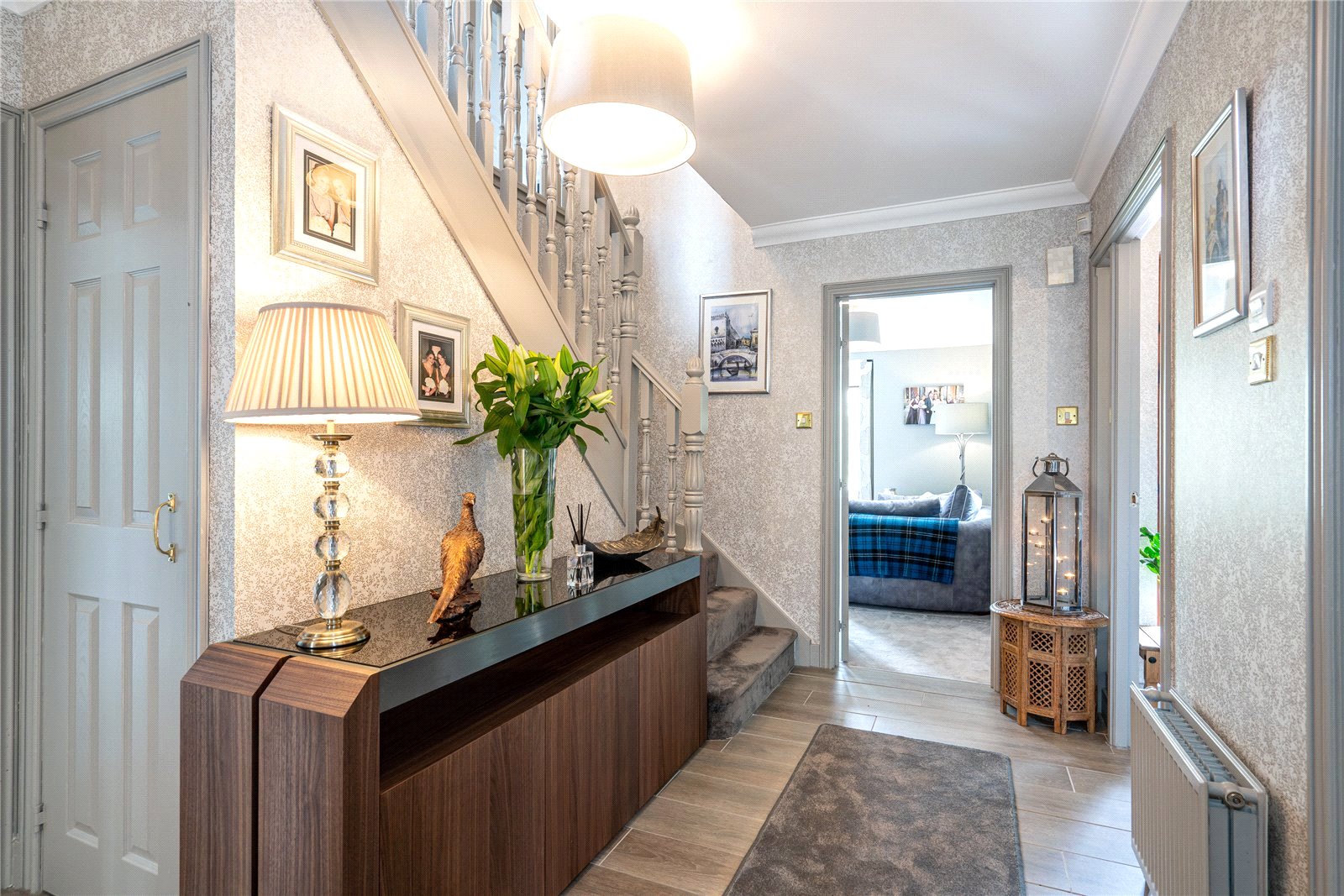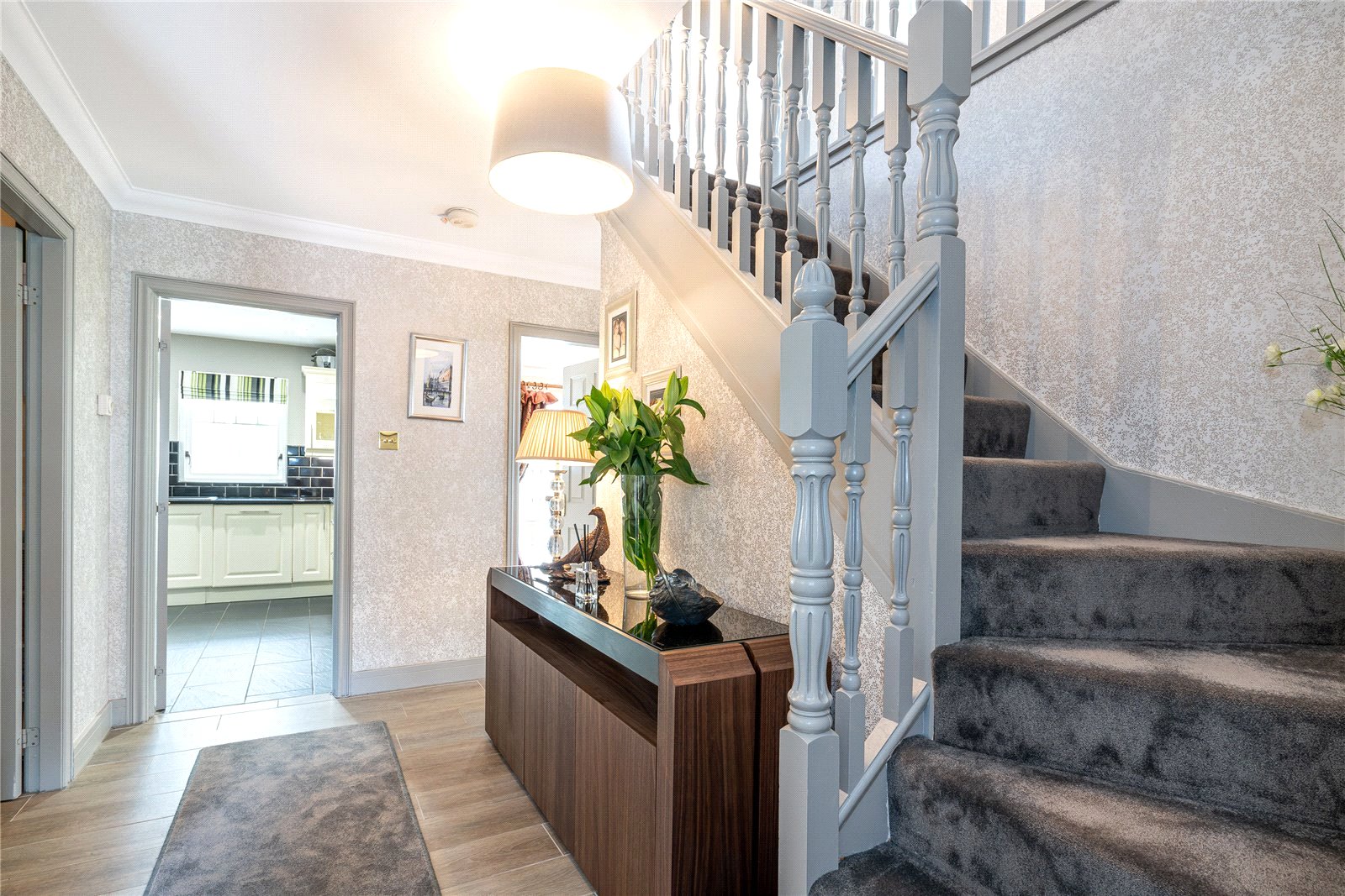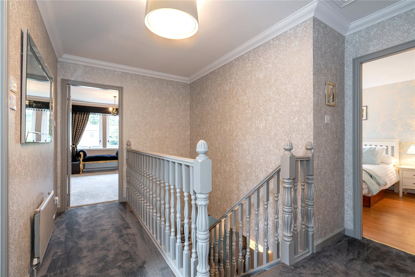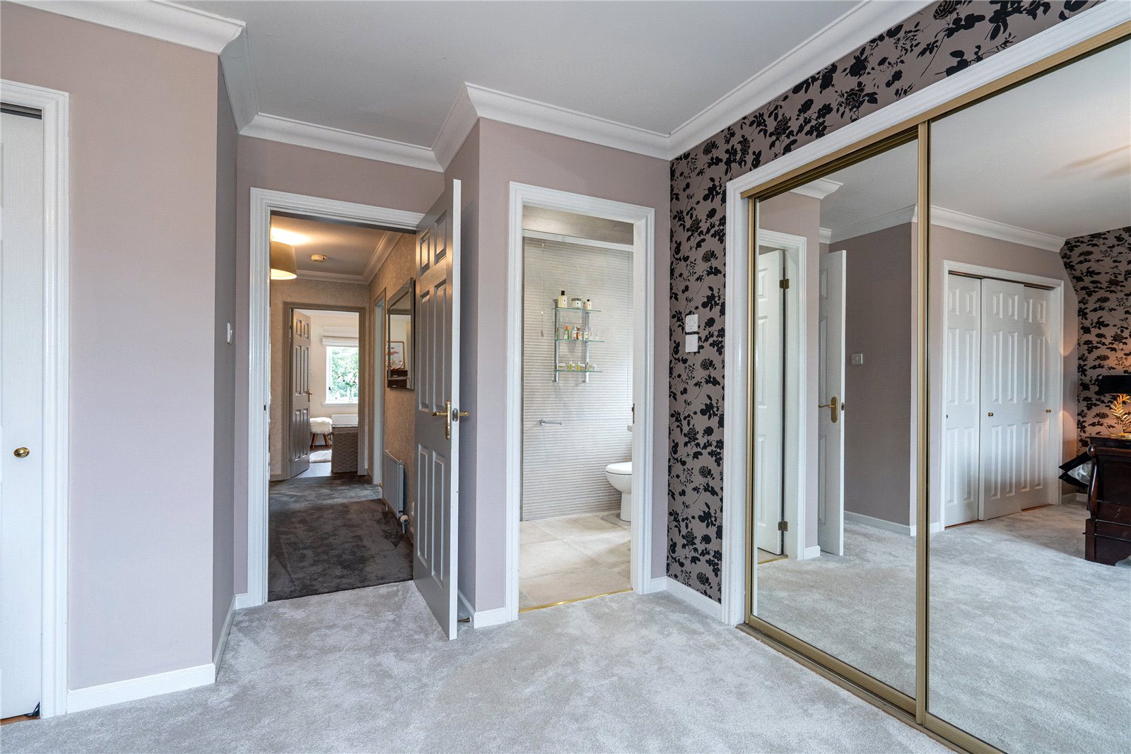 The upper level includes four generously sized bedrooms, extensive fitted storage and family bathroom. The principal bedroom is especially impressive with a sumptuous en-suite.