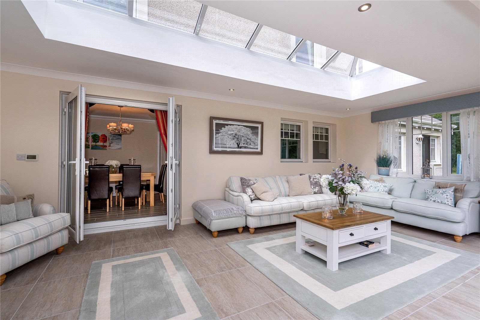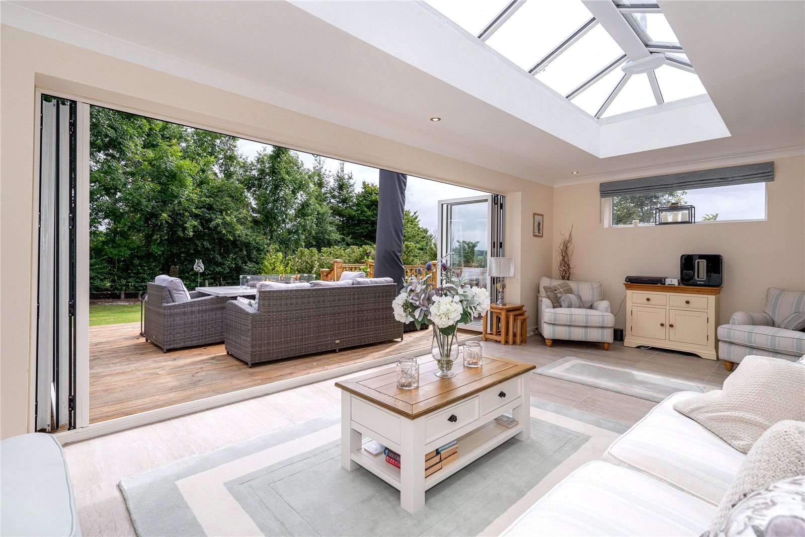 The current owners have reconfigured the accommodation by way of a double garage conversion and added a fabulous orangery style garden room. This incredibly pleasing room features bi-fold doors leading to a vast timber decked sun terrace from where to enjoy the grounds and views throughout the seasons.