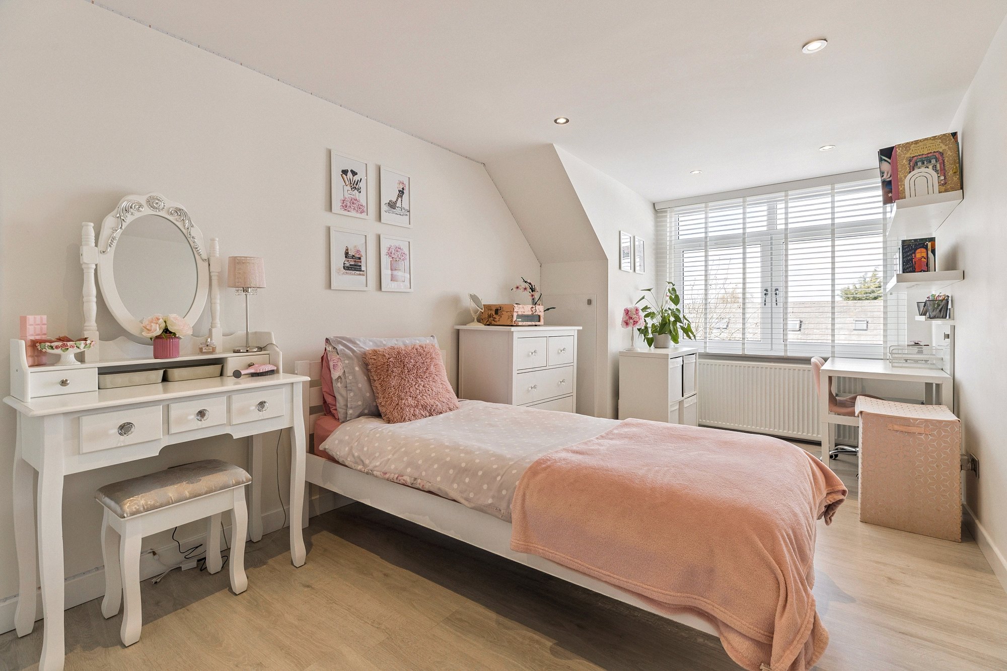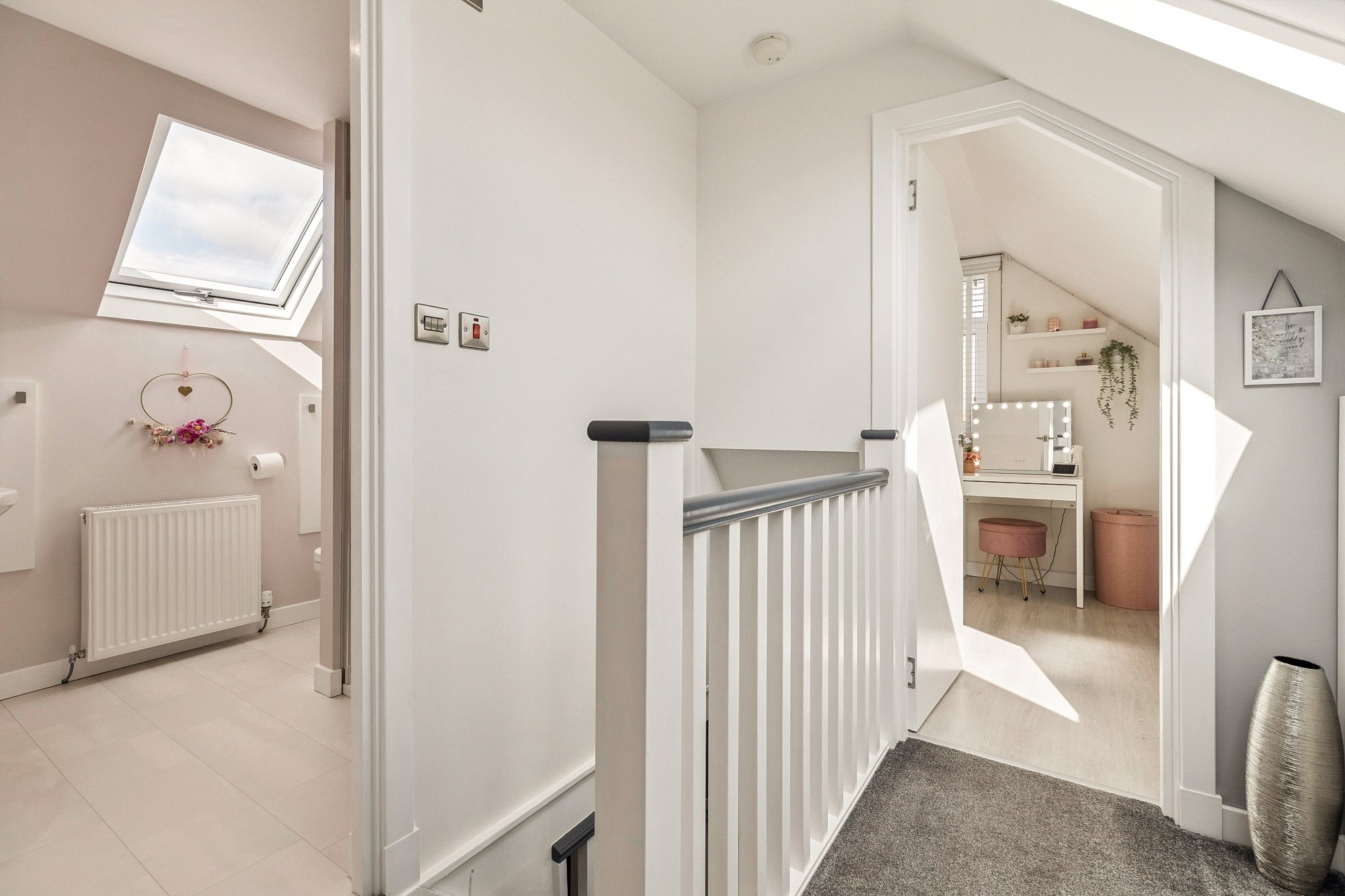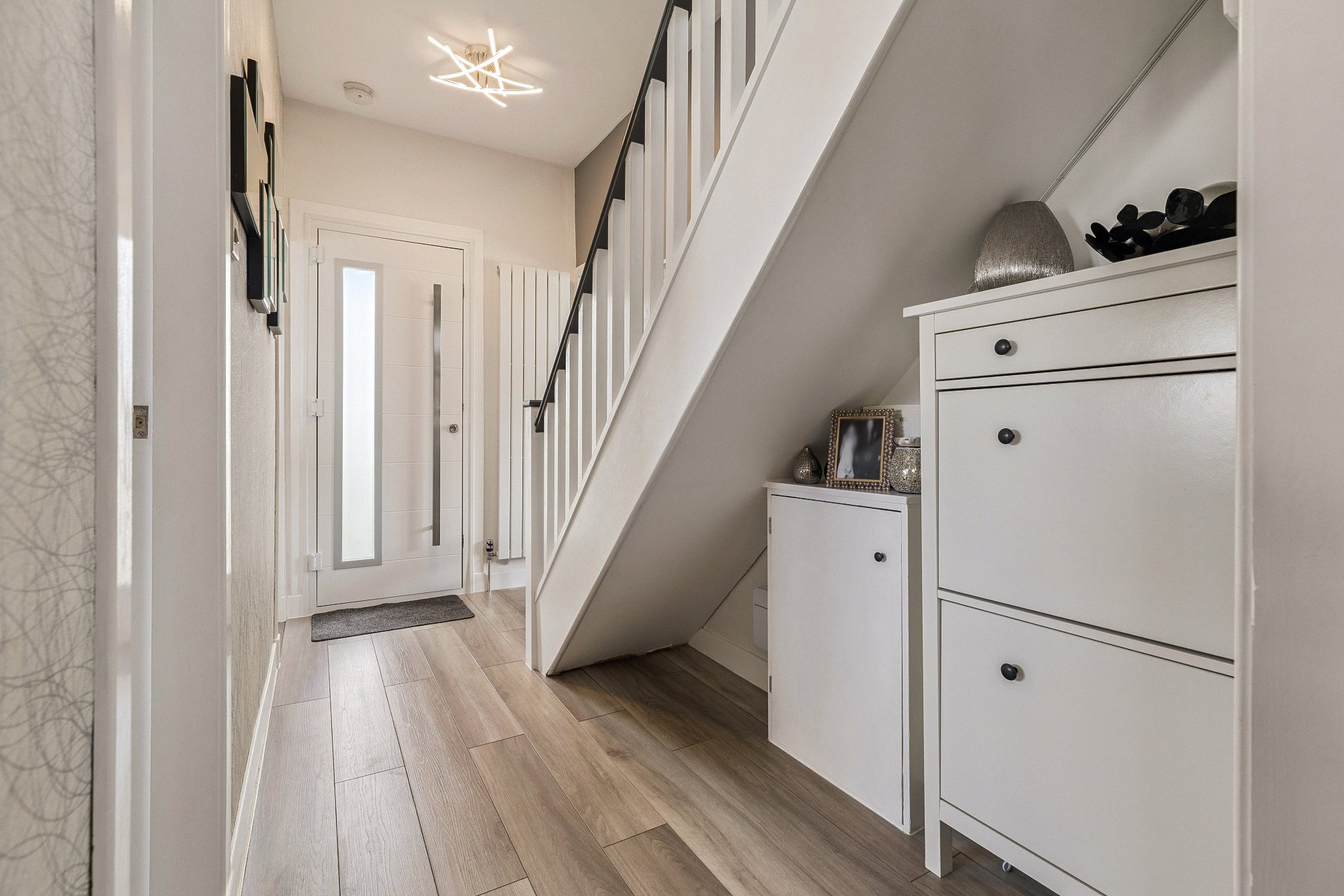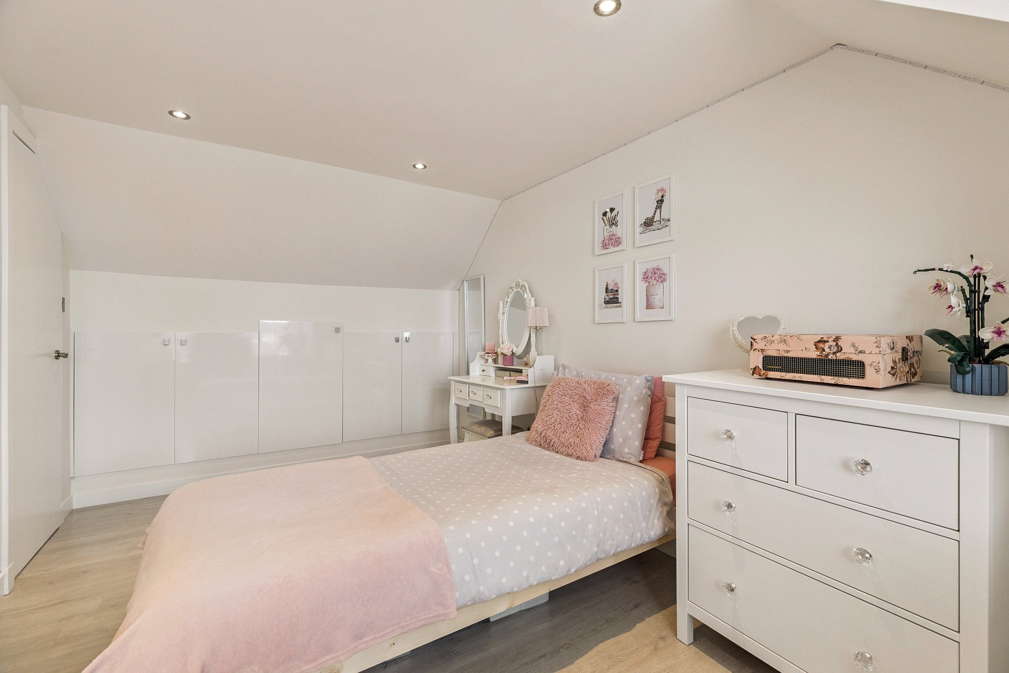 Upstairs features two further large bedrooms with built-in storage, including a particularly impressive principal bedroom, along with a stylish shower room. The upper floor offers plenty of natural light and storage options, with fitted cupboards located off the landing and in each bedroom.
