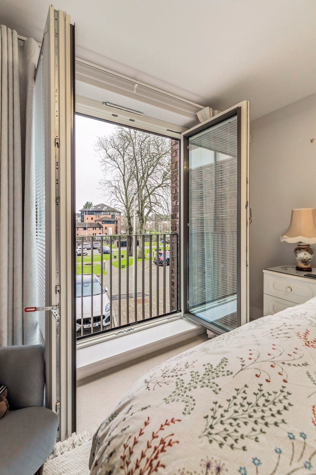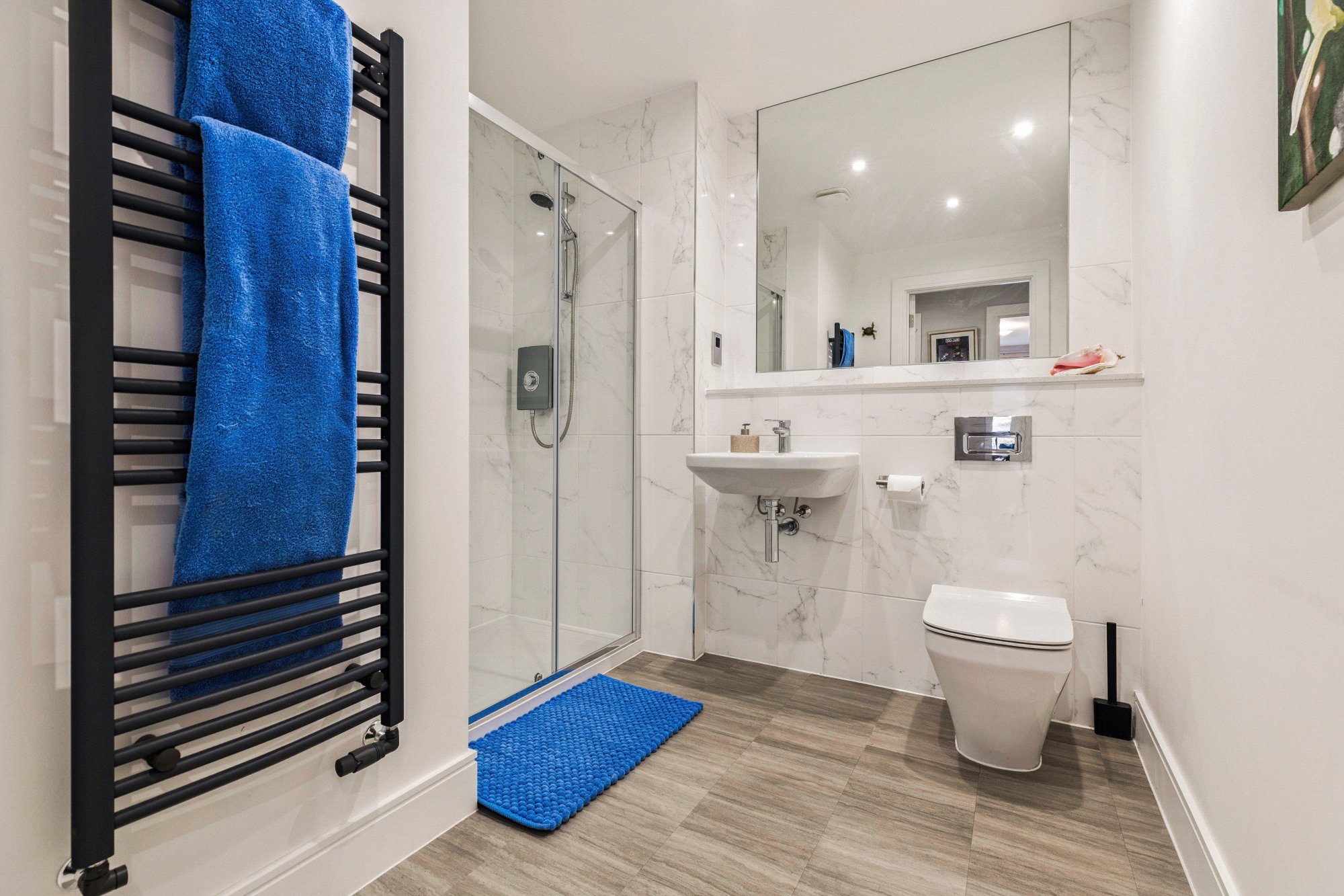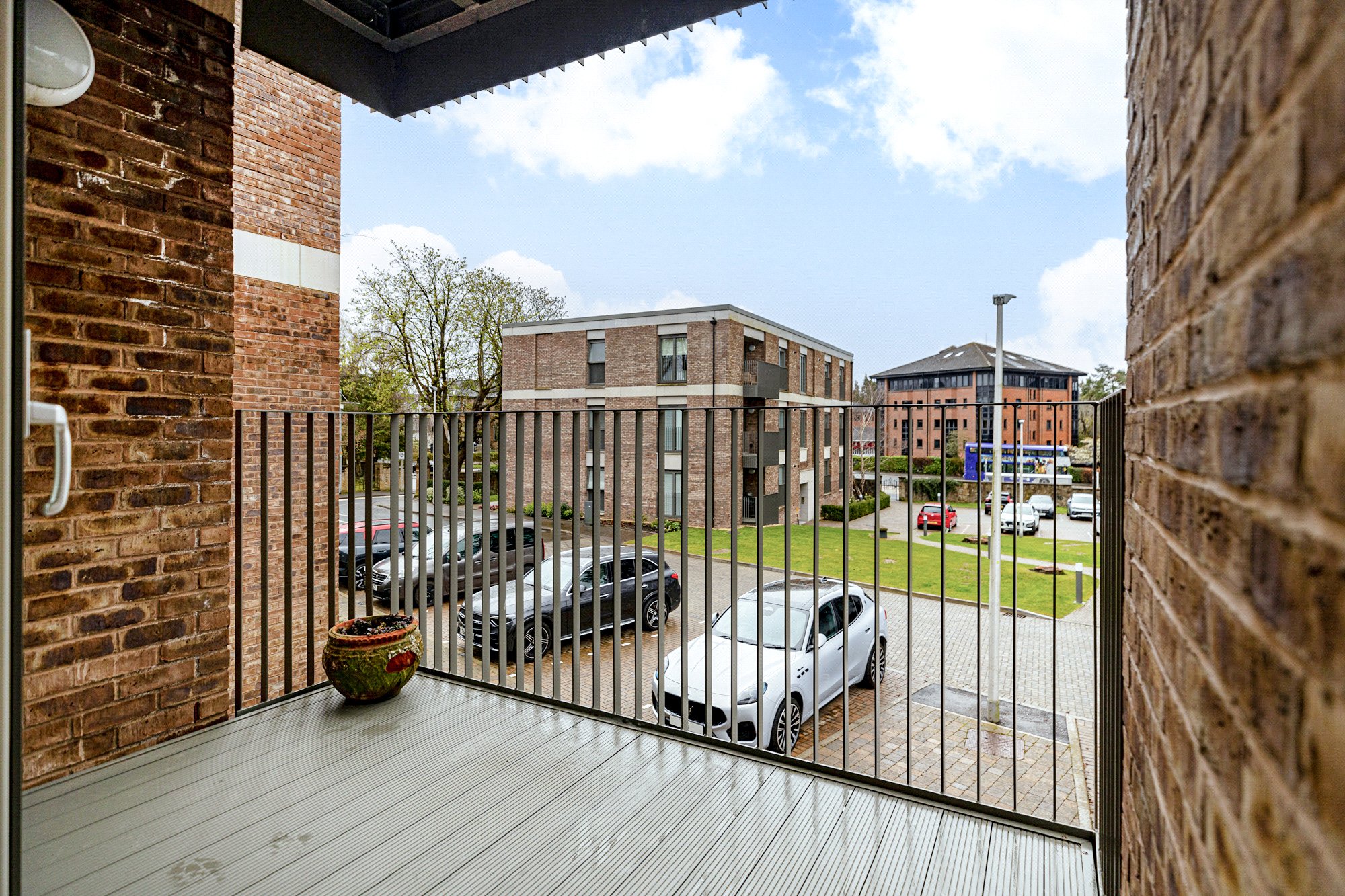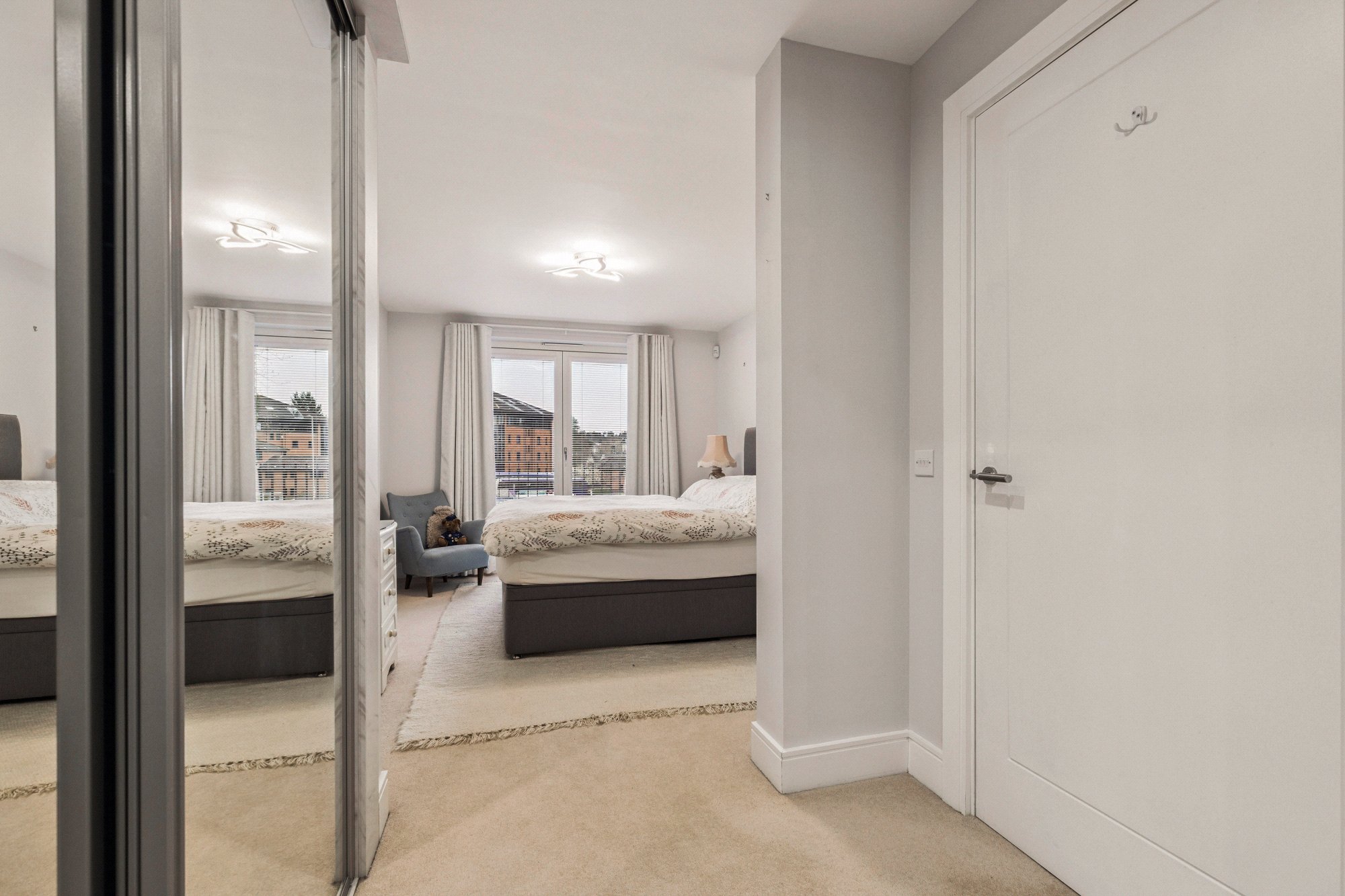 The luxurious principal bedroom features a dedicated dressing area, a Juliet balcony that bathes the room in natural light, and a beautifully appointed en-suite bathroom with a separate shower enclosure. Bedroom two is generously sized with fitted wardrobes and its own Juliet balcony. A contemporary guest shower room, a utility cupboard and additional storage cupboards complete the internal accommodation.