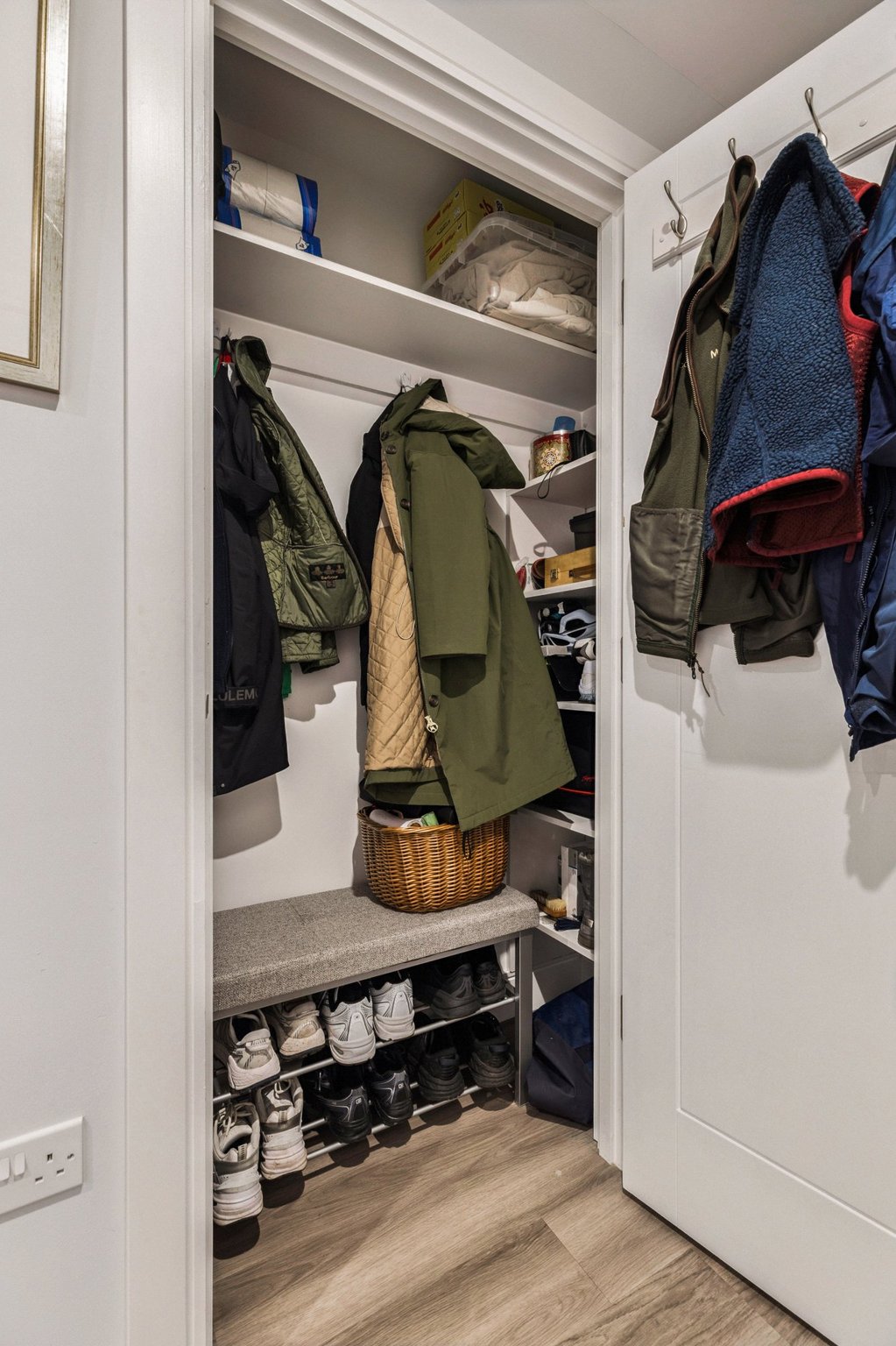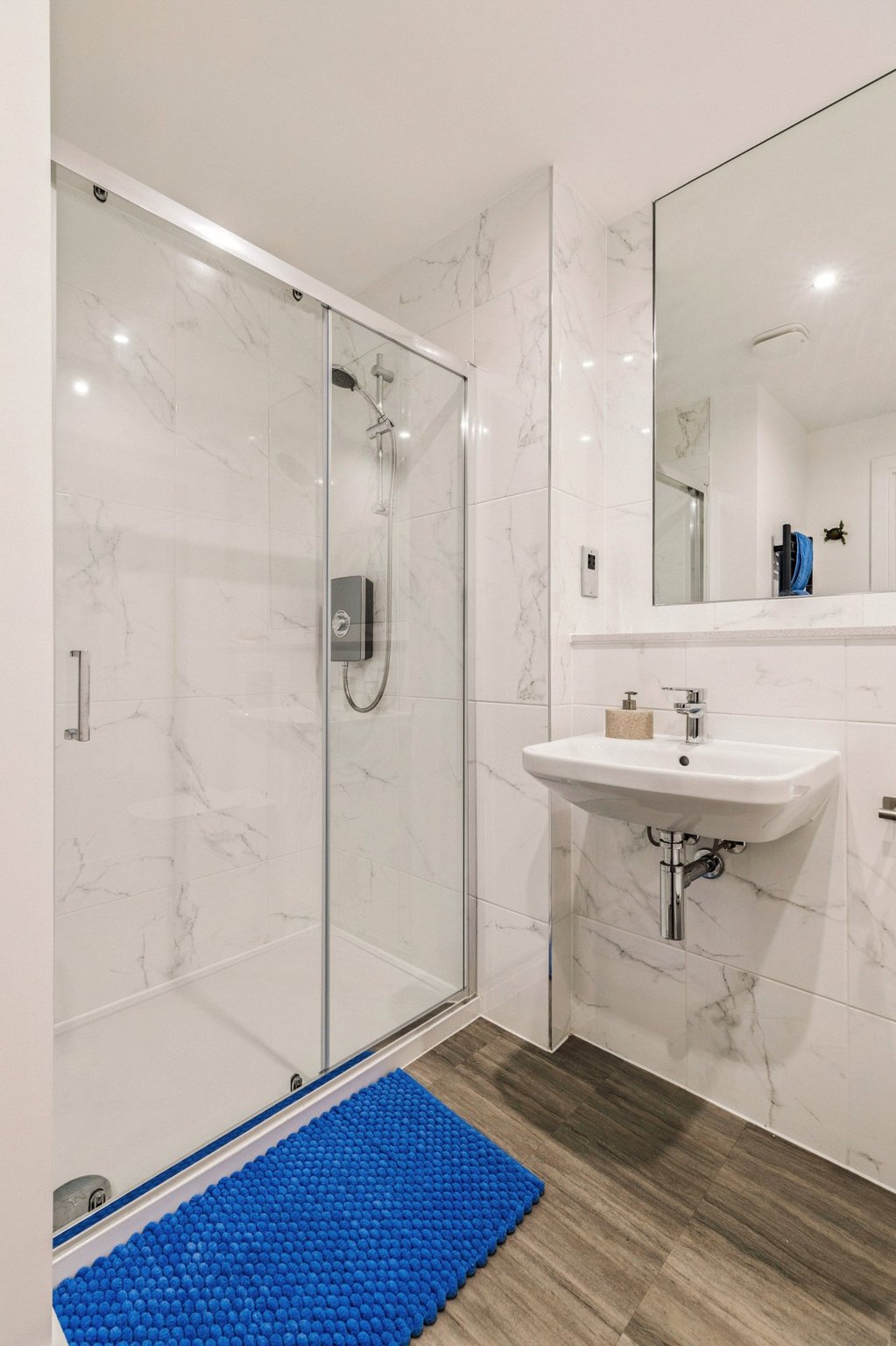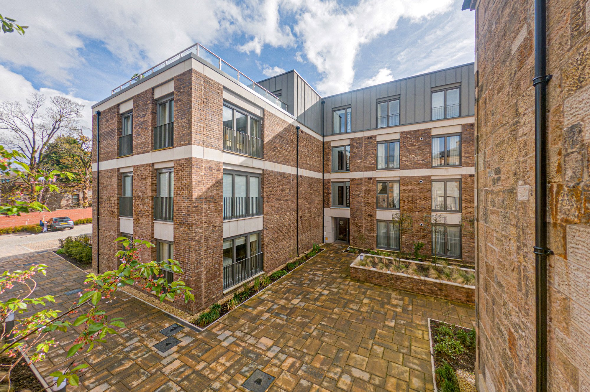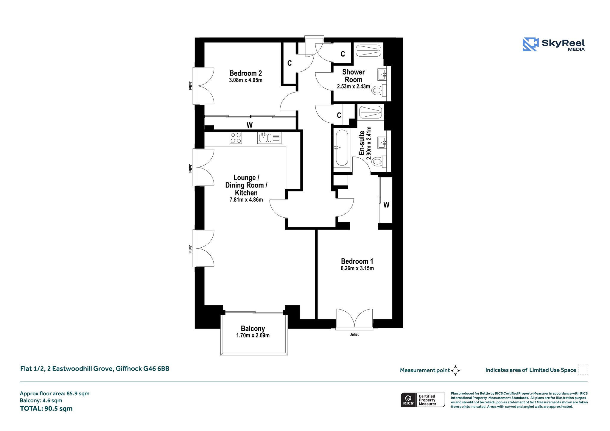 The luxurious principal bedroom features a dedicated dressing area, a Juliet balcony that bathes the room in natural light, and a beautifully appointed en-suite bathroom with a separate shower enclosure. Bedroom two is generously sized with fitted wardrobes and its own Juliet balcony. A contemporary guest shower room, a utility cupboard and additional storage cupboards complete the internal accommodation.