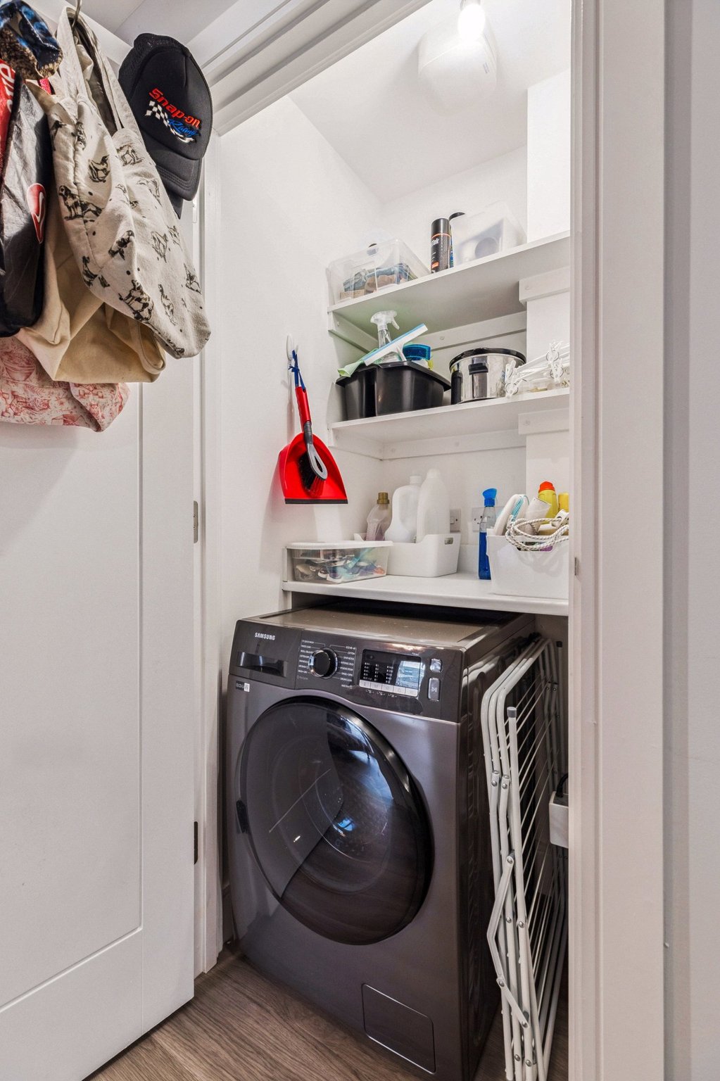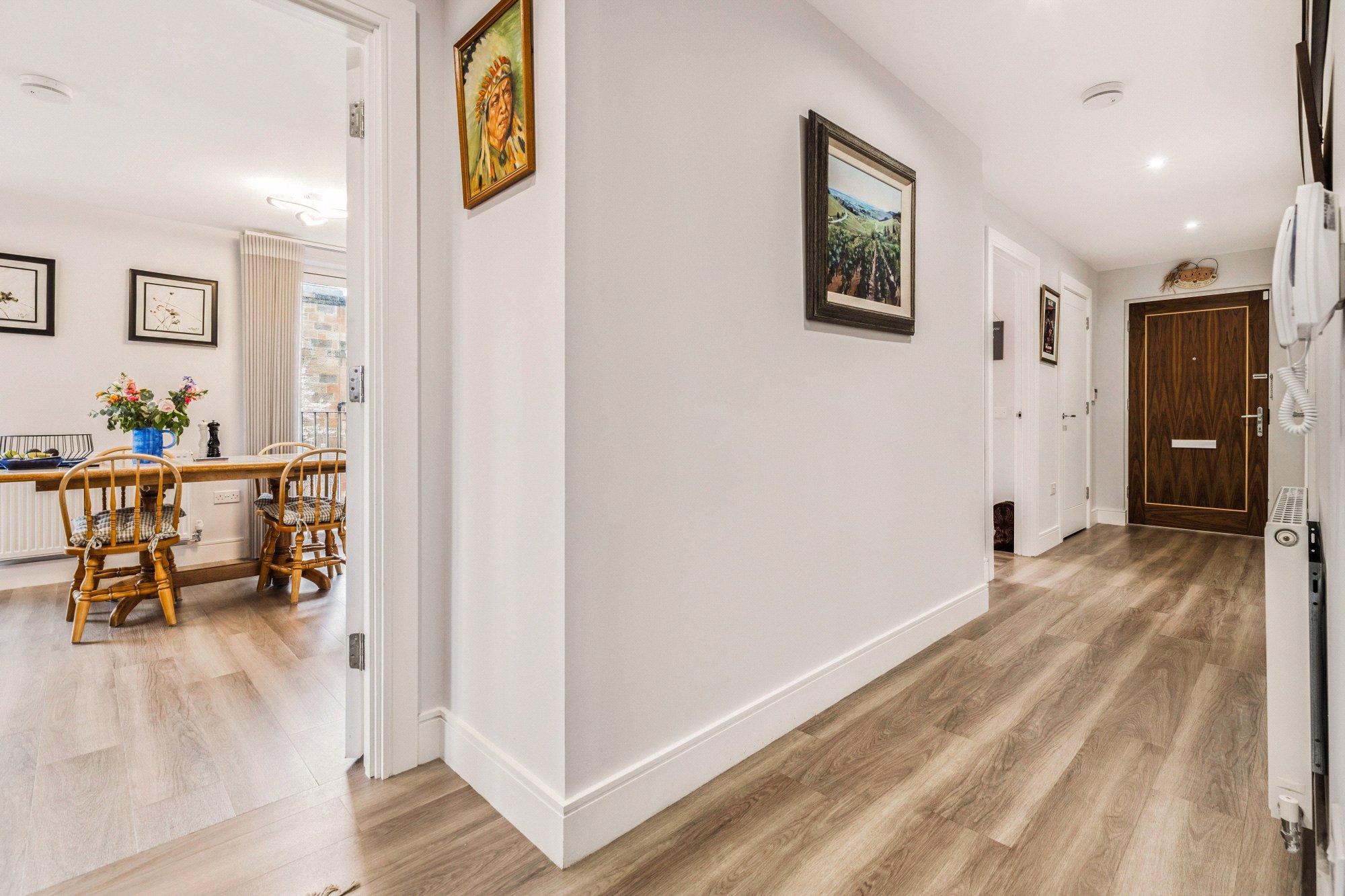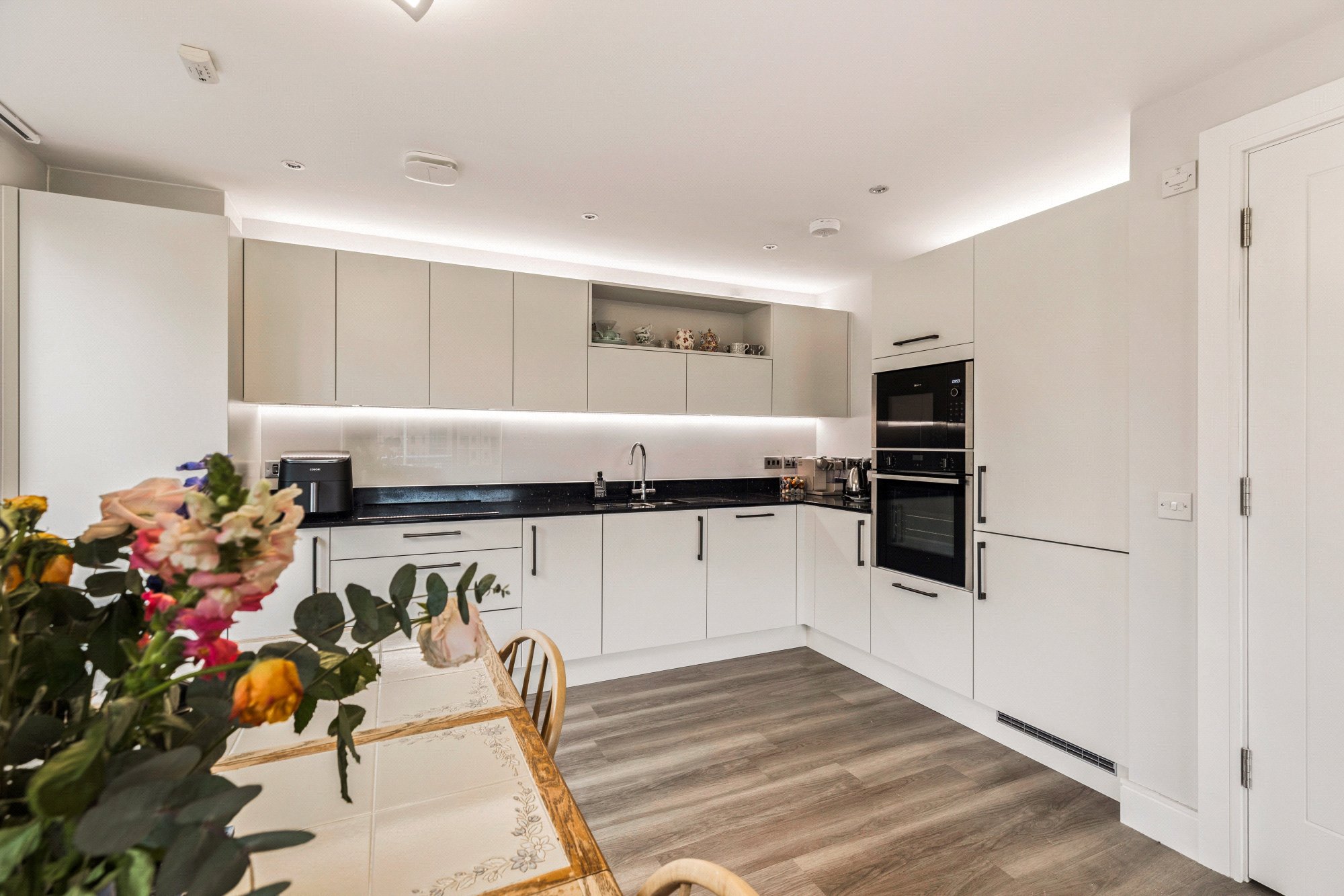 The welcoming entrance hallway leads to all principal rooms, at the end it opens up to a generous open-plan living, dining, and kitchen area—flooded with natural light. The living space is further enhanced by a sliding patio door that opens onto a private balcony, ideal for relaxing or entertaining. The stylish kitchen boasts a range of sleek wall-mounted and floor-standing units, complementary worktops, and a full suite of integrated appliances.