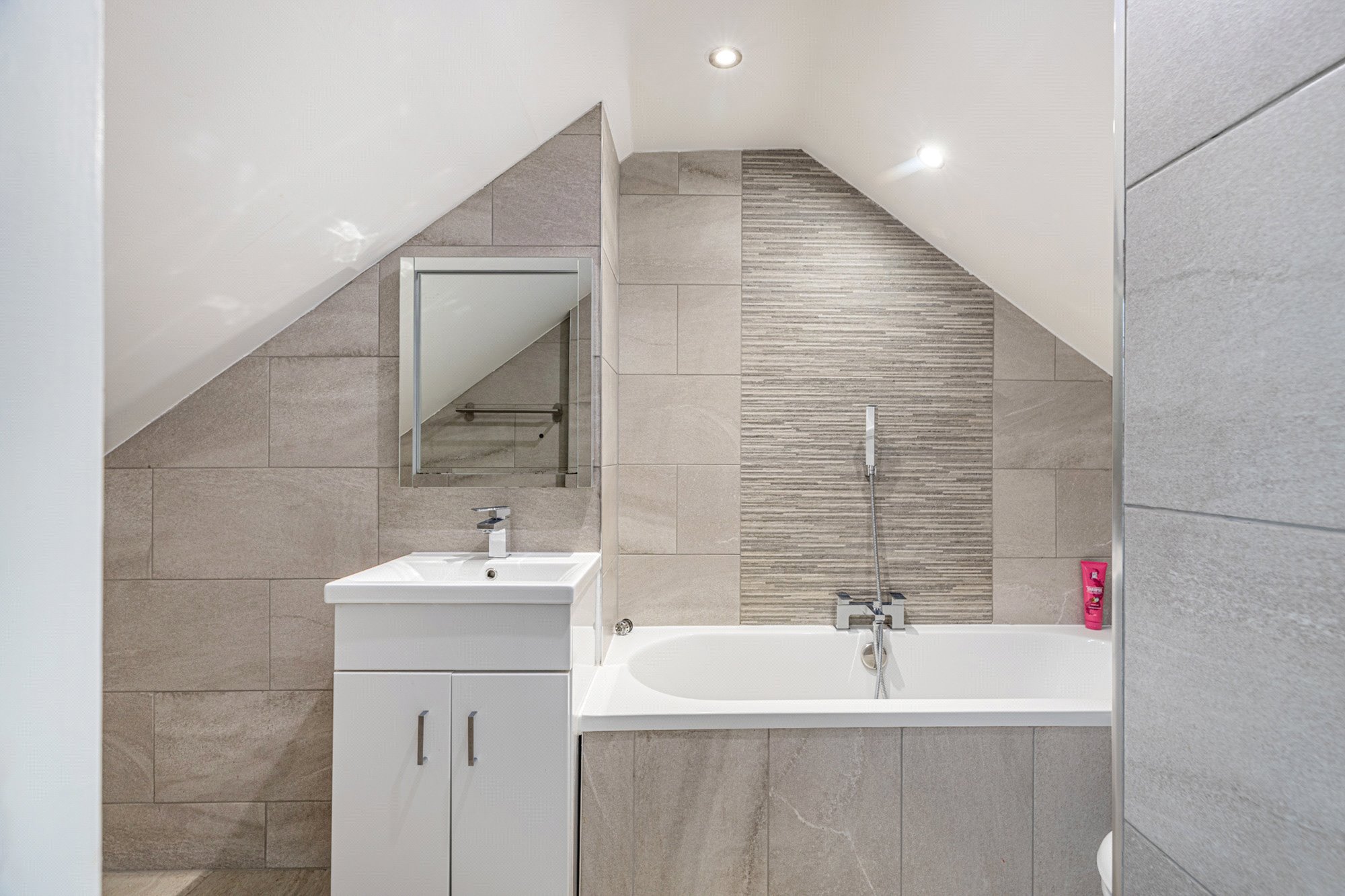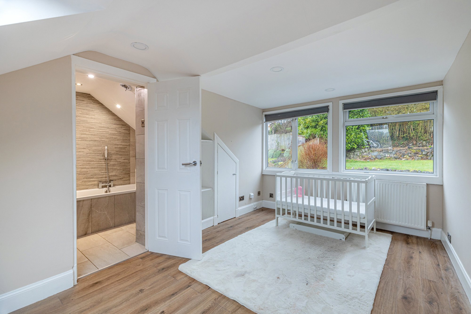 The fully enclosed and notably private rear garden offers an appealing combination of lawn, decorative stonework, and timber decking, with the topography and positioning of the garden allowing for sun to be enjoyed throughout the day. This area is very smartly bordered by quality timber fencing and manicured privet hedging. A driveway provides off-street parking for two cars .