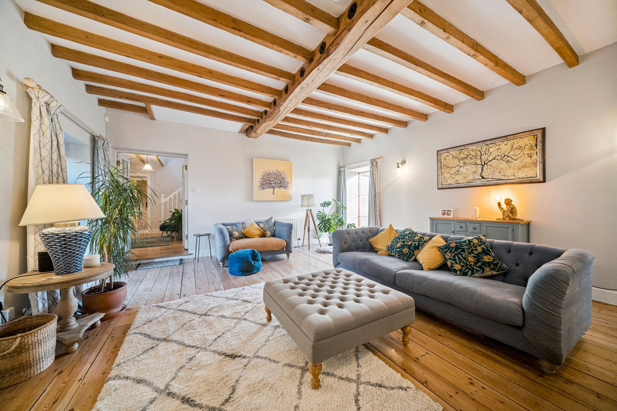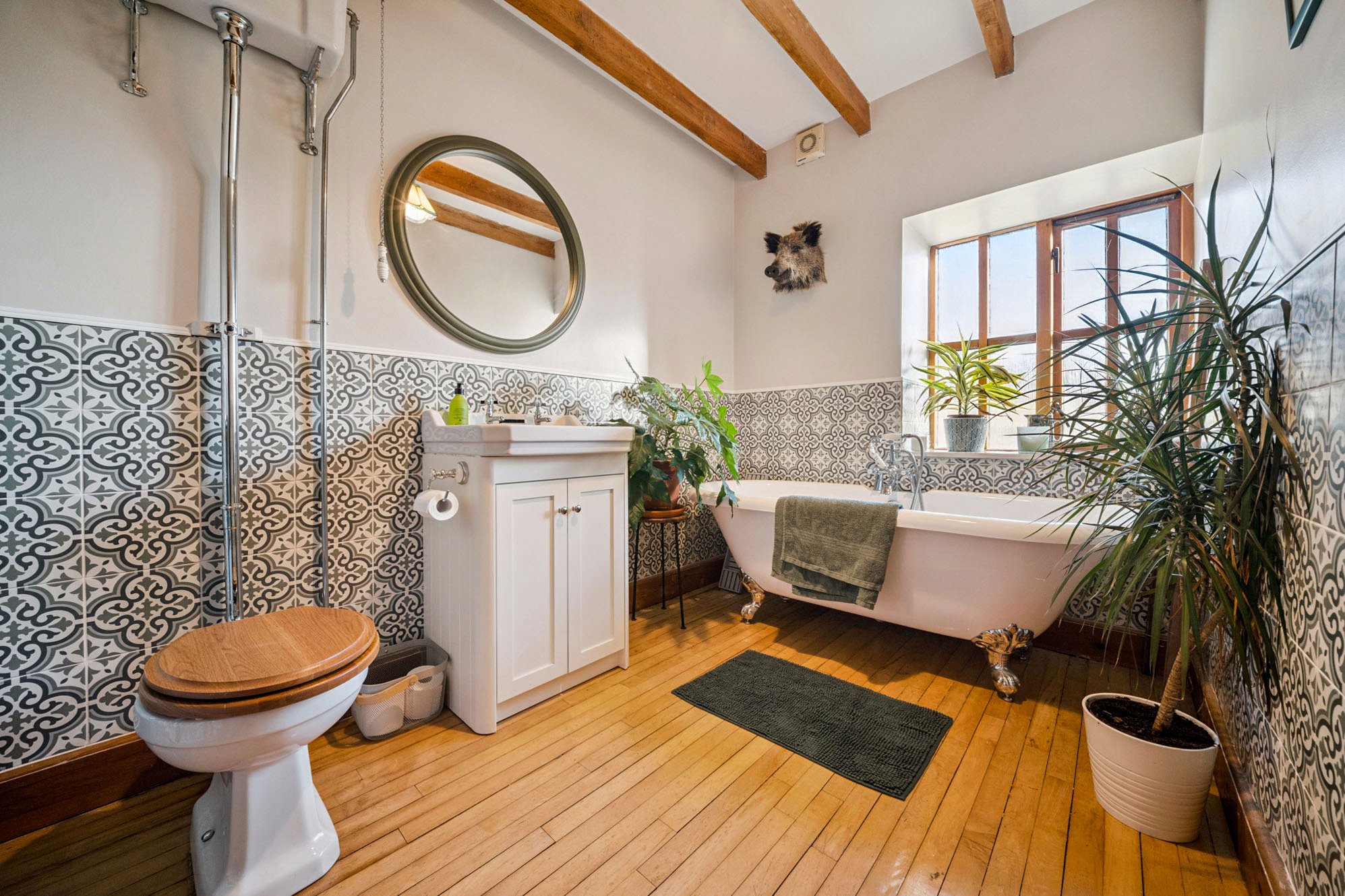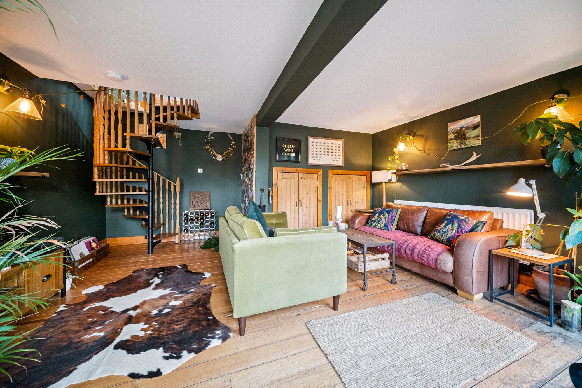 The ground floor comprises a generous dining kitchen with capacious storage, large island and shaker style cabinetry, the main reception hall benefits from a downstairs bathroom with rolltop bathtub and WC, following on there is a generous sitting room with exposed beams and french doors leading to a sunny cobbled courtyard perfect for al-fresco dining or sunbathing. Completing the ground floor is a large mezzanine study which could easily double as a further reception room or a nursery, a spiral staircase leads to a lower public room currently set up as a cosy snug with wood burning stove and double french doors out to the front of the property.