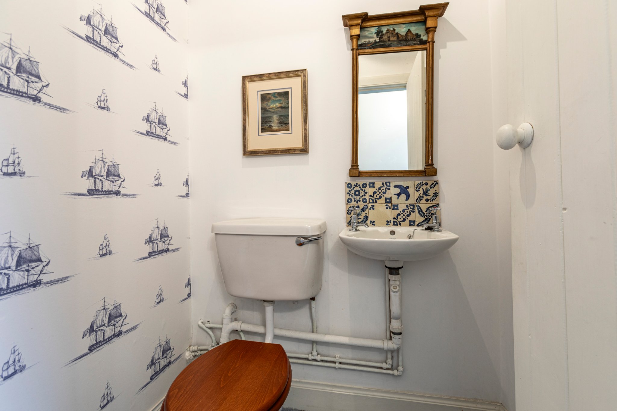 The front door opens into a wide entrance hall, there is a large sitting room with central fireplace and triple aspect windows, coat cupboard and a WC. The well-equipped kitchen boasts AGA cooker. Off the bright hallway, are two good sized double bedrooms, a smaller bedroom currently utilised as a dining room, a main bathroom and a deep storage cupboard. From the kitchen, there is a large timber decked balcony from which the river views and garden are best appreciated.