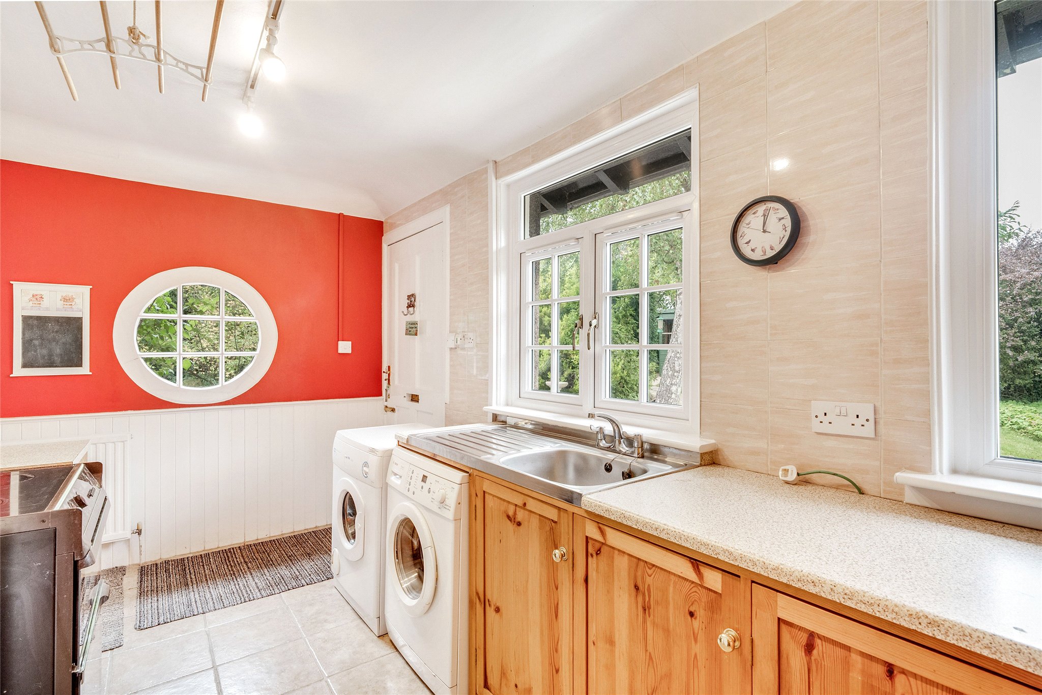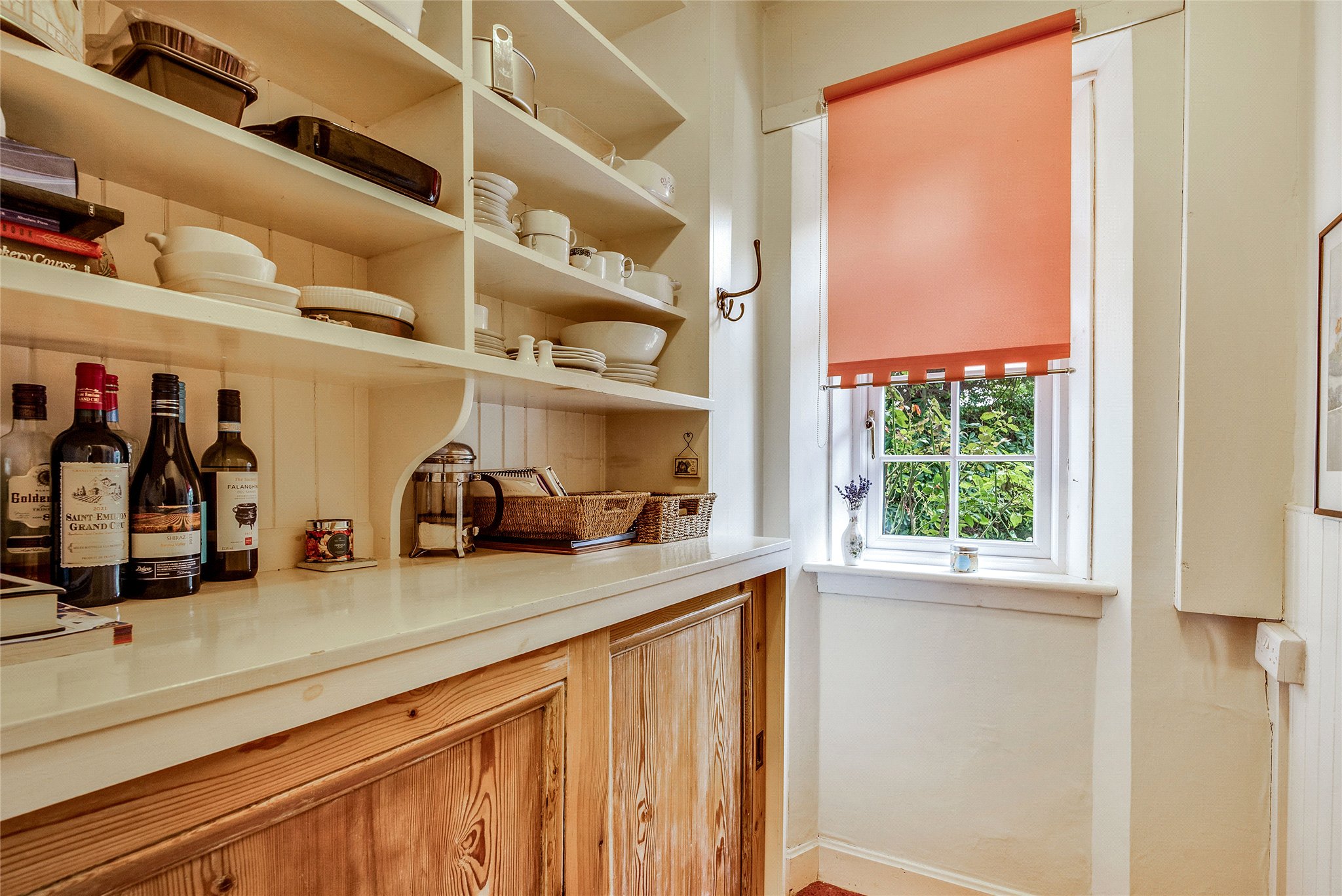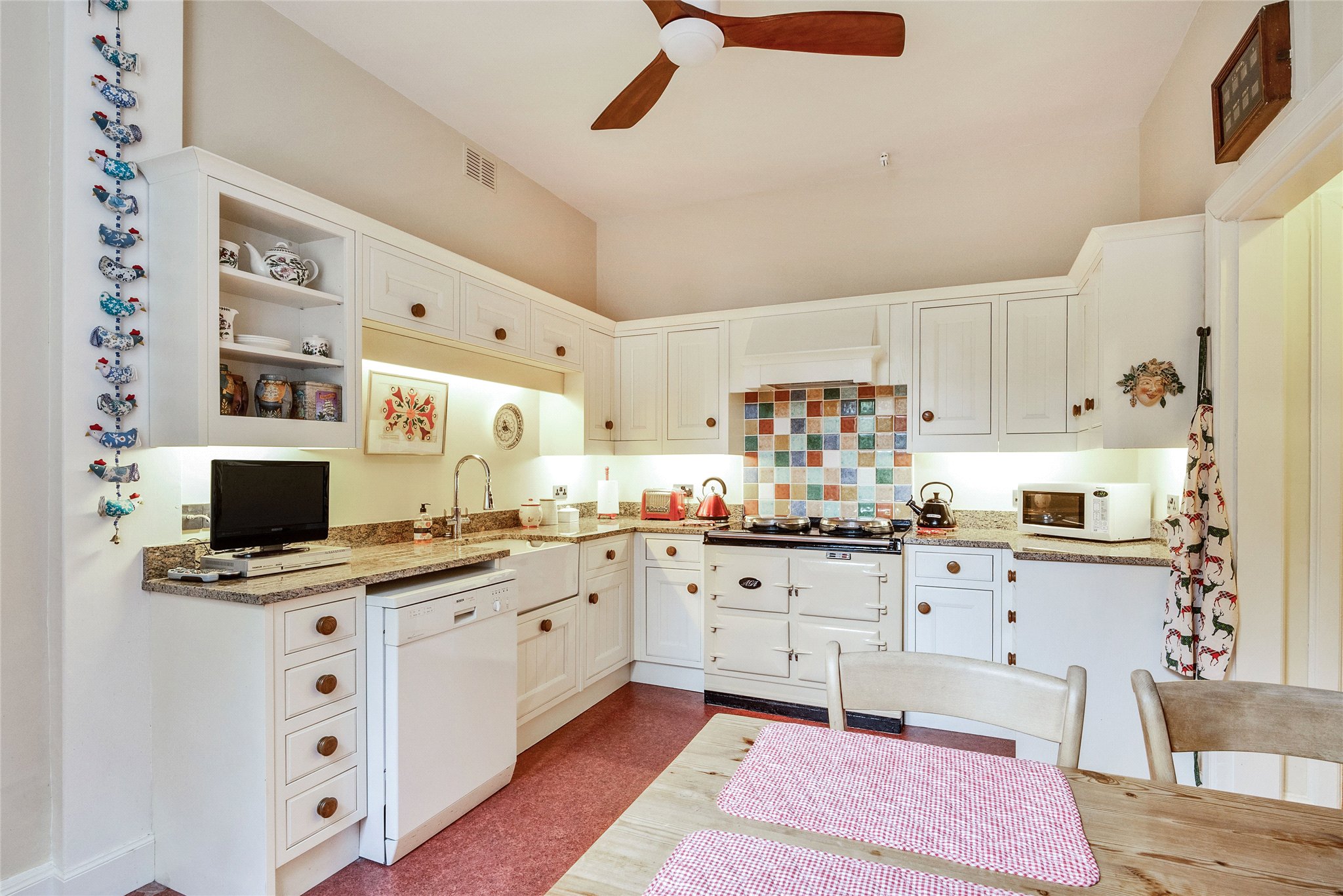 Inside, the ground floor flows naturally from the central hall. A generous lounge and dining area run the length of the house, enhanced by bay windows, lofty 10’ ceilings, original cornicing, and a handsome wood-burning stove. Off the hallway are a cloakroom with WC, a Butler’s pantry, and a wine store. The kitchen, fitted with country-style cabinetry and an AGA, forms a welcoming family hub with room for informal dining and links directly to a large utility/scullery with access to the patio and gardens.