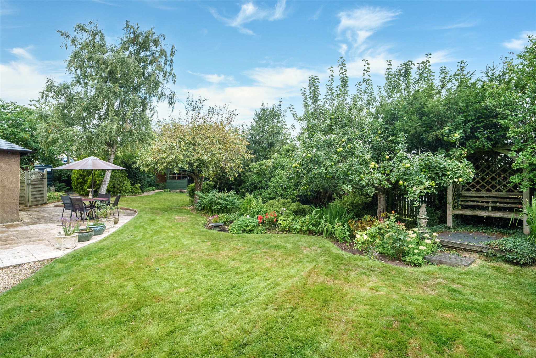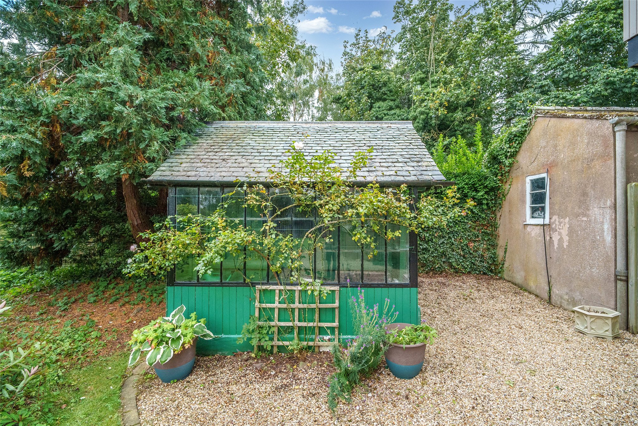 The gardens are a highlight—private, level, and lovingly maintained. They wrap around the house, offering peaceful corners for relaxation along with a large patio, expansive lawn, and established borders of roses, shrubs, and perennials. Additional features include a potting shed, a useful outbuilding for storage, and a colourful wildflower bed.